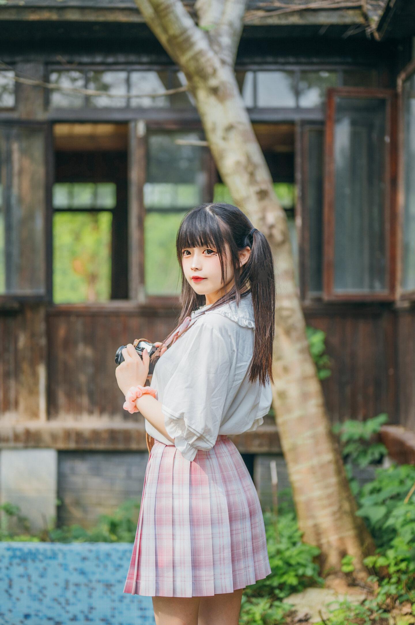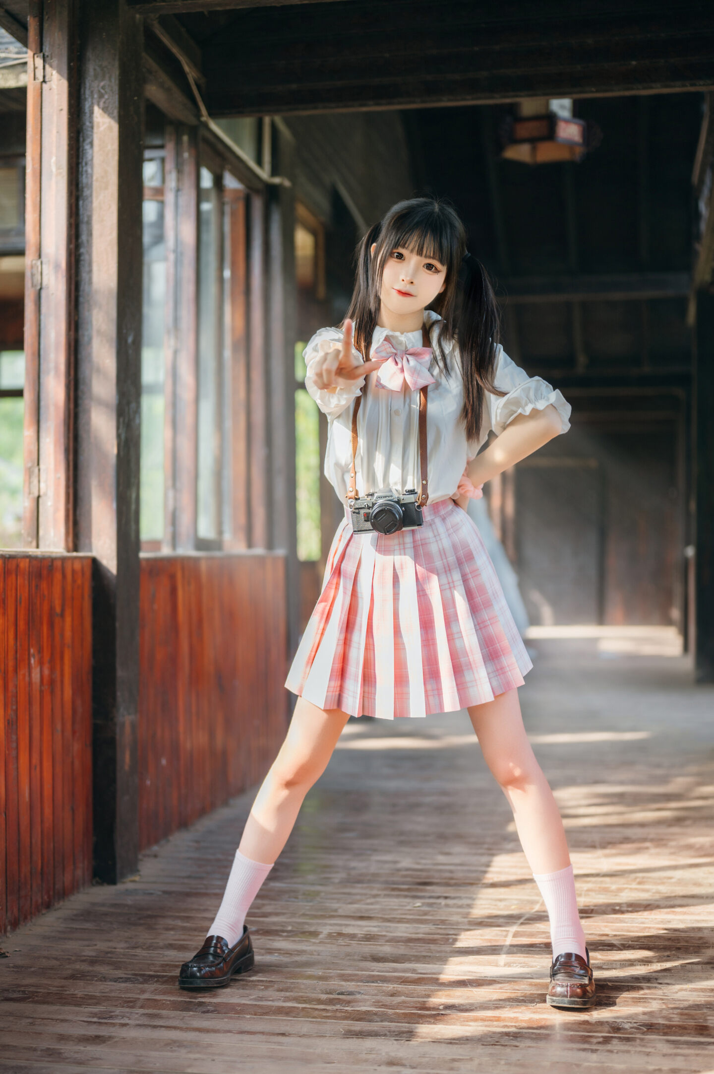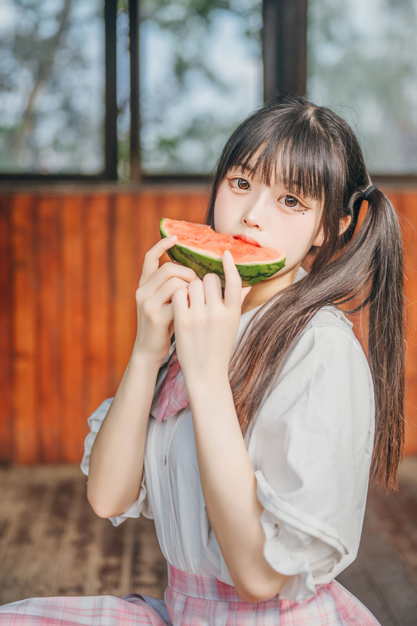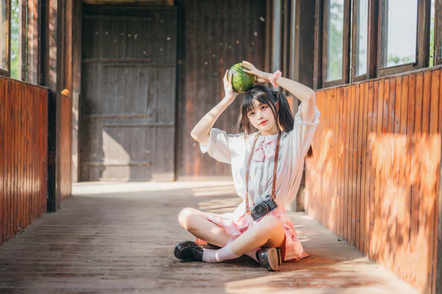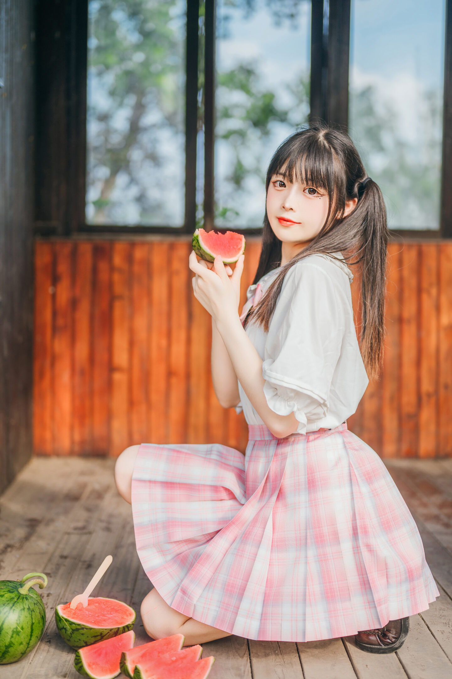 夏日主题摄影作品中,模特@小奶糕Milky身着"樱莓小酿"粉白格裙,在木质窗棂透入的阳光下演绎纳凉场景。双马尾少女跪坐于地,双手捧半块西瓜专注舀食,慵懒神情与光影交织,生动诠释标题"热死我"的体感氛围。摄影师@柒柒天天是逗比通过室内自然光与生活化构图,将夏日闷热与解暑愉悦凝结于画面。