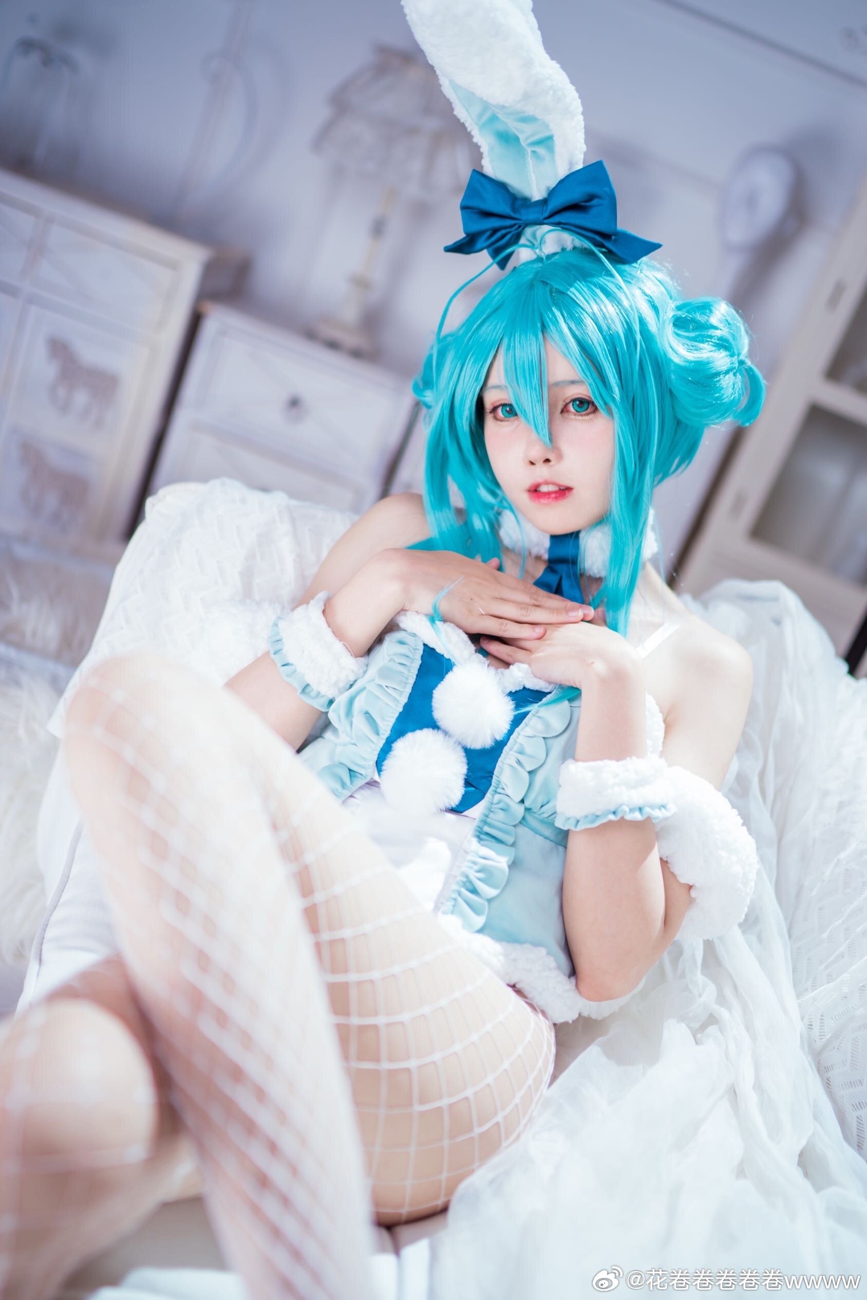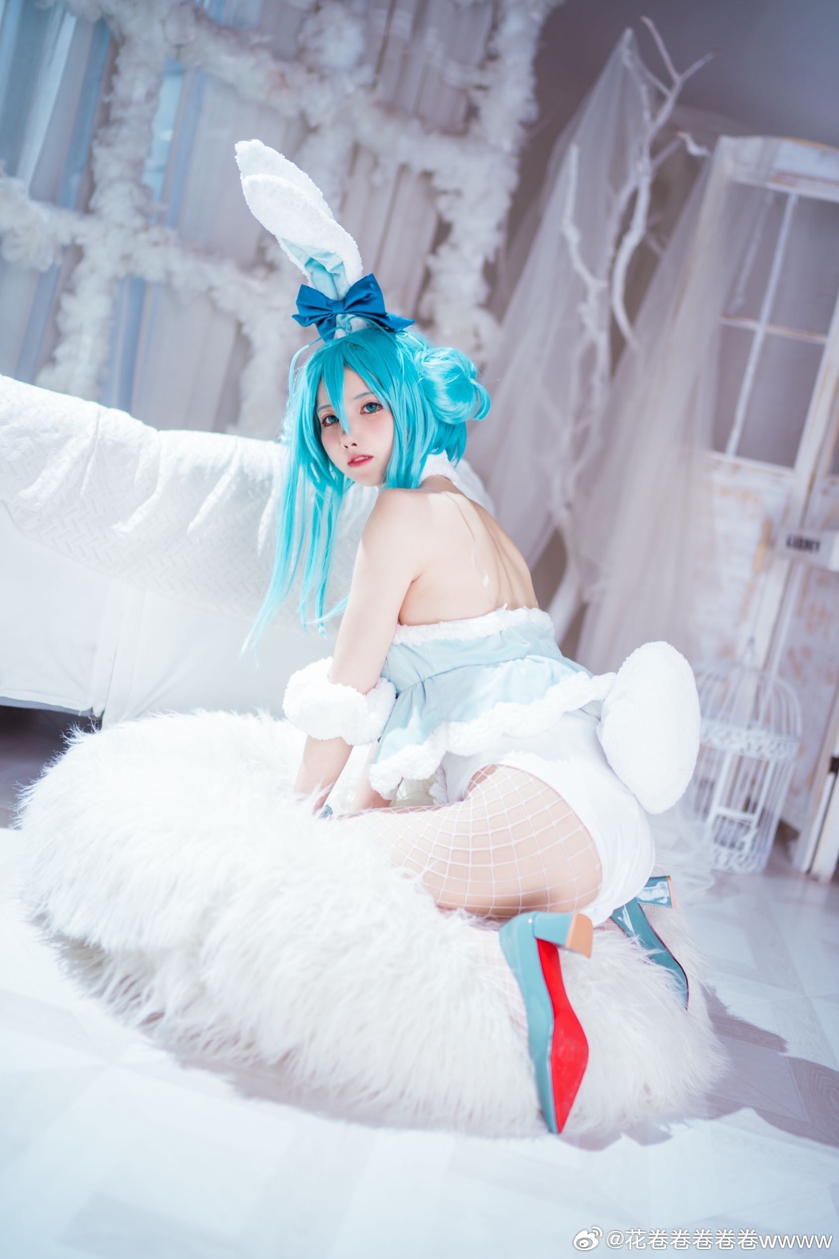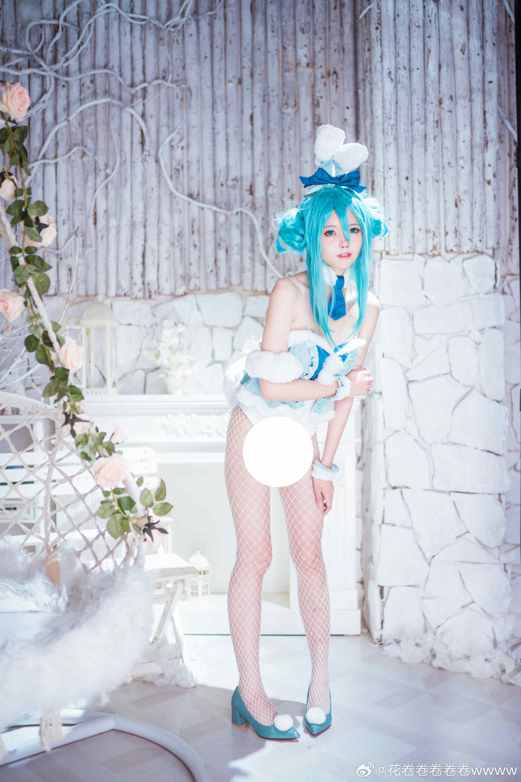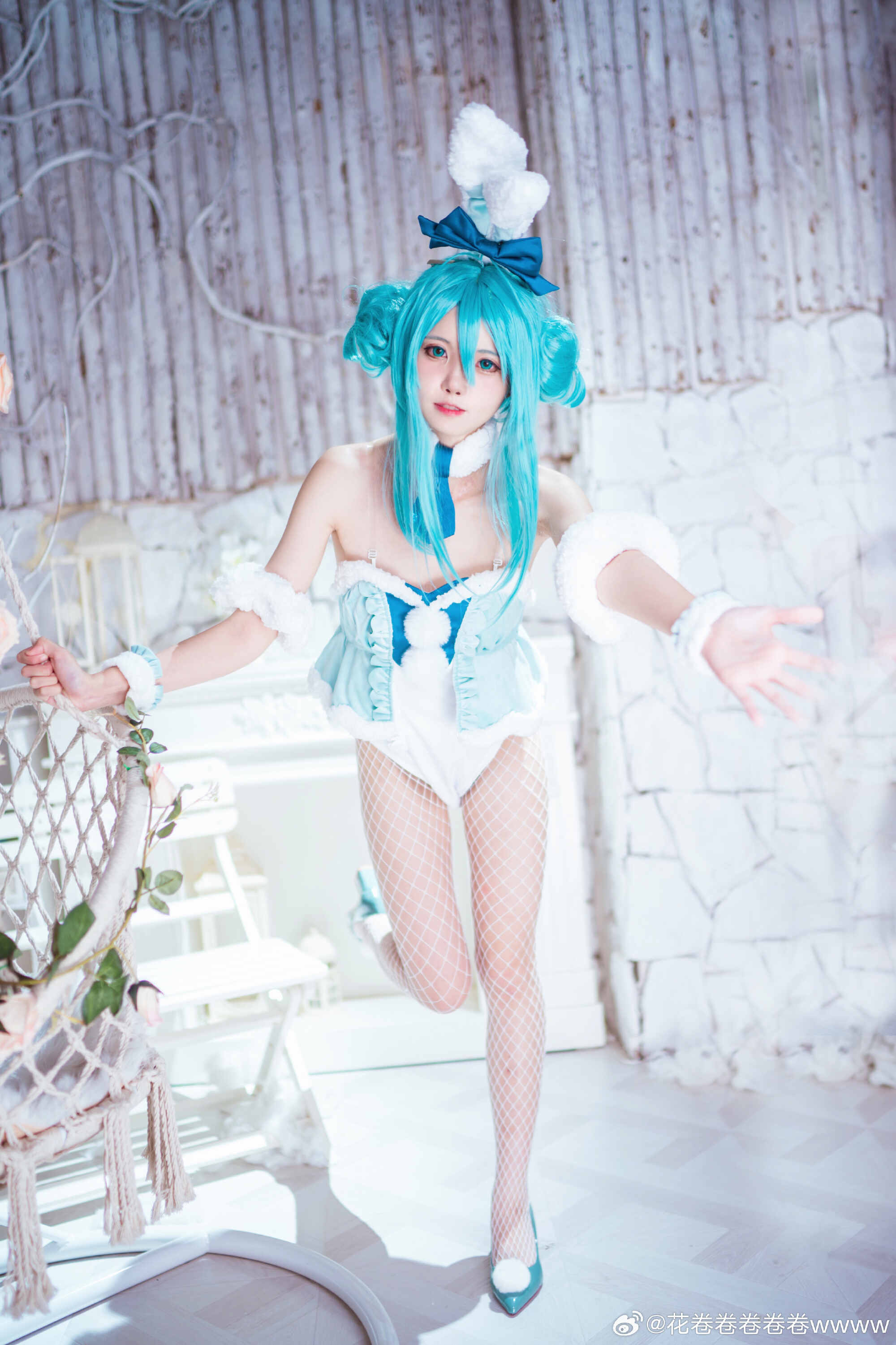 文章展示了一张初音未来白兔女郎主题的cosplay照片,coser@花卷卷卷卷卷wwww身着蓝发双马尾配蝴蝶结头饰、白色露肩短裙与网袜、脚踩蓝白高跟鞋,面带微笑侧身站立于浅色木纹墙与花藤装饰背景中,营造梦幻氛围。摄影师为@裂空桑,后勤支持由@夜夜泡在奶茶里提供,并感谢夜夜妈妈。该形象呼应标题“超大份快乐”主题,旨在传递活泼愉悦感。