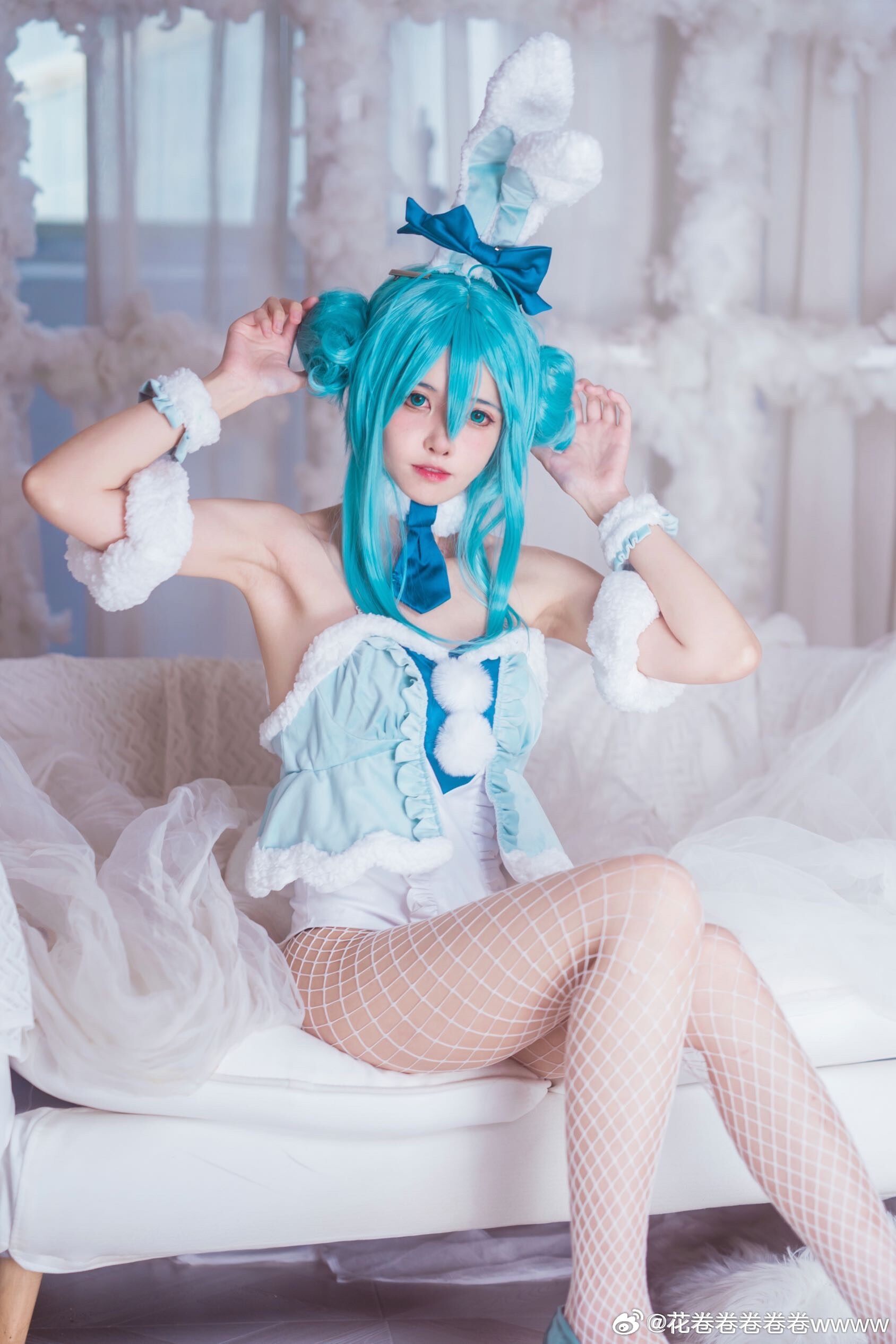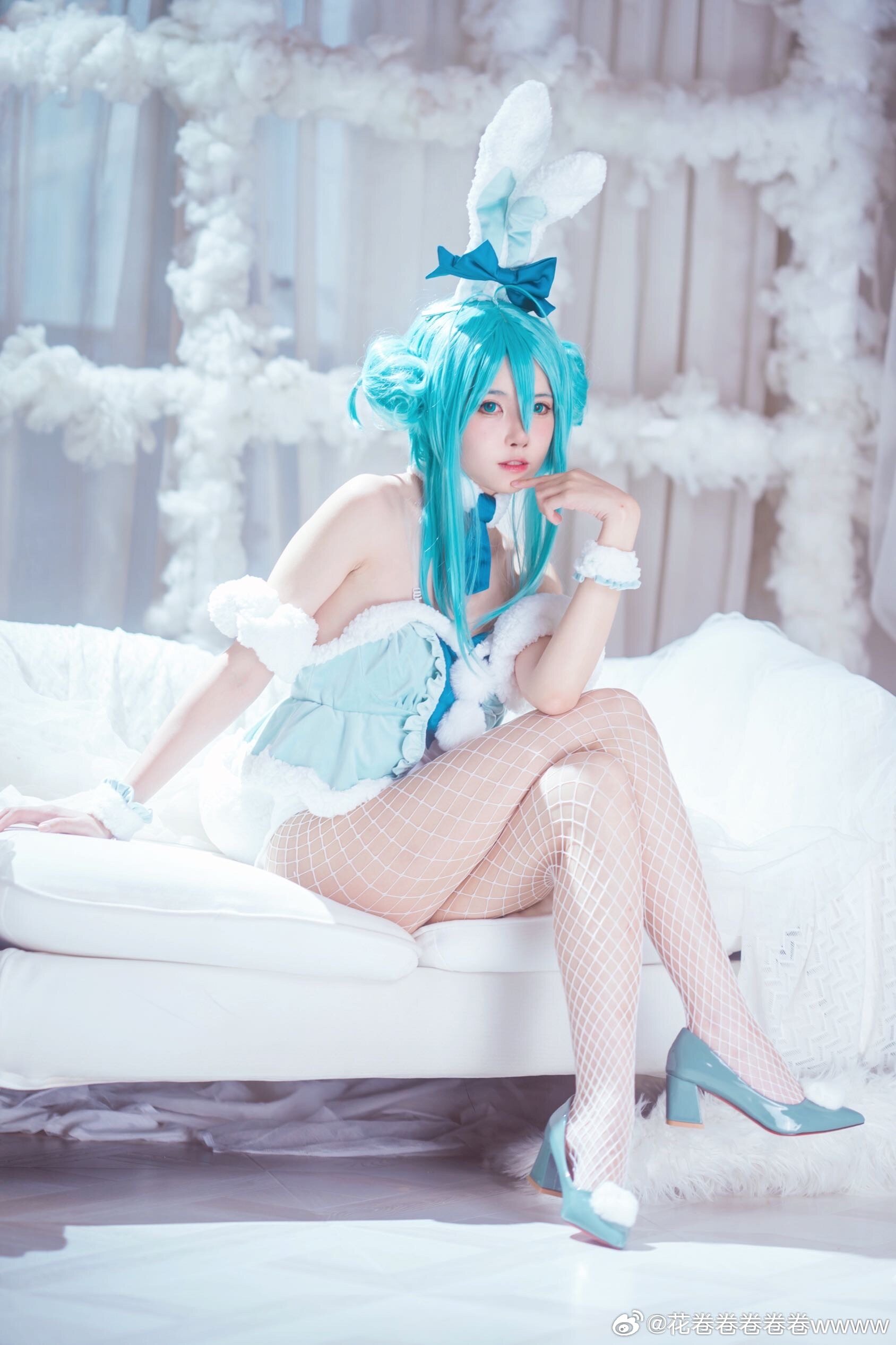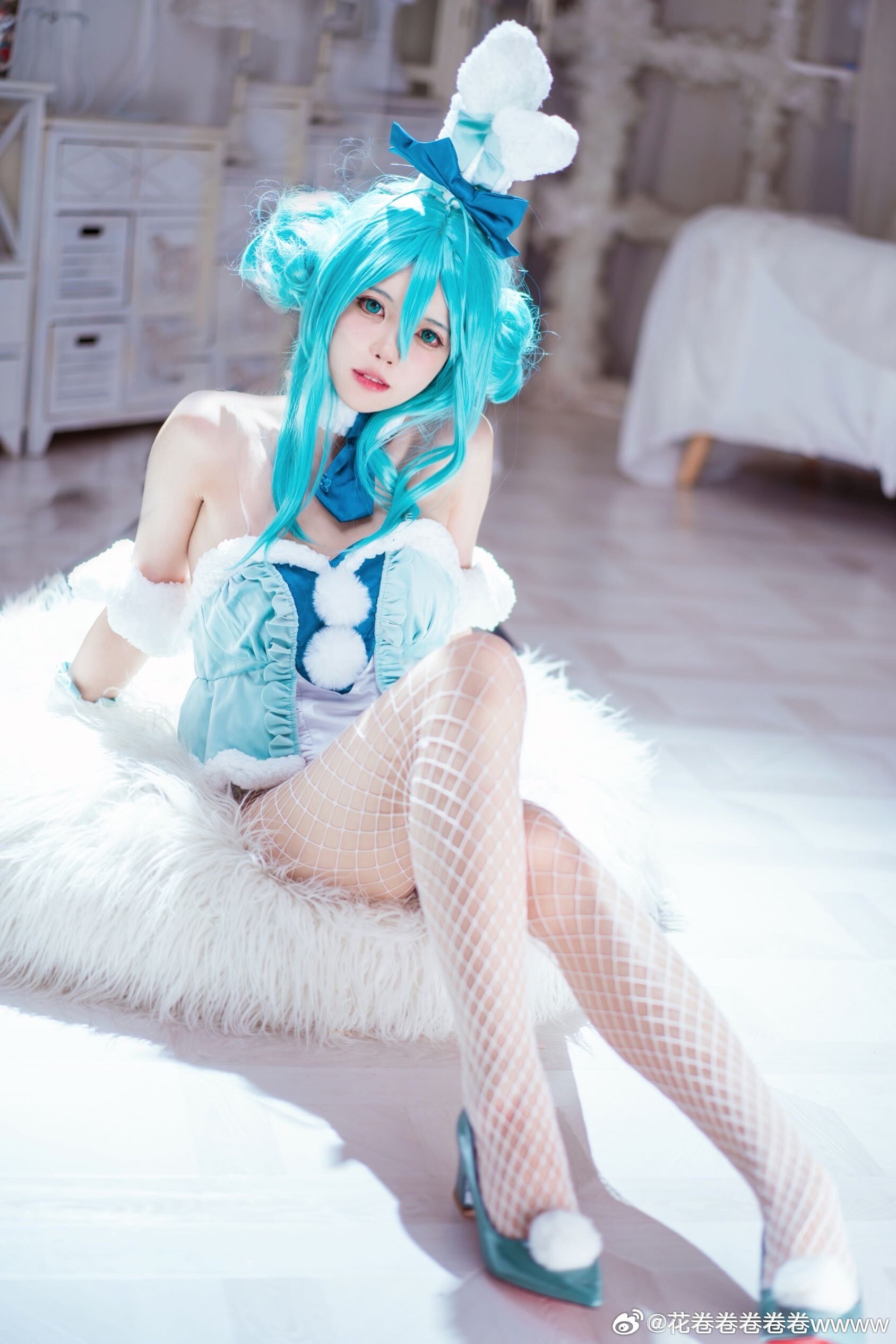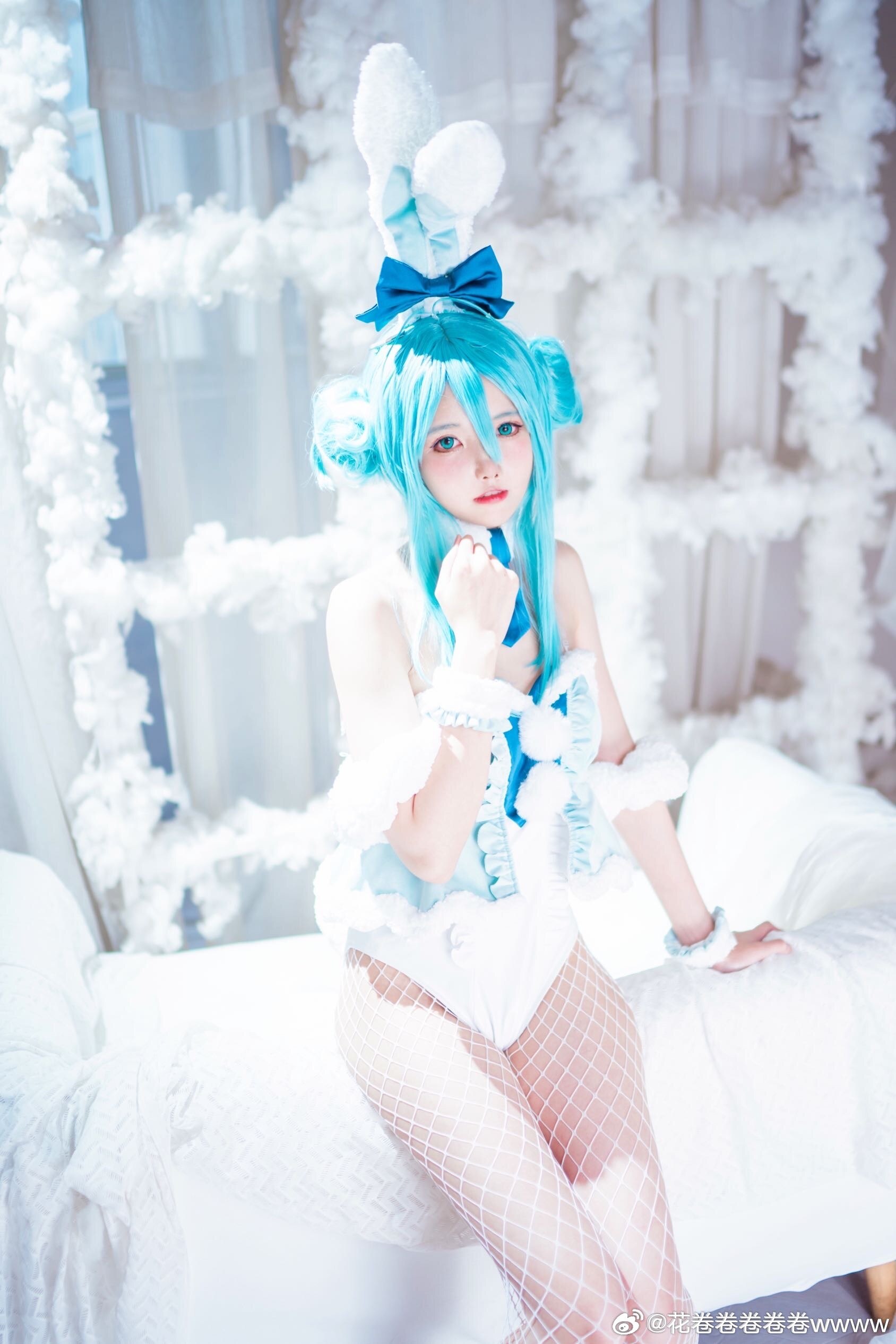 文章展示了一张初音未来白兔女郎主题的cosplay照片,coser@花卷卷卷卷卷wwww身着蓝发双马尾配蝴蝶结头饰、白色露肩短裙与网袜、脚踩蓝白高跟鞋,面带微笑侧身站立于浅色木纹墙与花藤装饰背景中,营造梦幻氛围。摄影师为@裂空桑,后勤支持由@夜夜泡在奶茶里提供,并感谢夜夜妈妈。该形象呼应标题“超大份快乐”主题,旨在传递活泼愉悦感。
