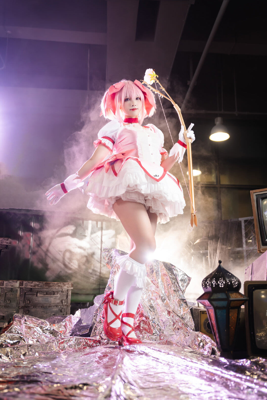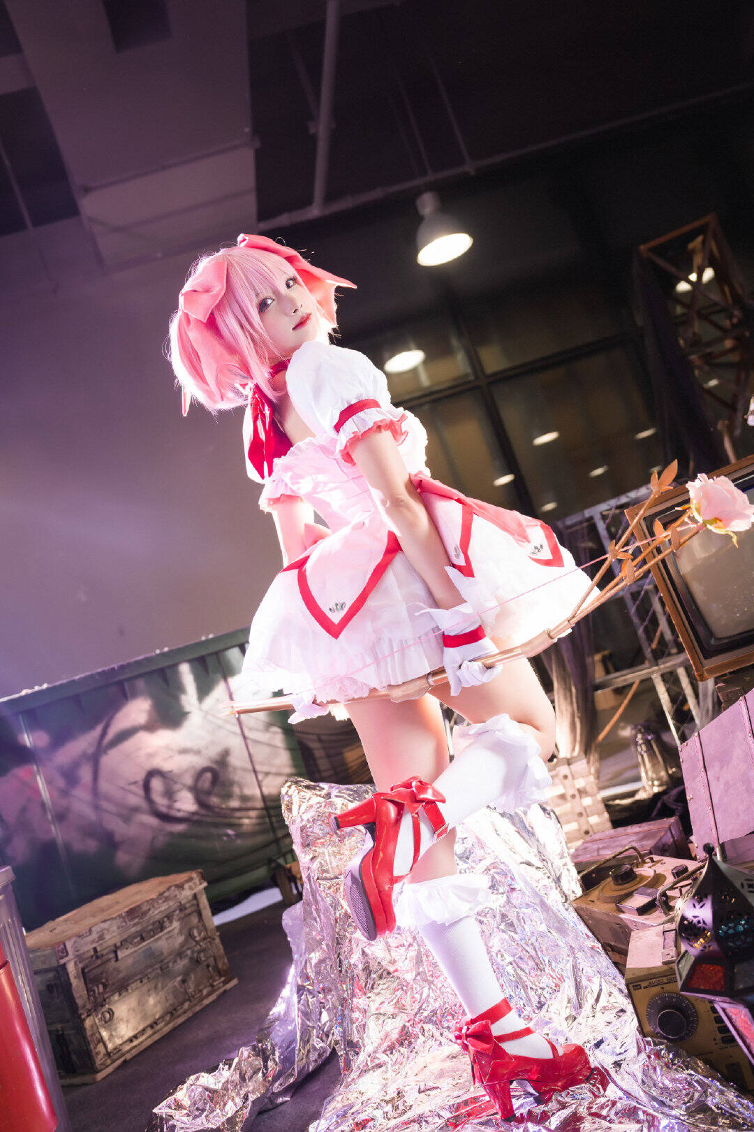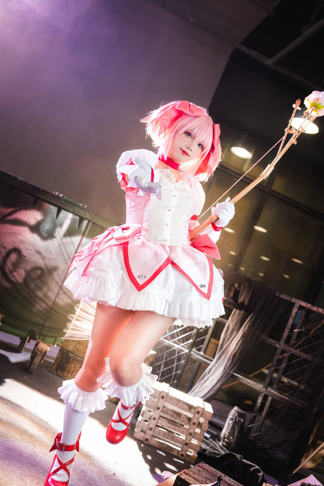 文章展示了一张萤火虫场照返图05,主题为《魔法少女小圆》中鹿目圆的cosplay。图片中,coser@兔子兔子兔w身着白红魔法少女裙装,粉发齐肩,手持花杖,面带微笑抬头跃动,姿态轻盈。背景模糊,凸显主体。画面呼应标题“抬起头在更热烈的风里相遇吧”,营造积极、充满希望的迎风氛围,仿佛角色正奔赴热烈相遇。灯光由@Nanlite南光提供,化妆由@二号机-401负责。