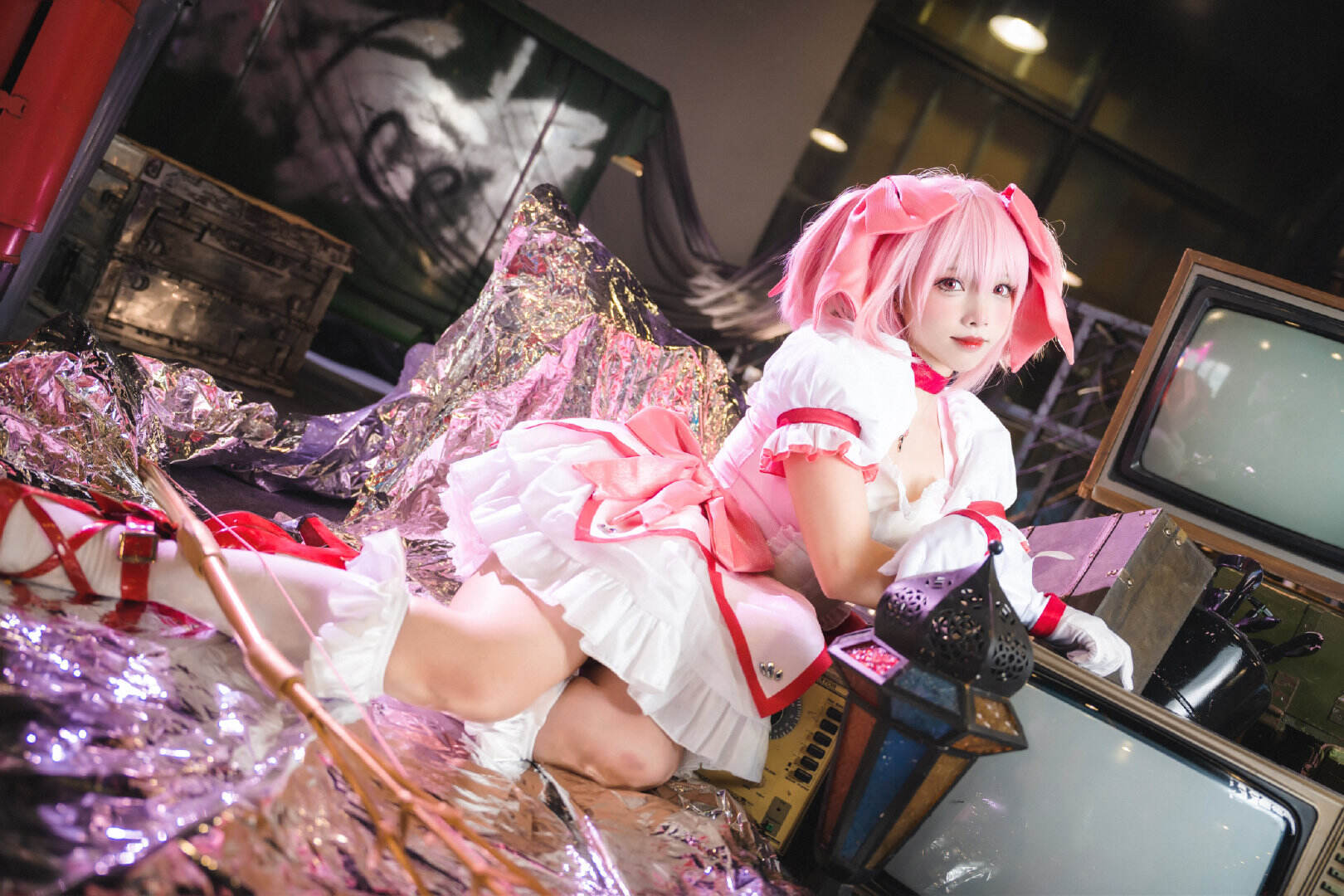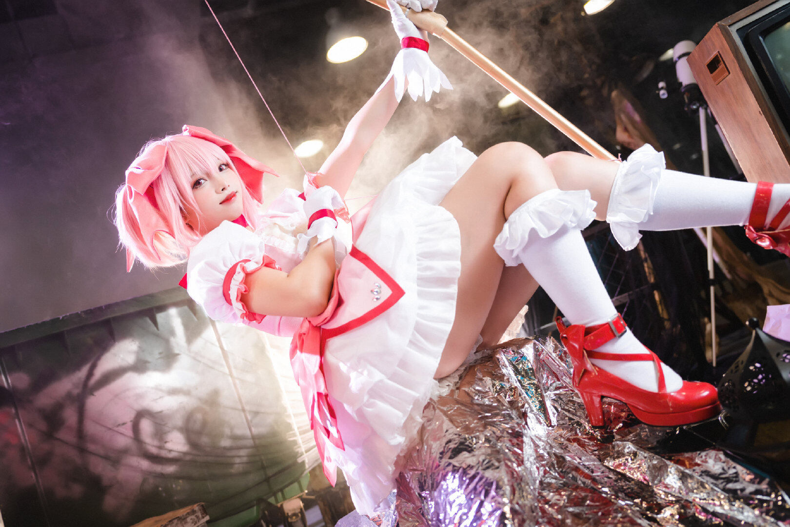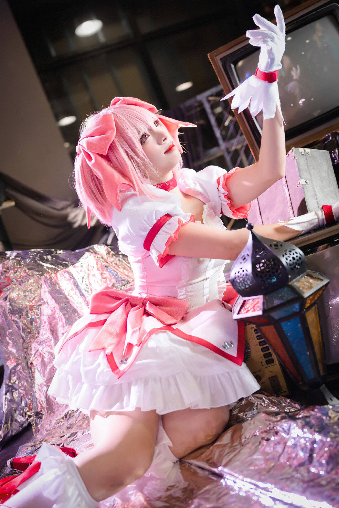 文章展示了一张萤火虫场照返图05,主题为《魔法少女小圆》中鹿目圆的cosplay。图片中,coser@兔子兔子兔w身着白红魔法少女裙装,粉发齐肩,手持花杖,面带微笑抬头跃动,姿态轻盈。背景模糊,凸显主体。画面呼应标题“抬起头在更热烈的风里相遇吧”,营造积极、充满希望的迎风氛围,仿佛角色正奔赴热烈相遇。灯光由@Nanlite南光提供,化妆由@二号机-401负责。