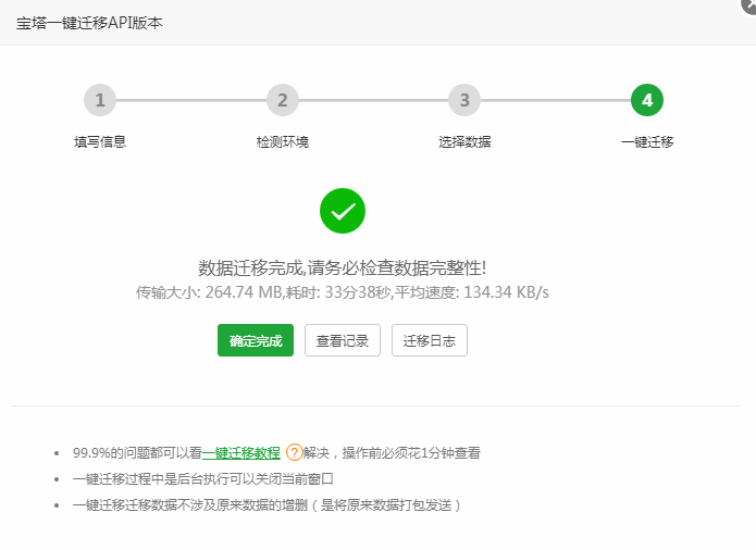 8、等待数据迁移完成,若提示迁移失败,则建议您查看迁移日志,并参考提示信息处理对应问题。问题解决后,再重新执行迁移步骤。迁移成功如下图所示: