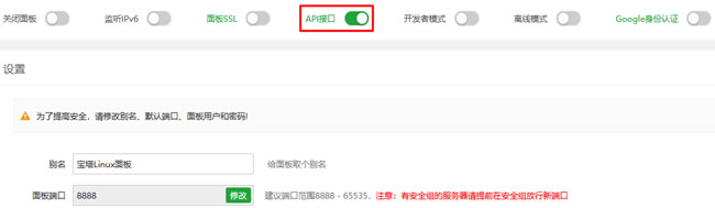 2、选择左侧菜单栏中的【面板设置】,并在设置页面中开启 API 接口。如下图所示: