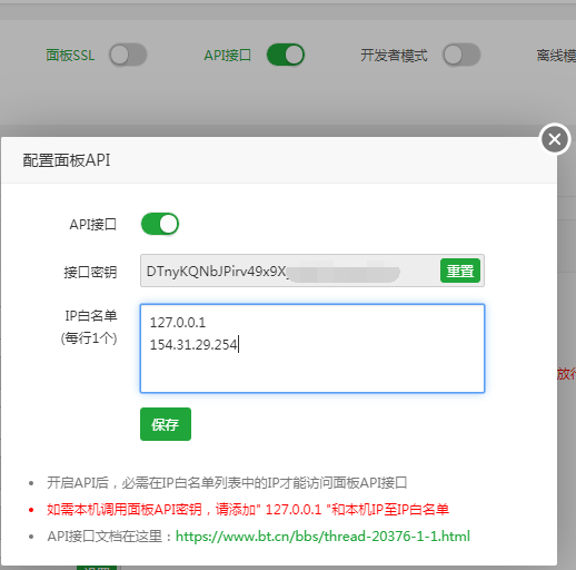 3、在弹出的“配置面板API” 窗口中,记录好接口密钥,将需迁出服务器的公网 IP /内网IP地址加入 IP 白名单中,单击【保存】。如下图所示: