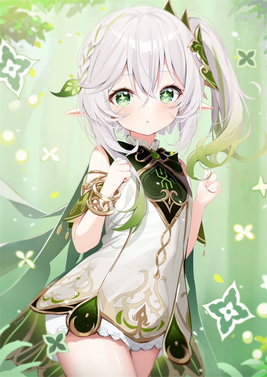 本文介绍插画师Deyui デユイ创作的一幅插画作品,主体为游戏《原神》角色纳西妲。角色拥有银白色长发、绿色眼眸,头戴绿叶装饰,身着白绿相间服饰,手持缠绕藤蔓的法杖,姿态优雅,面带温和微笑。背景以生机勃勃的绿色植物与光斑渲染,营造自然宁静氛围。作品通过视觉语言呼应标题“在喜欢自己的人身上用心,在不喜欢自己的人身上健忘”的意境,展现了喜爱视角下的角色美好形象。