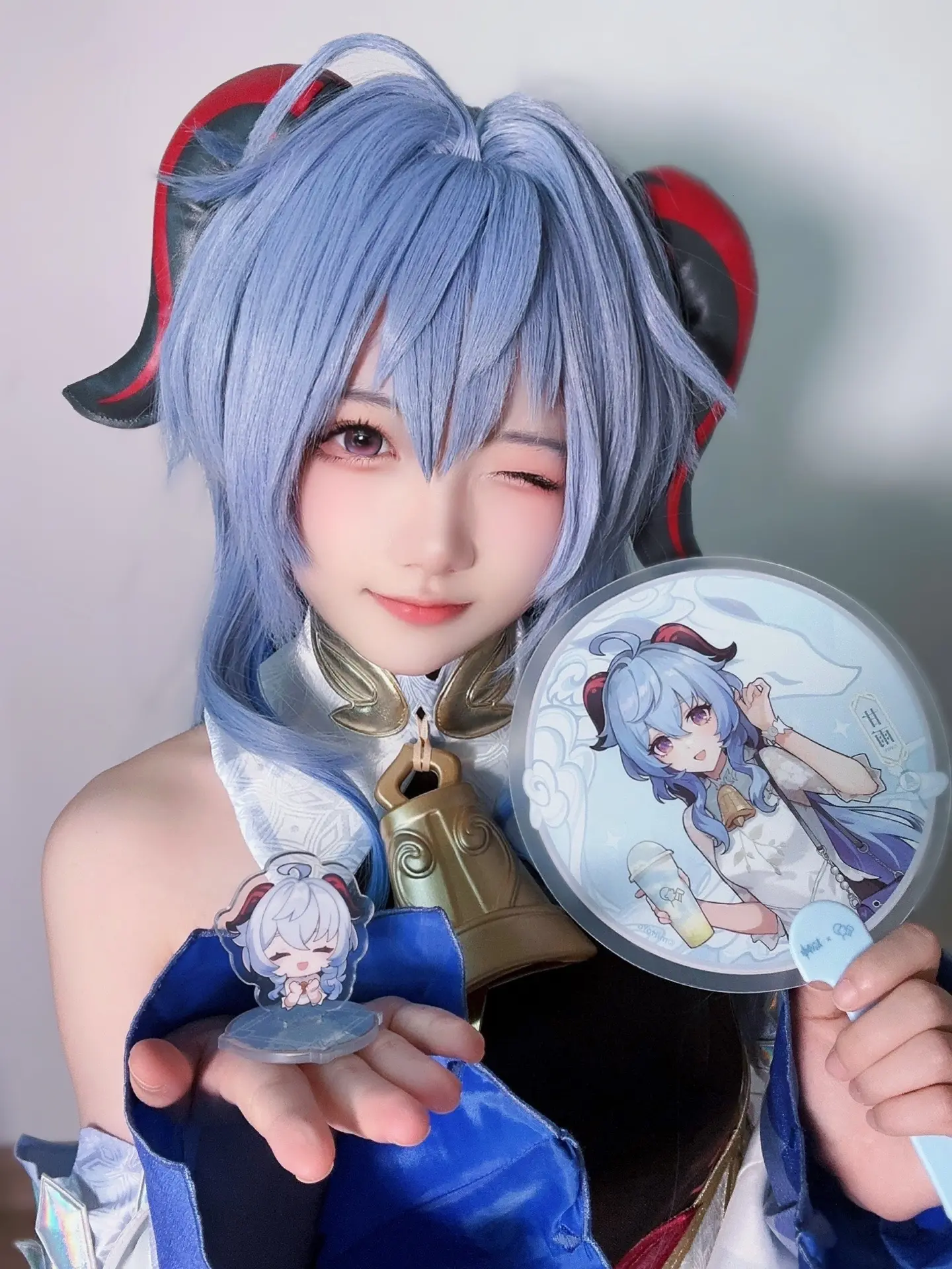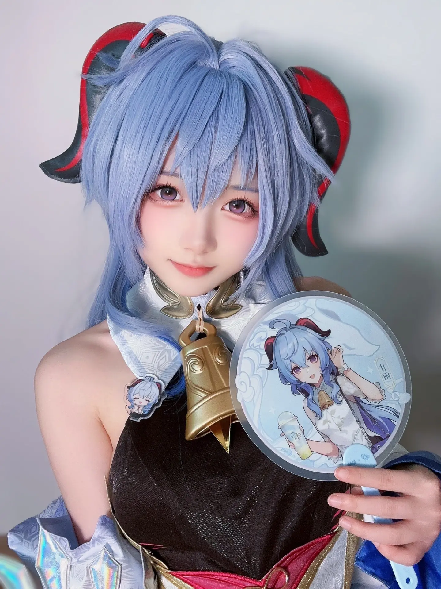 文章介绍了一位cosplayer对游戏《原神》角色七七的生动扮演。cosplayer身高150厘米,体重78斤,通常于下午2点拍摄。图片展示她拥有浅蓝色双马尾发型,头戴红黑相间的角状发饰,身着深色服装并装饰金色铃铛,手持一把绘有同款角色形象的圆形扇子,面带微笑注视镜头。整体造型高度还原游戏设定,呼应了标题中“旅行者”的元素,营造出角色互动的氛围,体现了cosplay的还原度与艺术表现力。