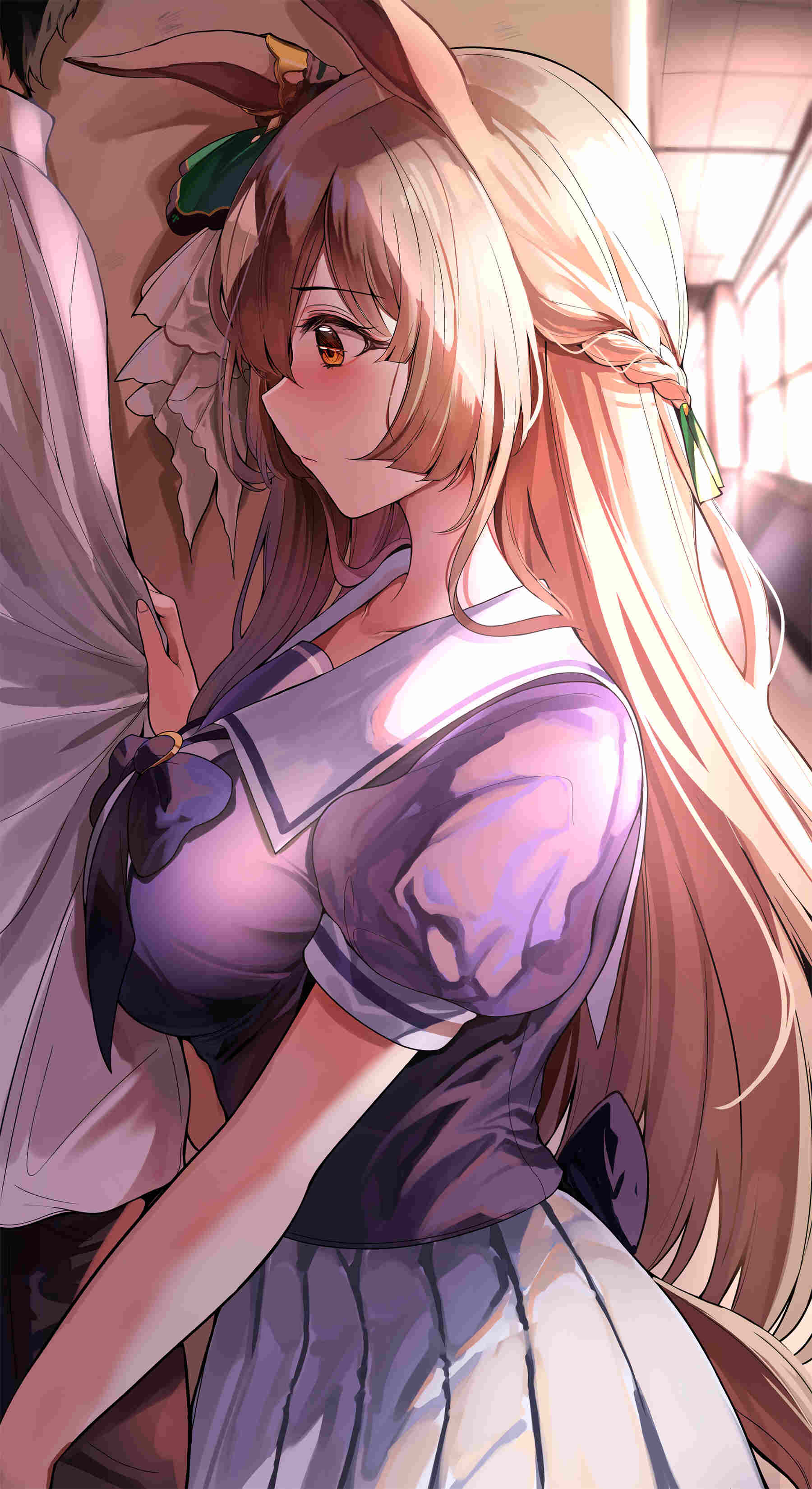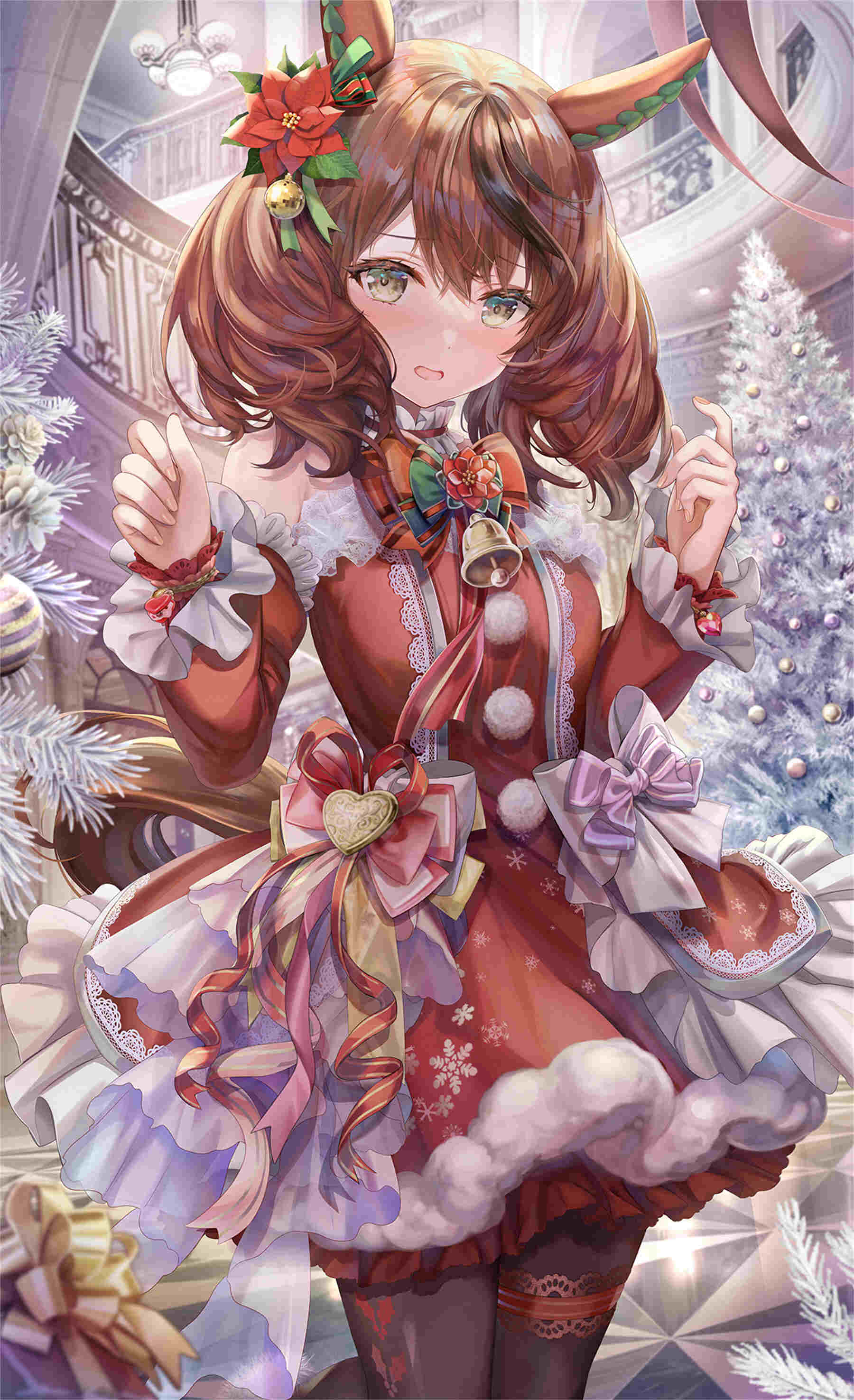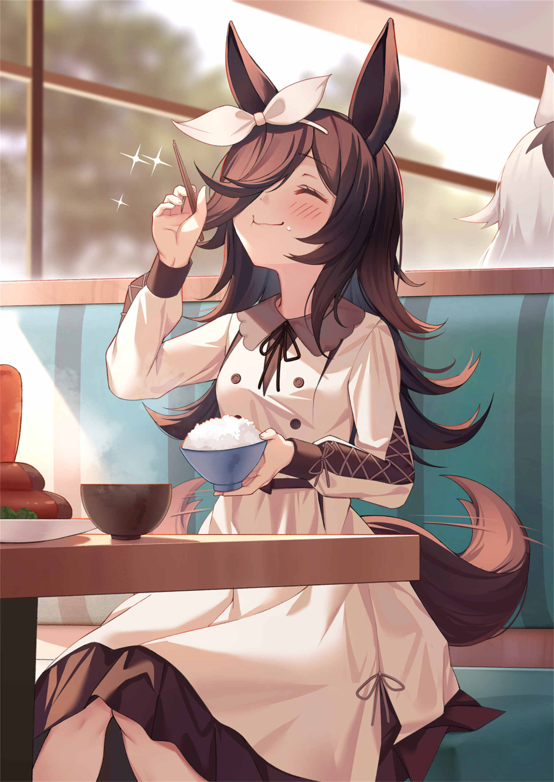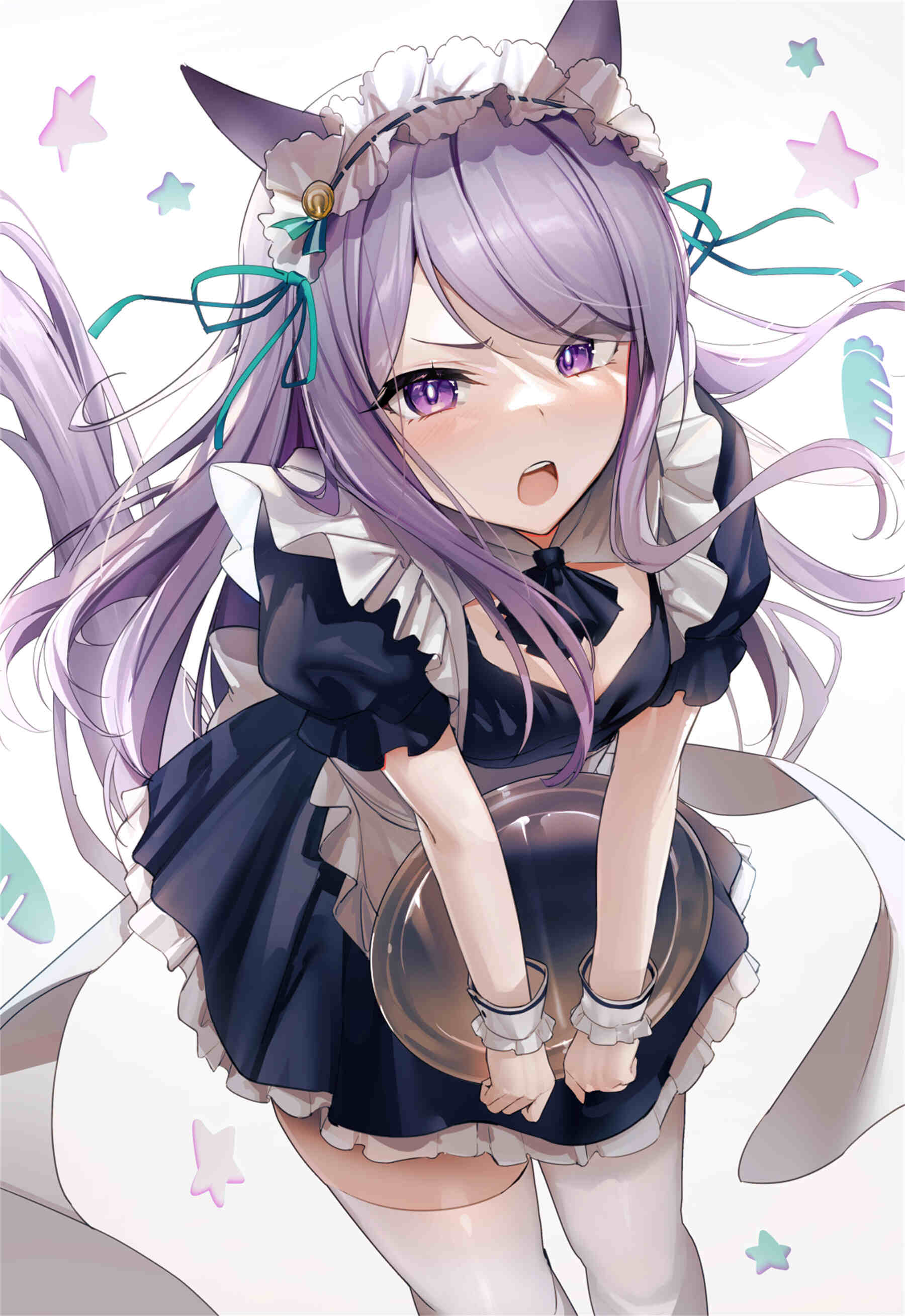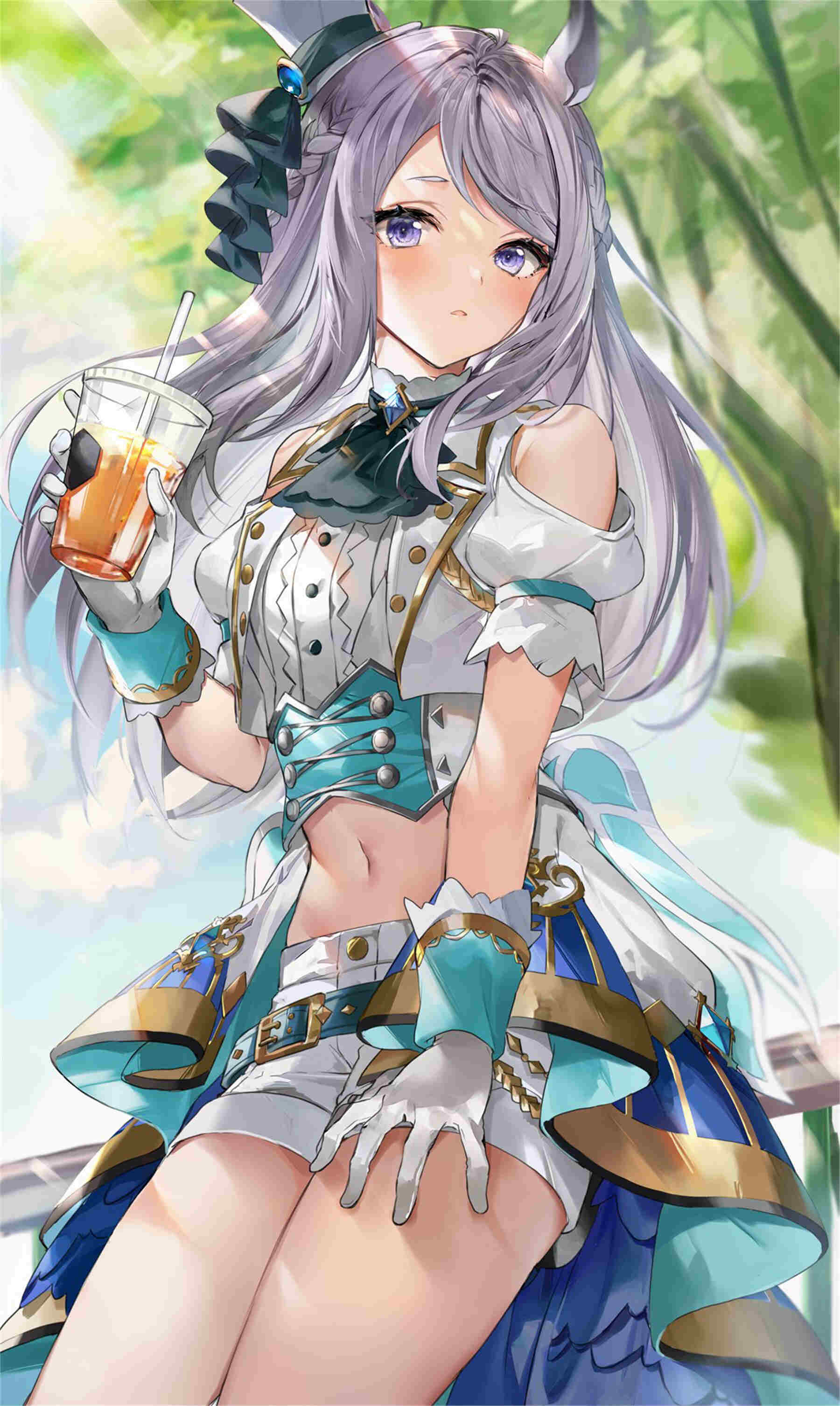 -画面元素:角色形象细节(银发兽耳装饰手持饮品等)