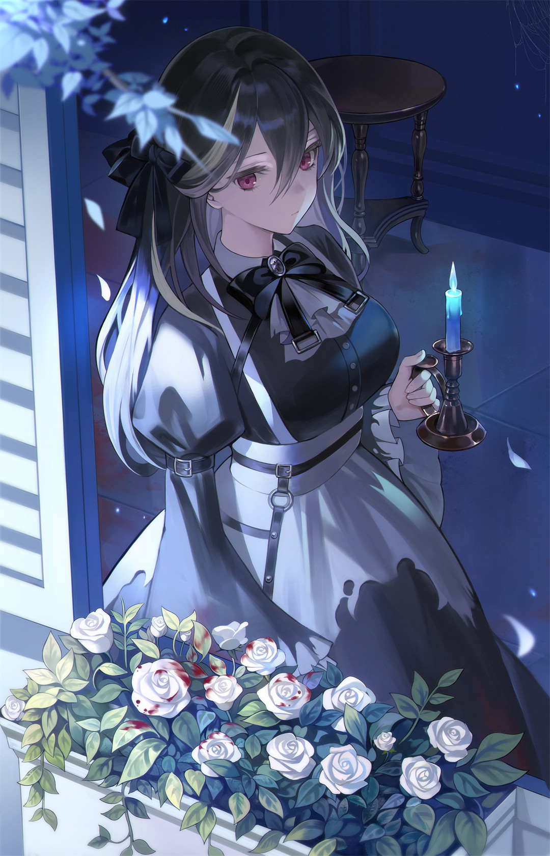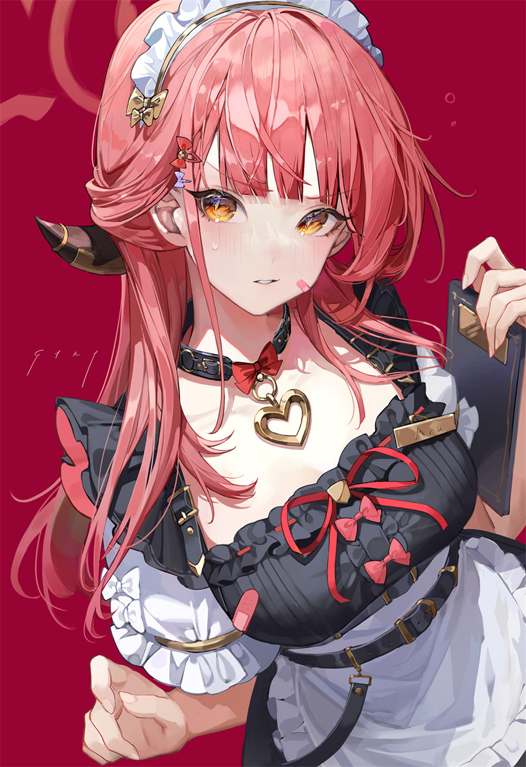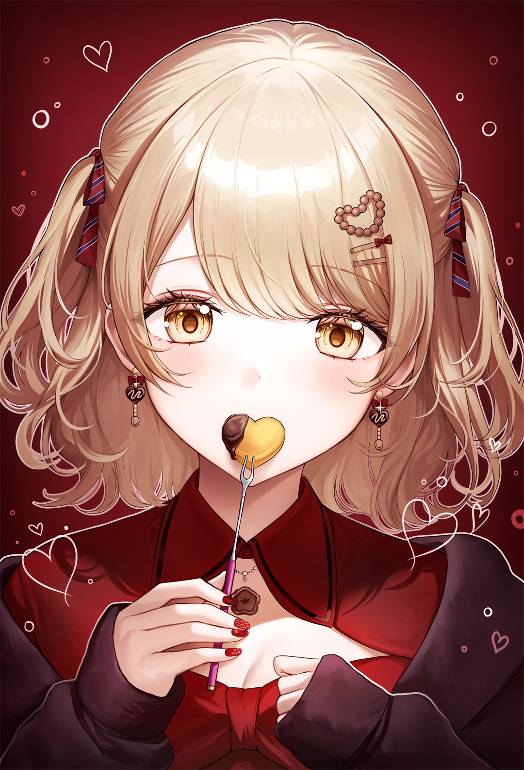这幅动漫风格的插画壁纸展现了温馨宁静的主题。画中描绘一位金发双马尾少女,她拥有金色长发、刘海和明亮的棕色眼眸,表情温柔恬静。少女身穿红色上衣,正用叉子将心形巧克力送入口中,动作轻柔。背景采用深红色调,点缀着白色爱心和圆点,营造出浪漫甜蜜的氛围。整体画面传递出安宁与温柔的感受,完美呼应标题所强调的发现和珍惜生活中安静角落的核心情感。
