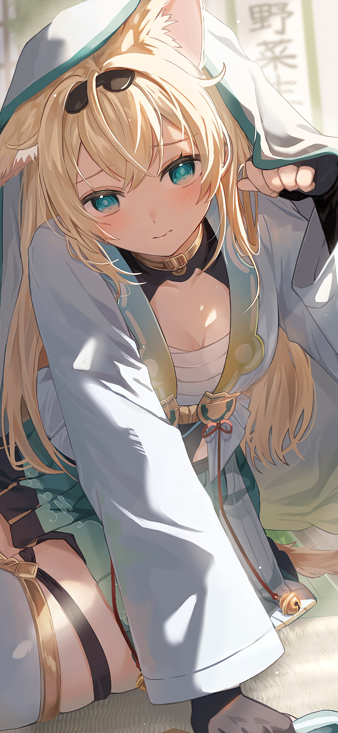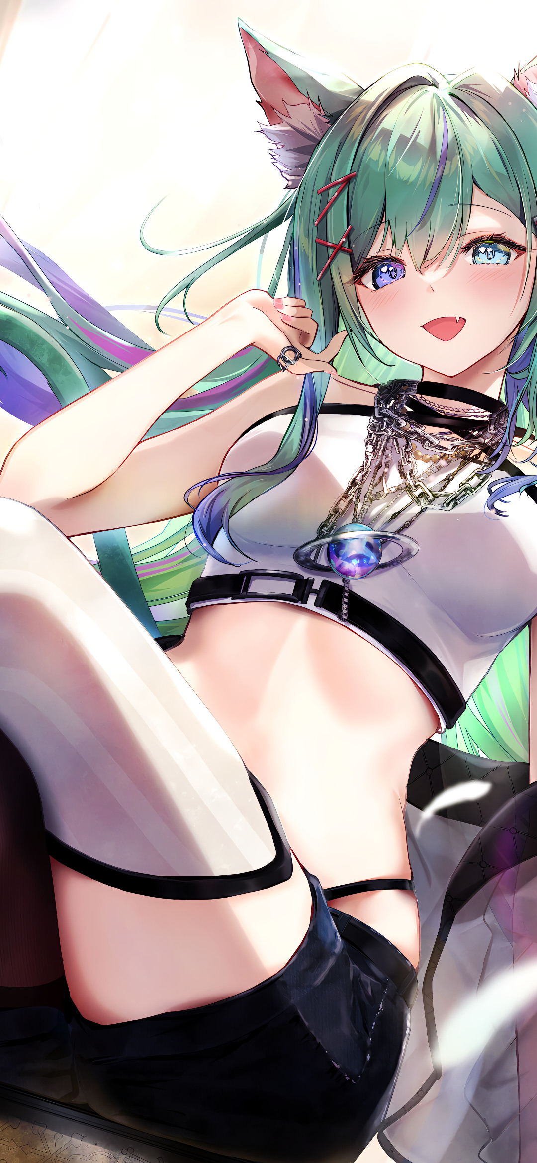 文章呈现一幅动漫角色插画,核心为一位绿发蓝瞳、长有猫耳的女性角色,身着白色上衣与黑色短裤,表情温柔带笑,姿态亲昵地轻触脸颊。画面背景虚化,突出人物外貌与科幻风格服饰,整体氛围柔和魅力。图像呼应标题《无论我变得如何强大,你依然是我的弱点》的情感主题,表达强大外表下仍存留柔软与依恋。涉及角色包括崩坏、符玄、花火、早濑优香和雪花拉米。
