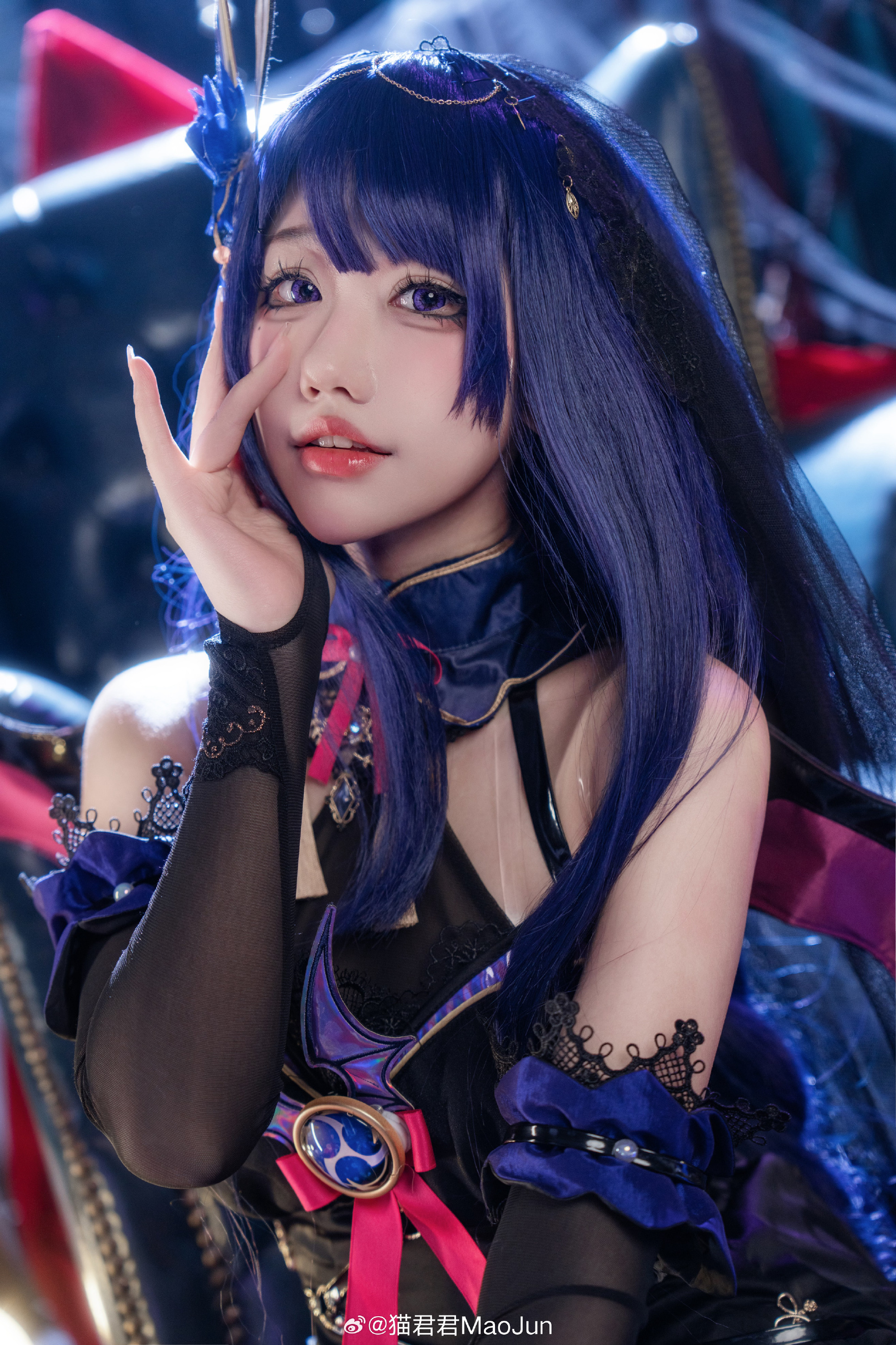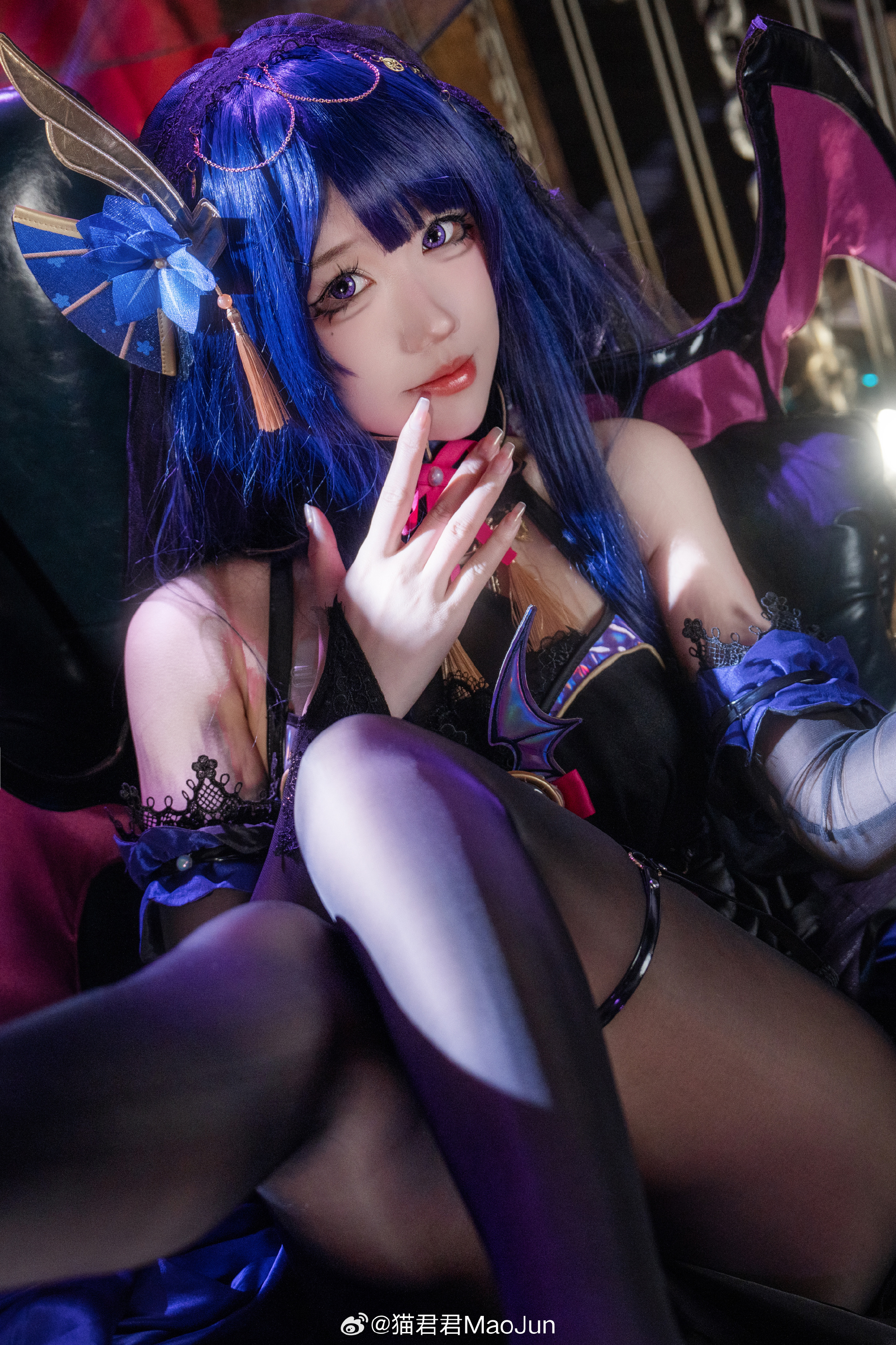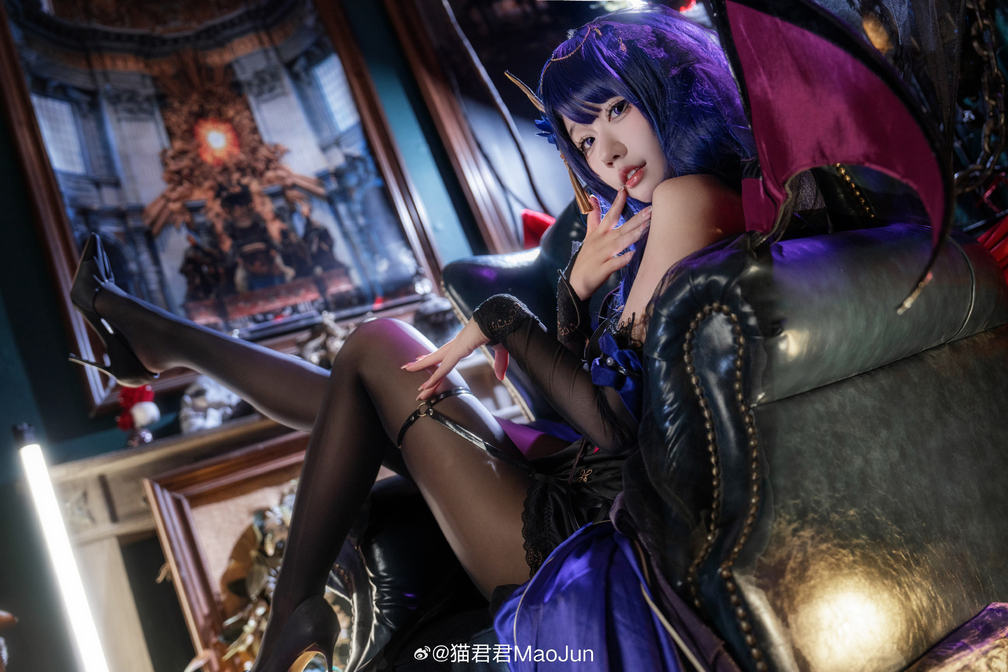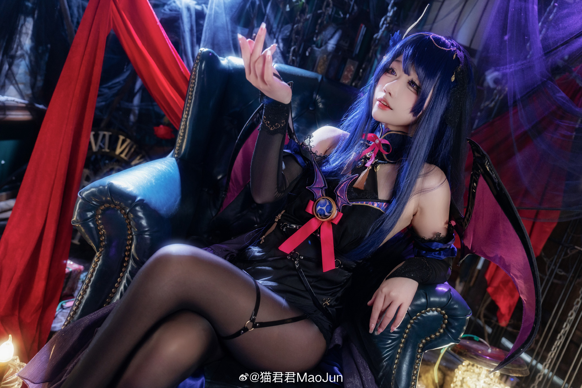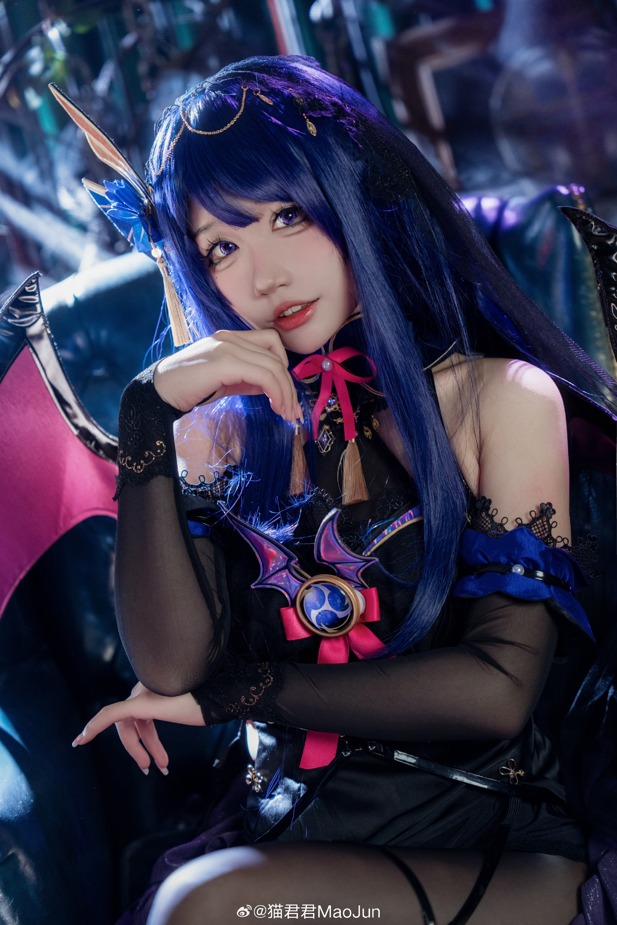 本文展示了一组角色扮演主题摄影作品,呈现召唤魅魔的奇幻氛围。内容以"啊~是你召唤的魅魔嘛?"、"我的主人?"等对话体现角色互动核心设定。出镜者为@猫君君MaoJun,摄影由@芔驫物_可见度30负责。文末特别提及对雷电将军魅魔设定不接受者的歉意。