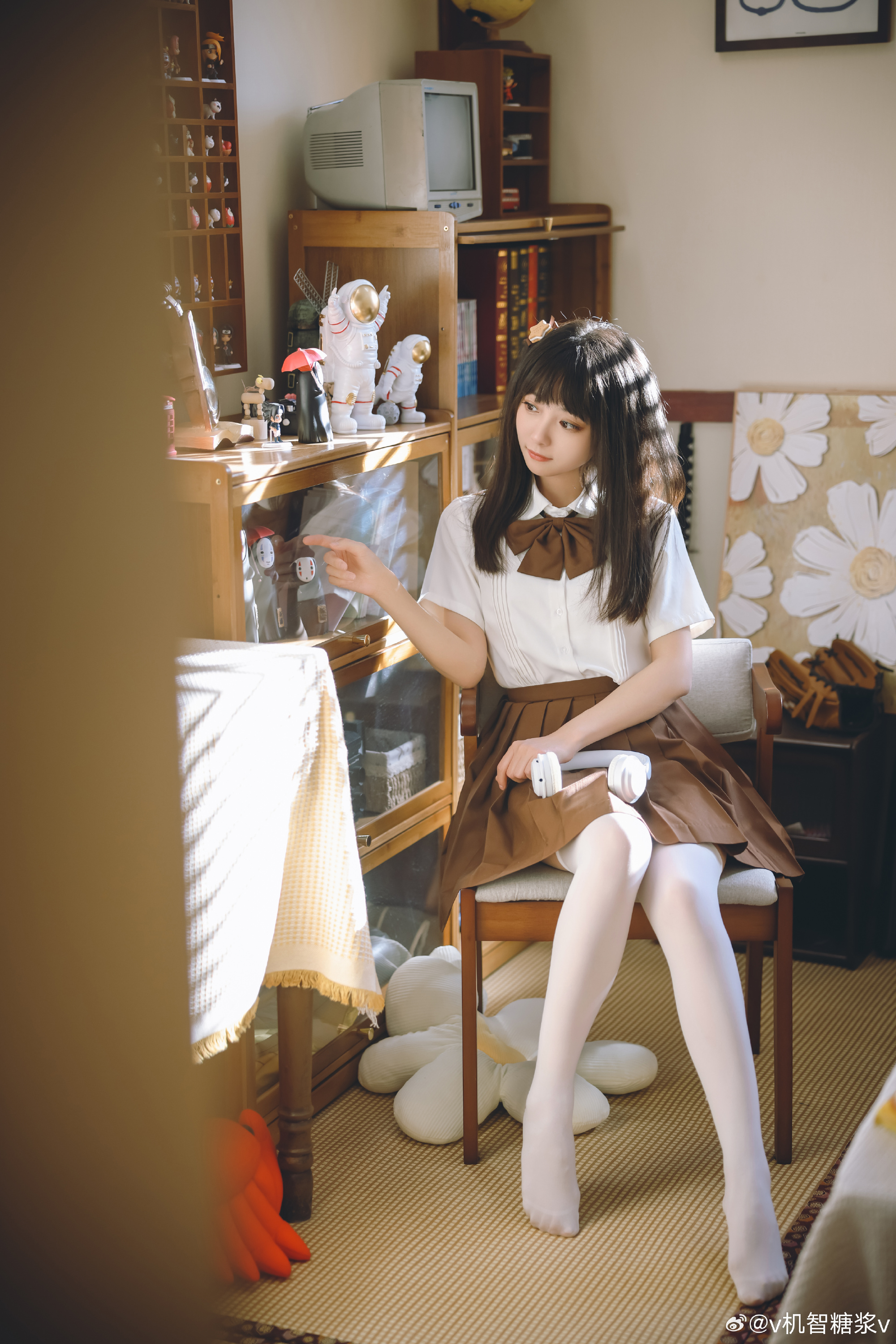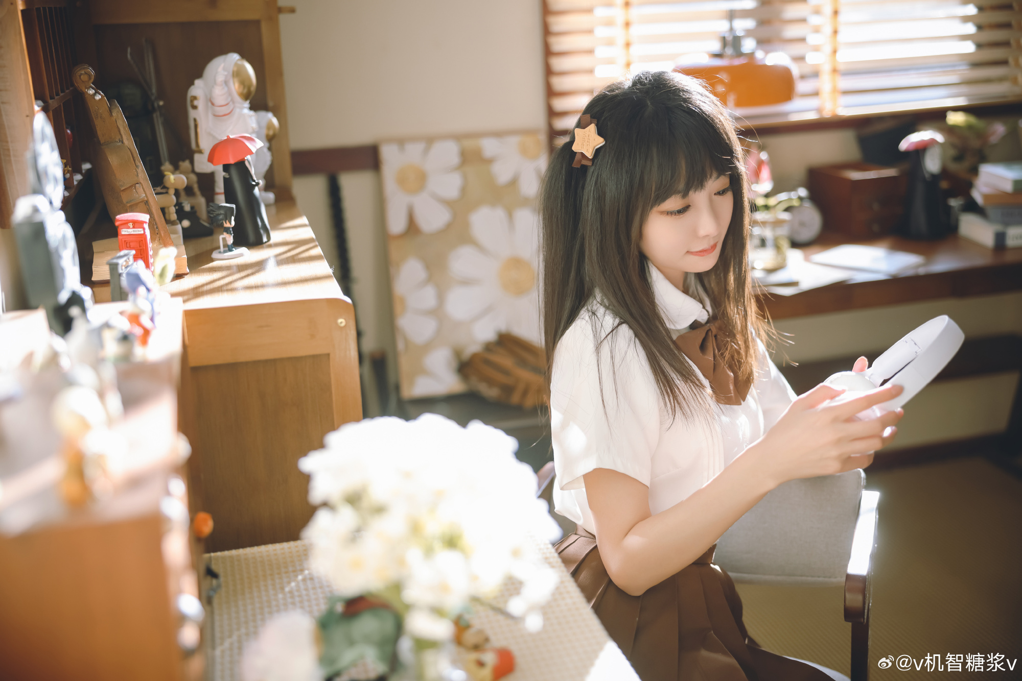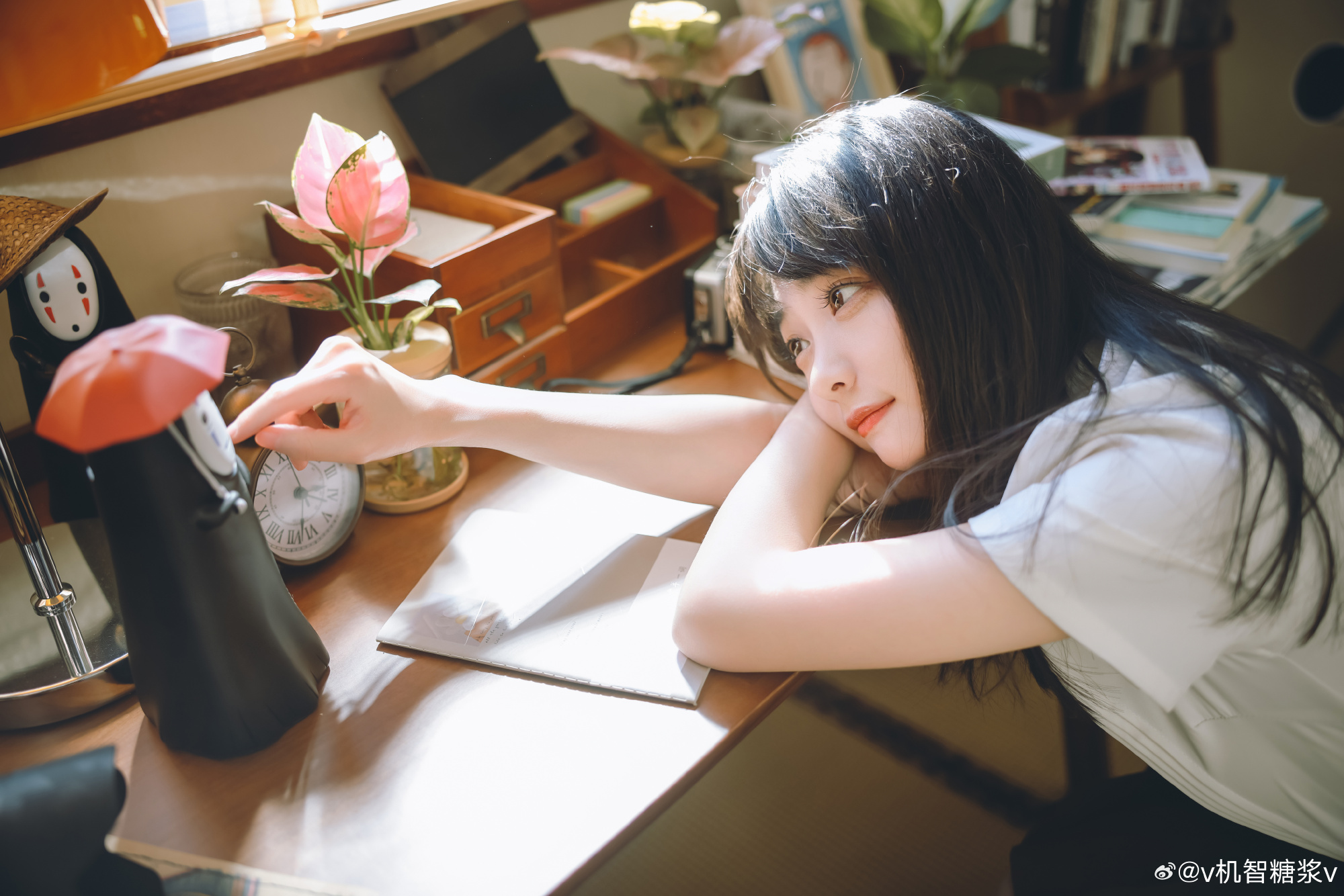 本文展示了一幅生活场景照片,摄影者为@白羊在拍照,出镜者为@v机智糖浆v。照片描绘了一位年轻女性,长发披肩,头戴小花饰,颈挂白色耳机,身着白色T恤与深色背带裙,面带温柔微笑坐在桌前。桌上摆放卡通卡片与小玩偶,背景生活化。画面整体氛围恬静自然,呼应标题“做自己的光,不需要太亮,足以挨过寒冬和黑夜就好”,传达在平凡日常中散发内在温暖,以应对困难时刻的主题。