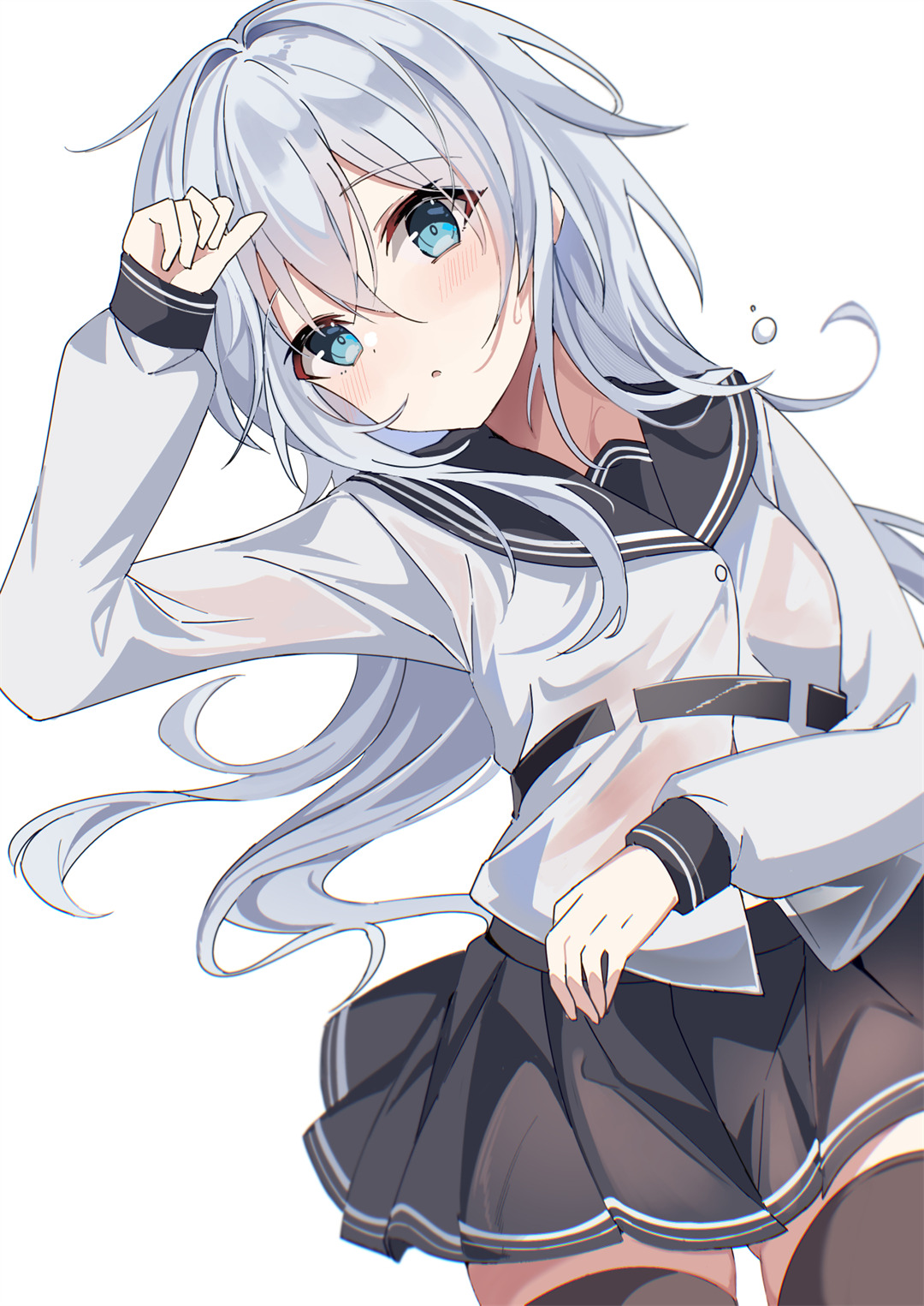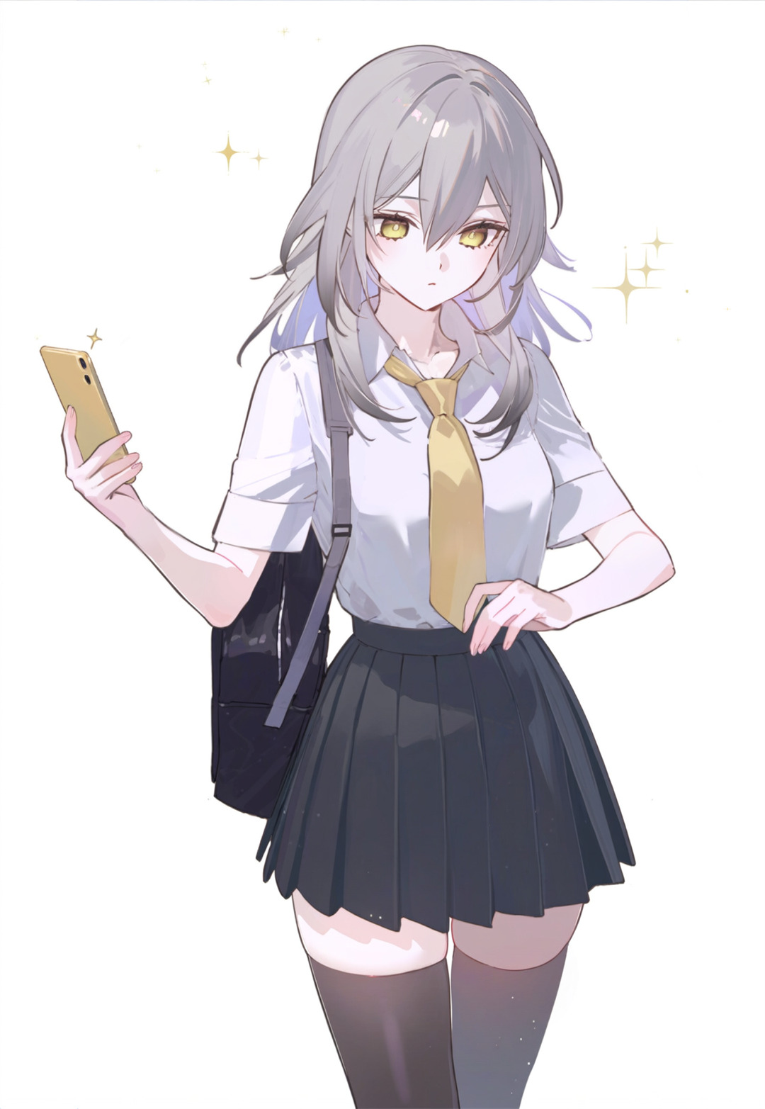 该文章通过一幅动漫插画展现《原神》角色克洛琳德的形象。画面中银发黄瞳的少女身着白色短袖衬衫、黄色领带与黑色百褶裙校服,背黑色双肩包,手持金色手机立于金色星点背景前。其造型呼应标题"玫瑰与克莱因蓝"的意象,象征不同元素即使未曾谋面也终将相遇的意境。