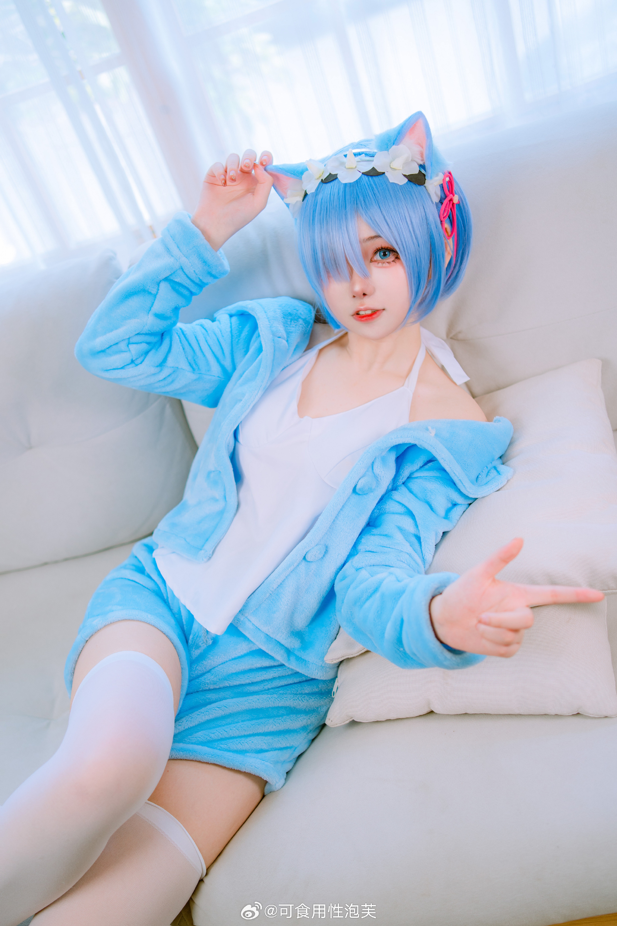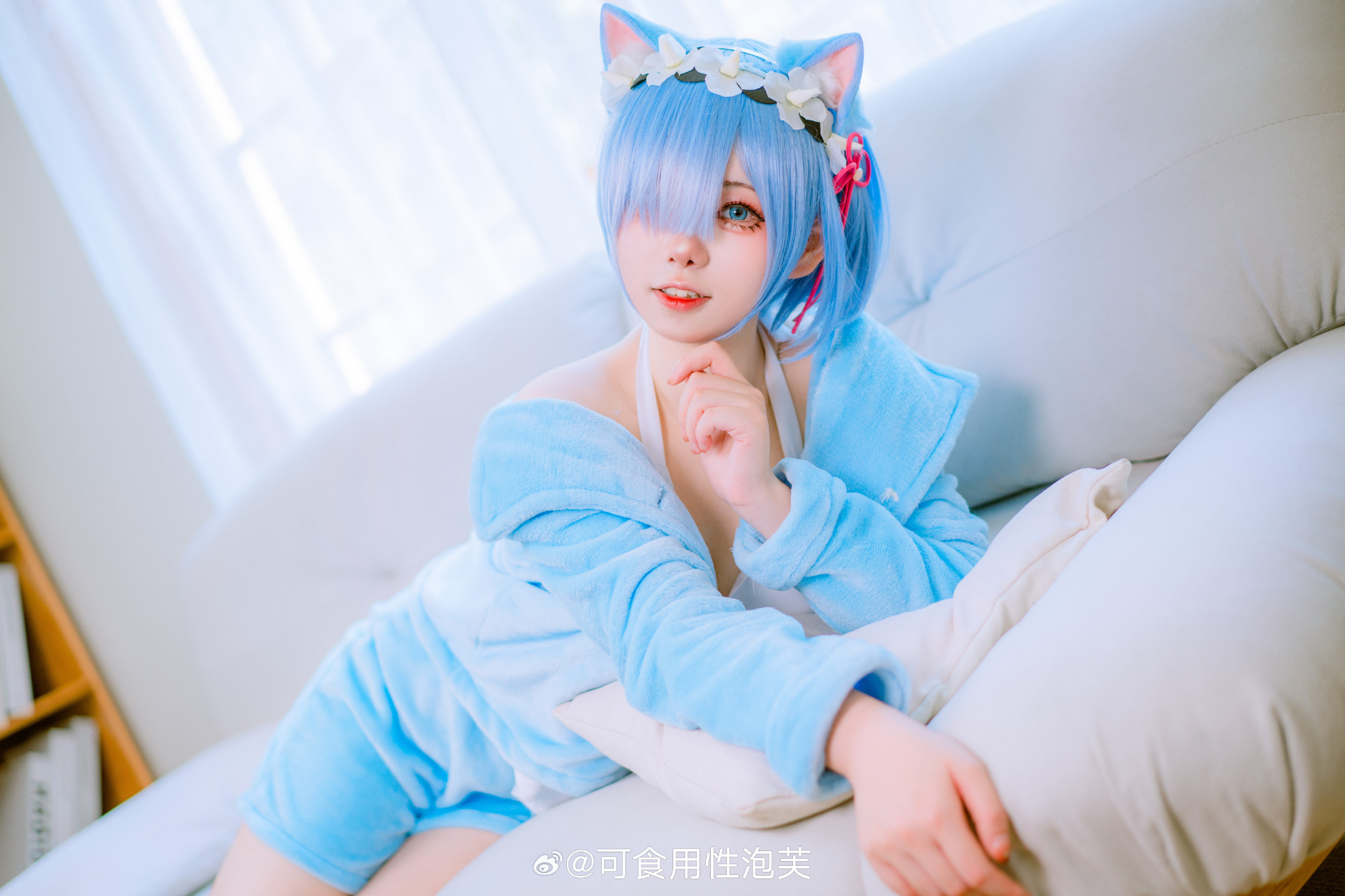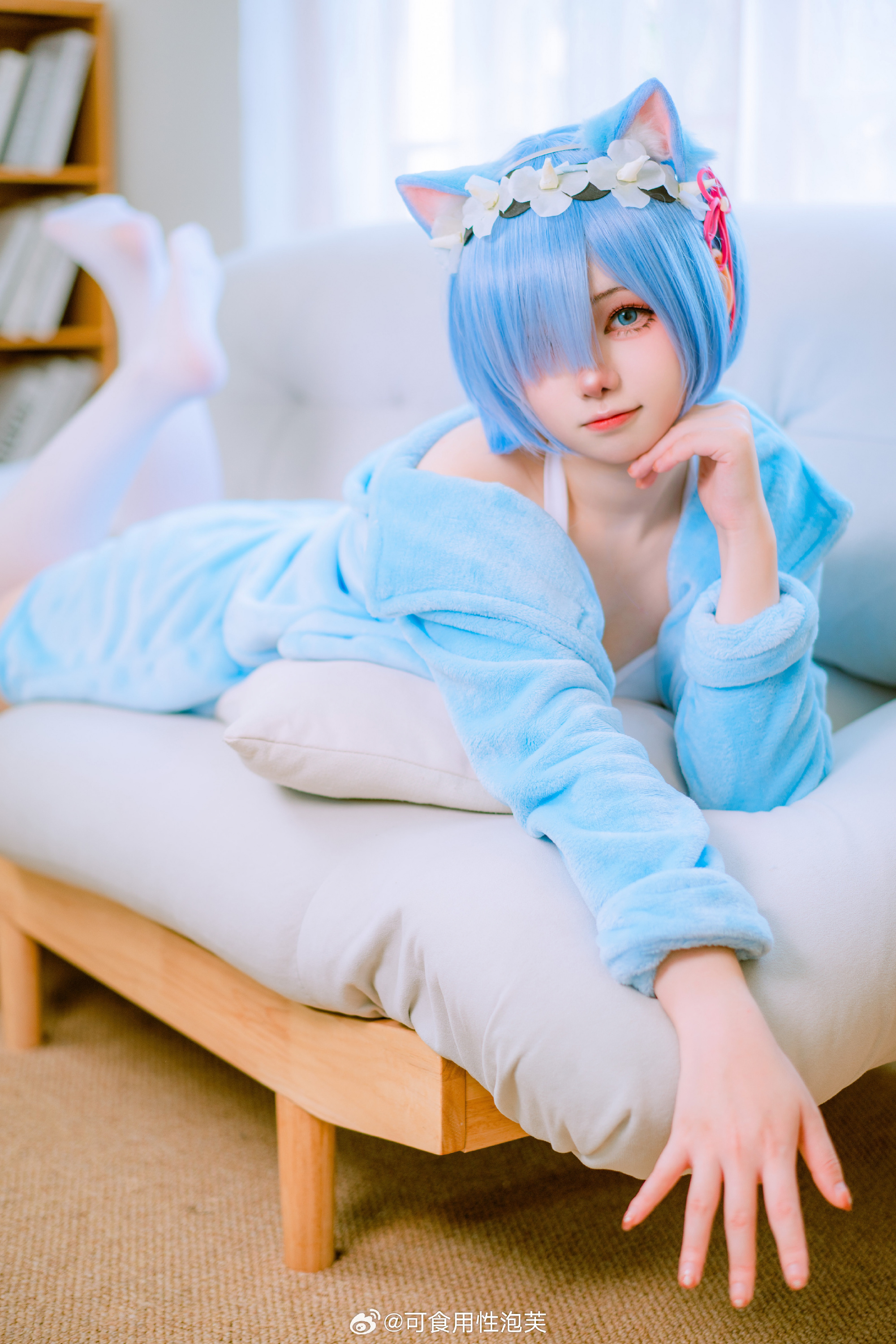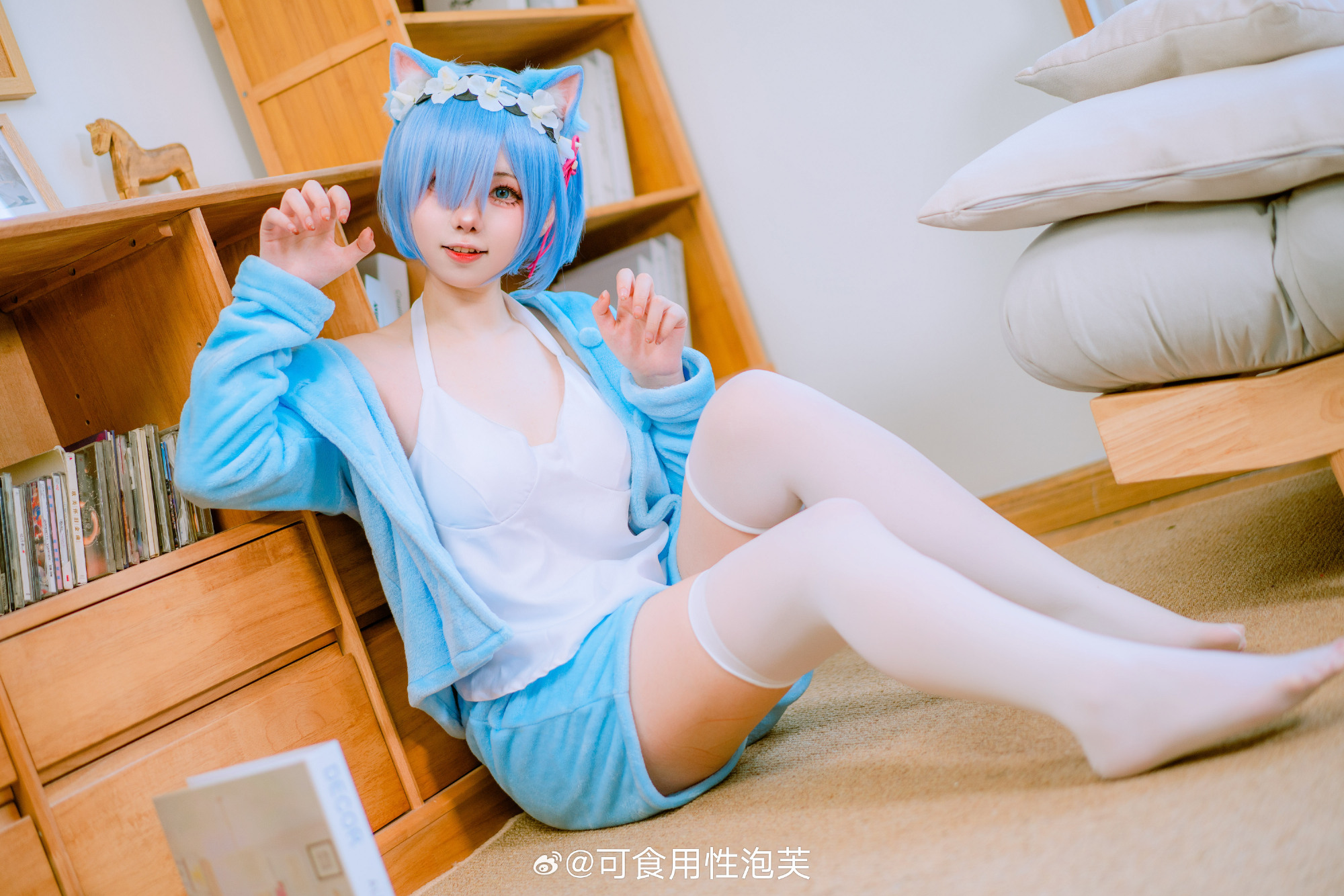 描述了一位Coser扮演动漫角色雷姆的形象,蓝发搭配猫耳发饰,身着浅蓝色绒质睡衣套装与白色长袜,跪坐于柔软床铺上,一手轻拉衣领,眼神温柔直视镜头。背景采用暖色调木质墙面,营造出私密、安静的居家氛围,呼应标题“清净就是不被人注视的那种温馨感觉”,传达一种被温柔包裹、远离喧嚣的静谧感。出镜者为@一大碗杏仁豆腐。