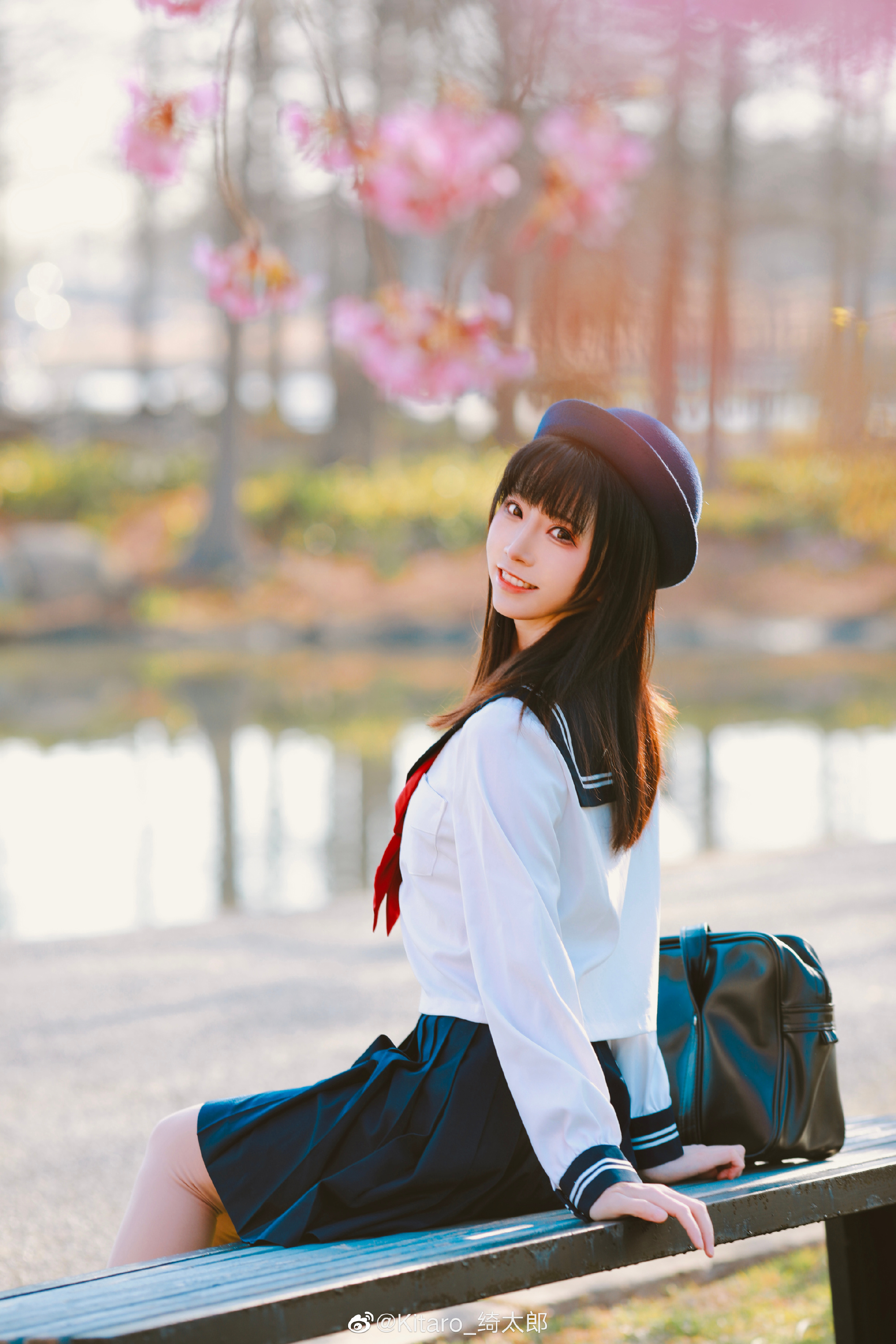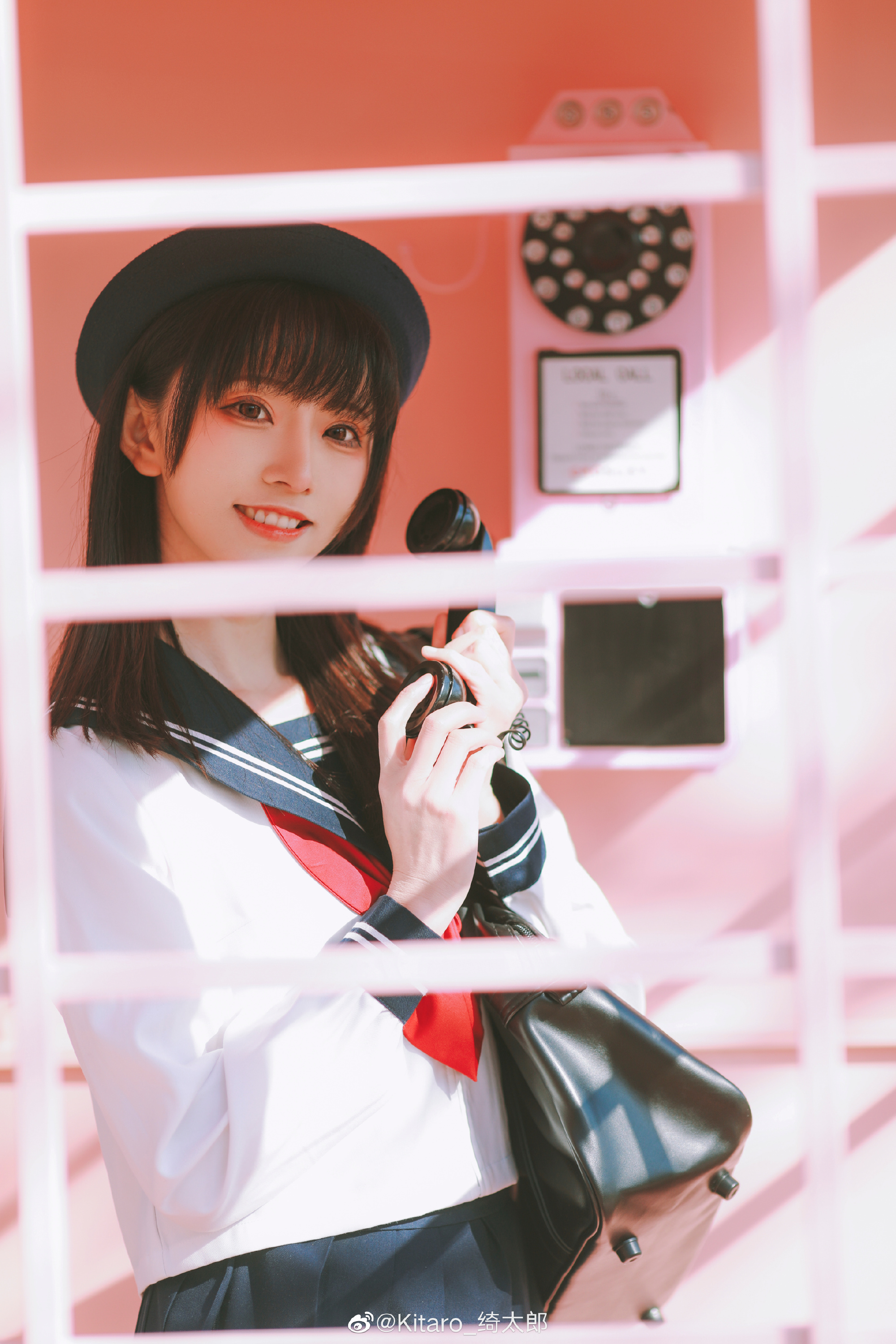 摄影师 @Steven_余锦 在樱花盛开的季节赴外地进行摄影创作,模特 @Kitaro_绮太郎 出镜演绎。作品呈现一位女性身穿水手服、头戴黑色帽子,透过白色格栅手持老式电话听筒微笑的场景,背景为粉色墙面装饰复古电话和相框。画面传递出轻松愉悦的氛围,与标题“没有解不开的难题,只有解不开的心绪”形成呼应,强调在复杂情境下保持内心平静与从容的生活态度。