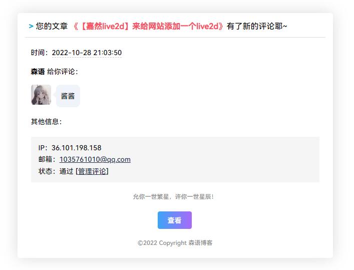 给自己的博客添加一个评论邮箱提醒功能大大的节约了读取时间也可以立刻能收的评论的通知,插件自定义程度非常高可以自定义框架,给邮件回复添加更多的趣味性!