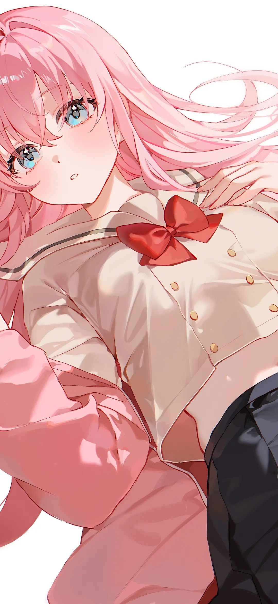这篇内容描述了一个动漫风格图片,图片中是一个粉色头发、蓝色瞳孔的少女,穿着水手服,领口有红色蝴蝶结装饰,长发在风中飞舞,眼神迷茫地看向一边。图片呼应了标题的诗意氛围,暗示离别和方向分歧的孤独感。