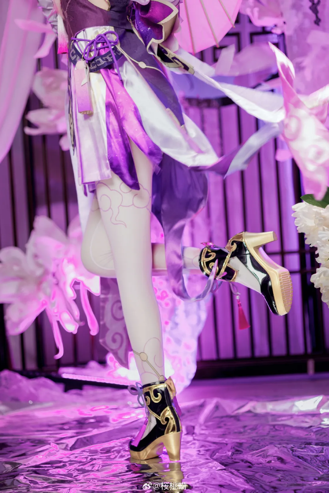 本文展示了一组《原神》角色“八重神子”的cosplay作品,由桜桃喵扮演。角色身着深色服饰,佩戴金色饰品与红色宝石吊坠,拥有粉色长发,双手戴紫色长手套高举头顶,掌心发出微光。整体画面笼罩在紫蓝色调中,营造神秘氛围,呼应标题“要么把世界变得好一点,要么把世界变得坏一点”,生动体现了神社巫女的双重力量与抉择主题。