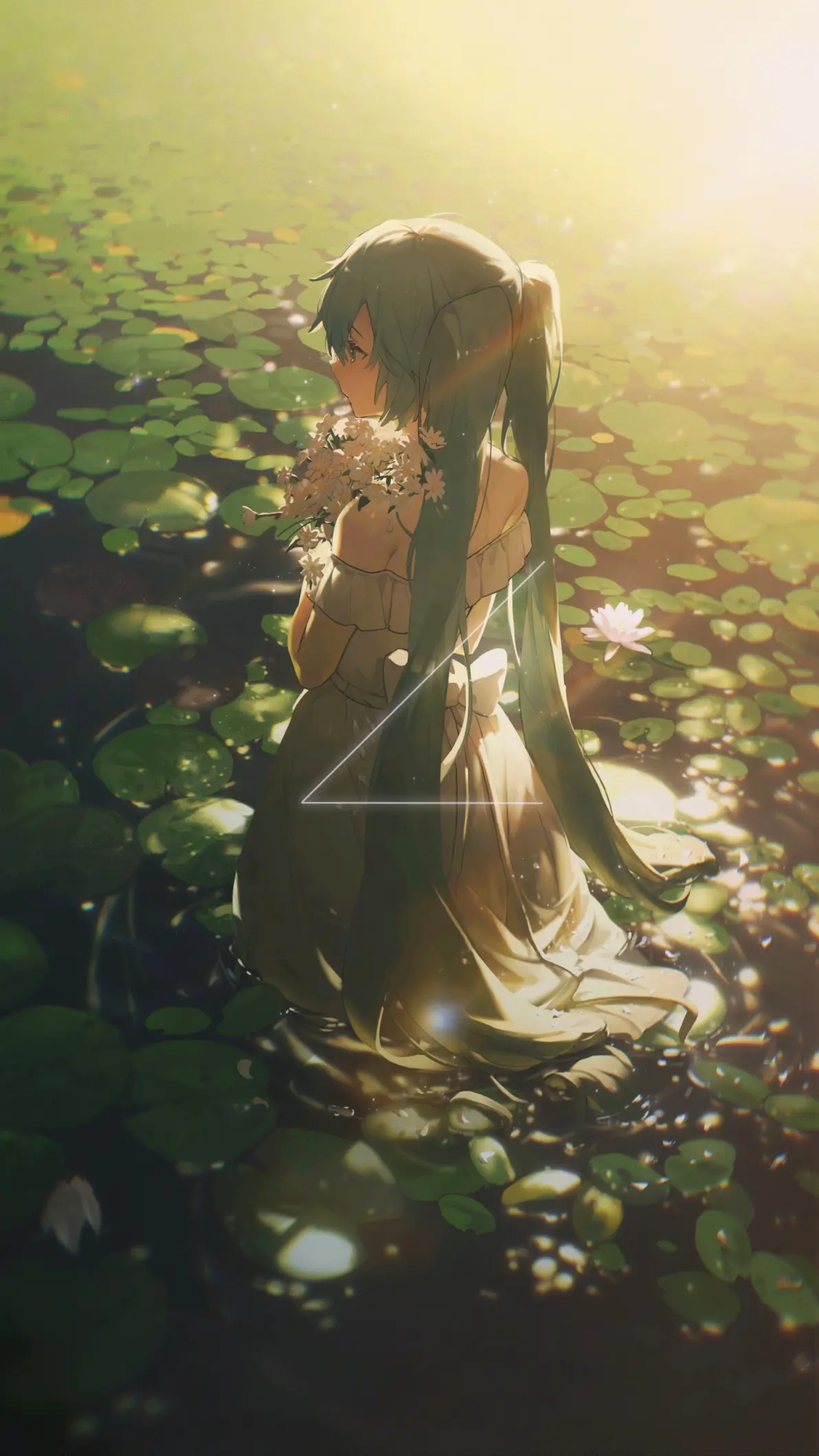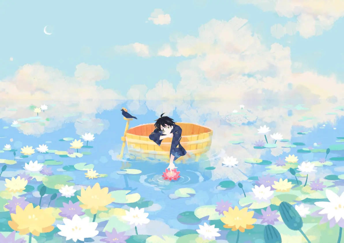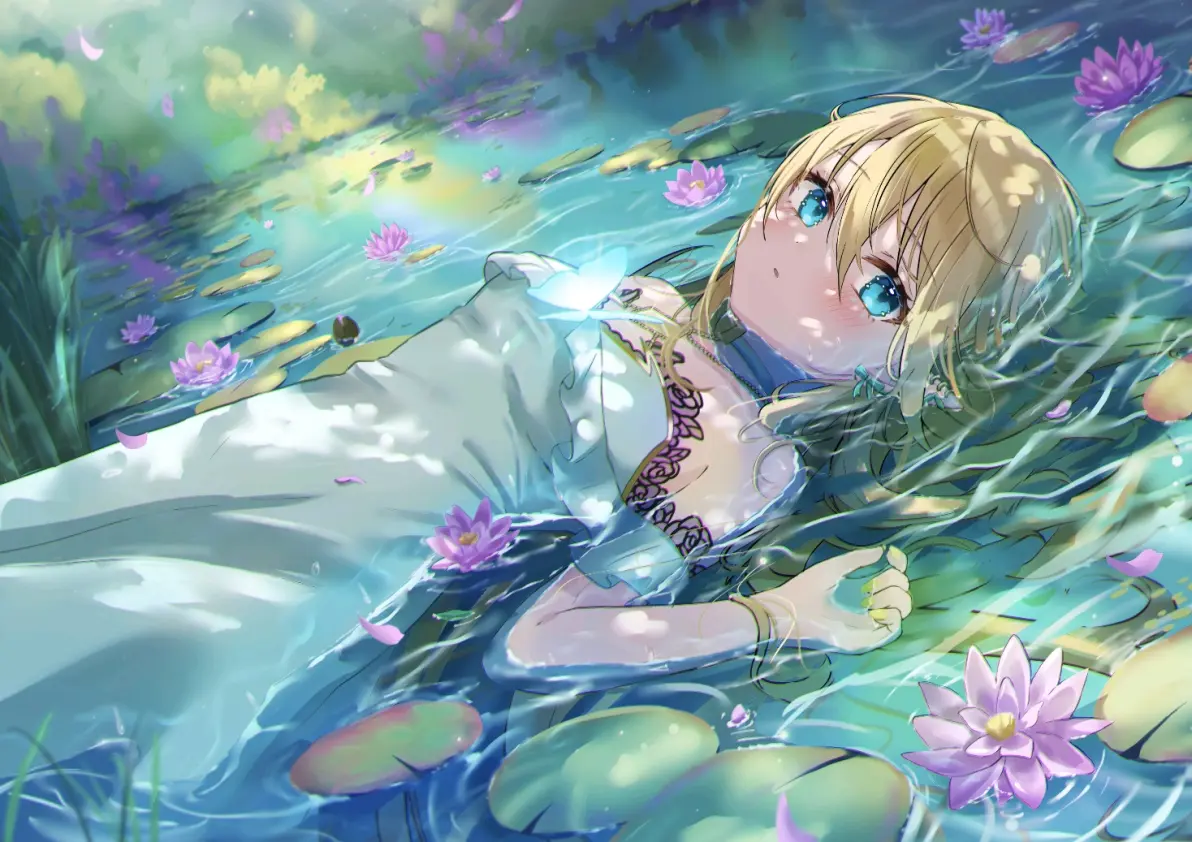 该插画特辑展现了睡莲与荷花点缀的水面美景。画面以梦幻的水下花园为背景,描绘了身着白色蕾丝长裙的金发少女俯身水边,身旁盛开着睡莲与荷花,水中游动着锦鲤并升腾着气泡。远处可见金发少年在水下漂浮,周围环绕着莲花与光影。作品通过静谧的人物姿态与自然元素的交融,营造出缥缈梦幻的氛围。