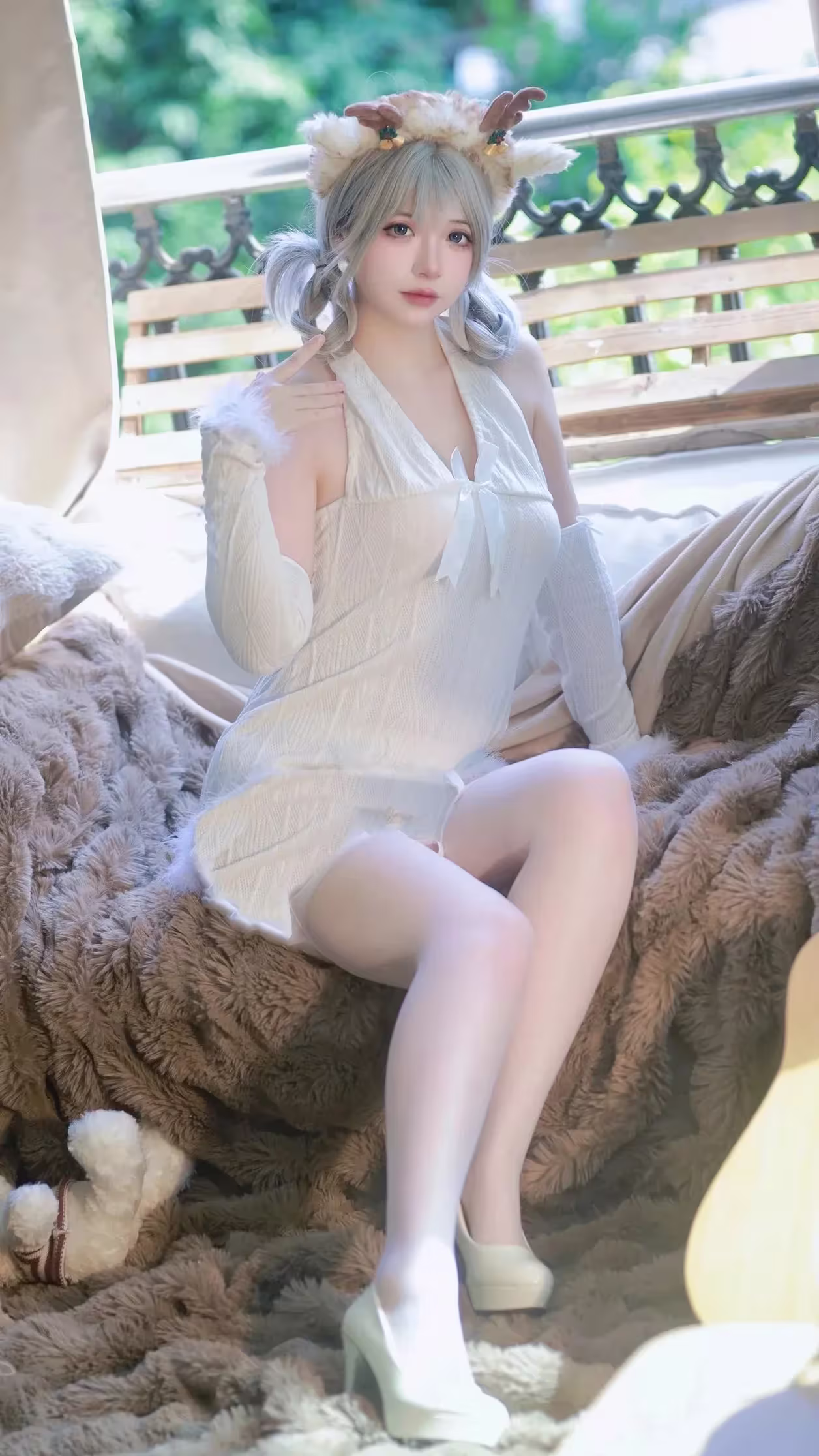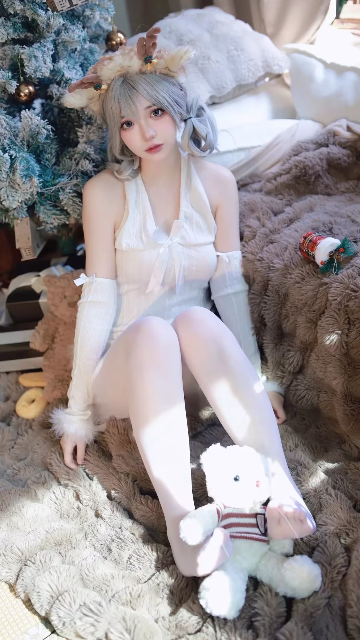本文呈现了cosplayer@疯了个猫出镜的白色圣诞主题写真。写真中,她以银灰双马尾配鹿角发饰、身着白色吊带裙与长手套的姿态,坐于毛绒毯上手持小物,神情恬静;背景装饰包括泰迪熊和甜甜圈,营造出温馨氛围。作品呼应标题“等日落西山,等冬去春来,等尘埃落定”,通过画面传递静候时光流转、内心安然的意境。