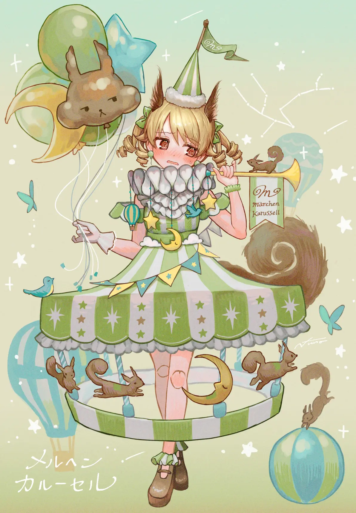 文章描绘了走进巨大帐篷、如梦似幻的马戏团现场:华丽舞者、空中飞人和猛兽杂技交织成视觉盛宴。配图为一幅马戏团主题插画:中央为一位金发少女与戴高帽的绿发少年并肩着华丽表演服,表情庄重,背后是深紫色帷幕和装饰性拱形舞台,两侧有小象踏着红白球体,前景还有两个孩童角色。整体构图营造古典马戏团的神秘与梦幻,呼应标题的华丽氛围。