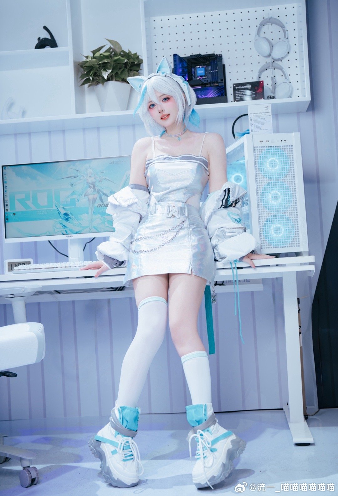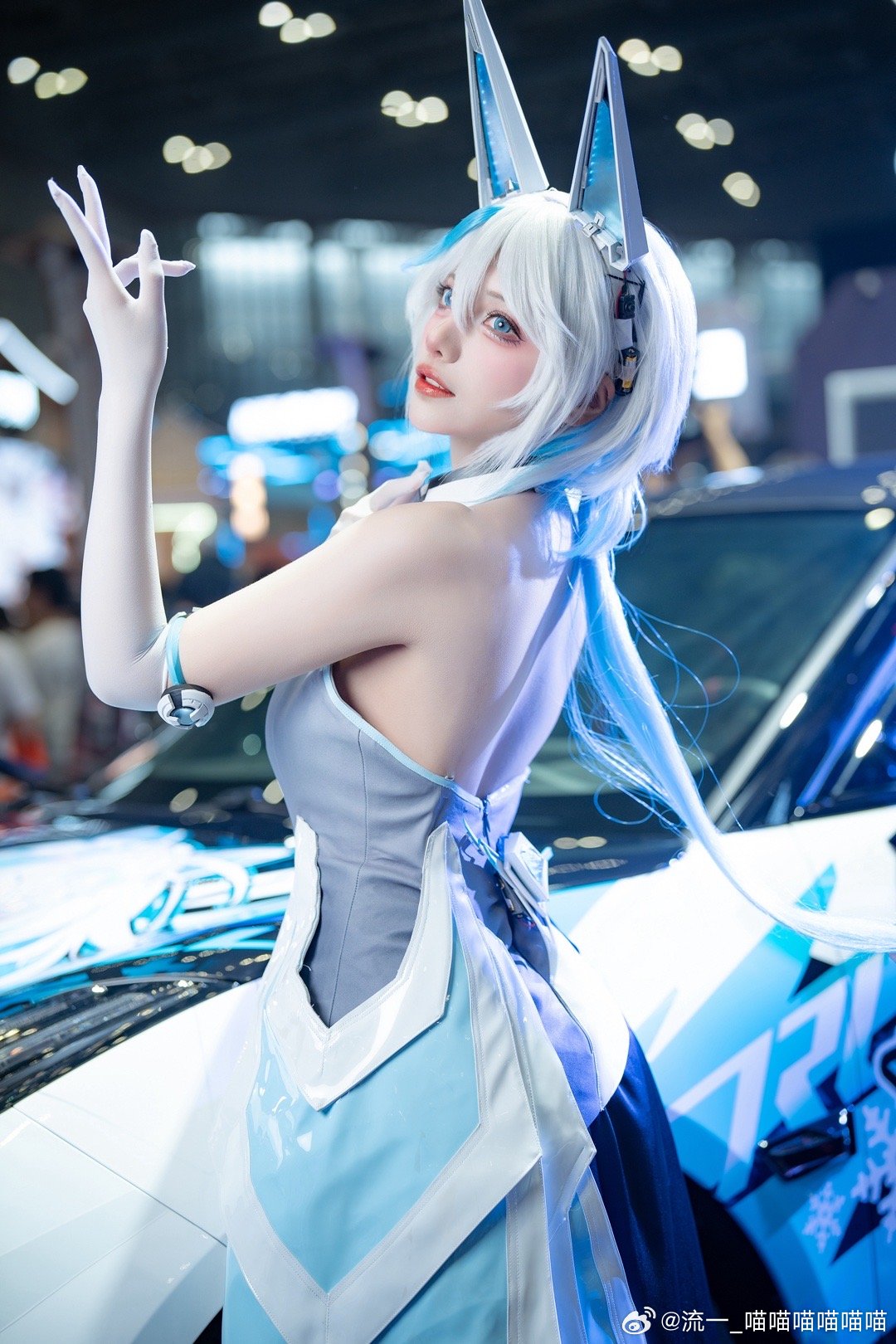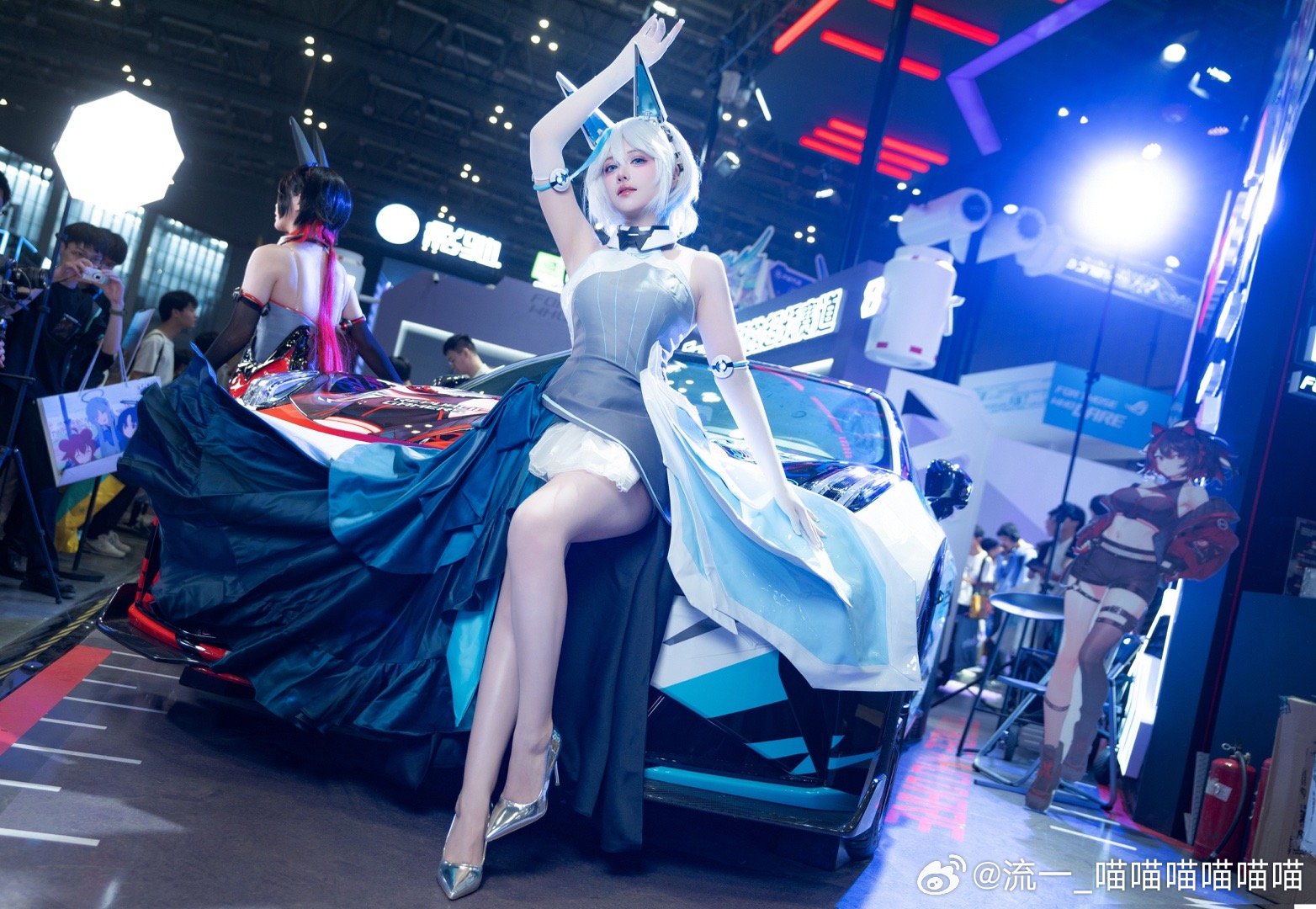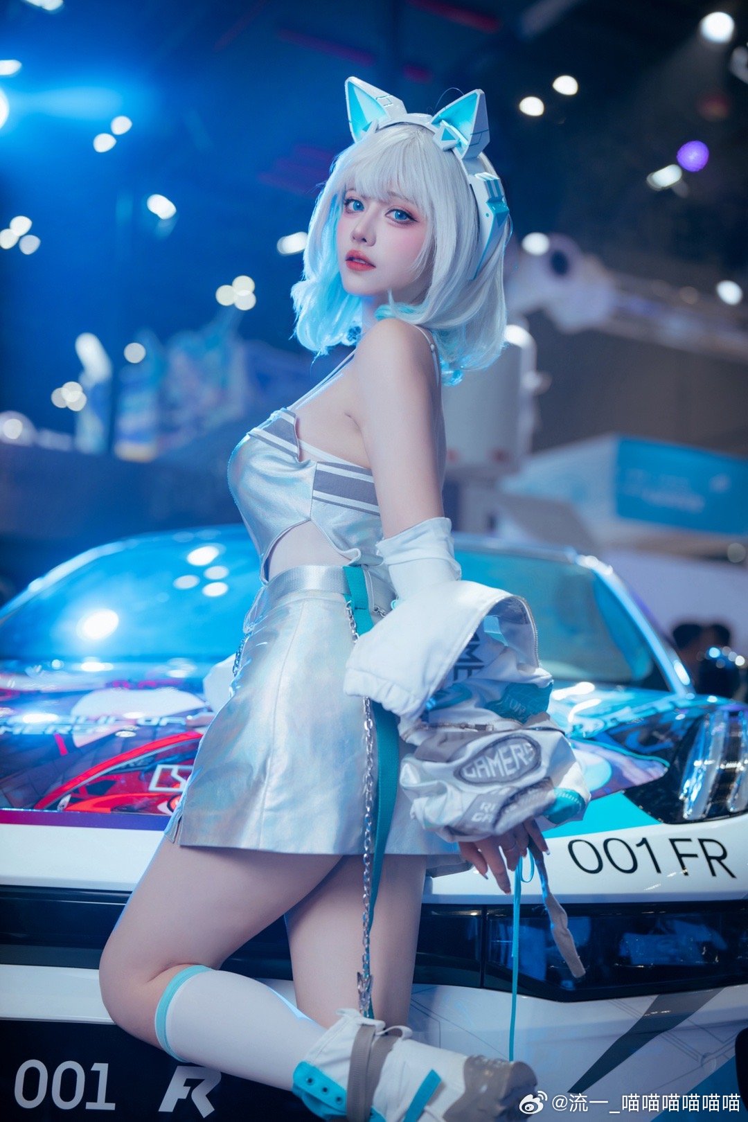 在展会场景中,cosplayer@流一_喵喵喵喵喵喵以独特造型亮相:她身着银色露肩短裙,搭配白色短发与猫耳装饰、白色长袜及蓝白运动鞋,自信地坐在编号“001”的赛车旁。图片捕捉了她放松而富有表现力的姿态,背景元素烘托出活动氛围。这一展示生动传递了自我悦纳的态度,契合“无法讨好全世界那就先取悦自己”的主题核心,强调专注取悦自我的积极精神。