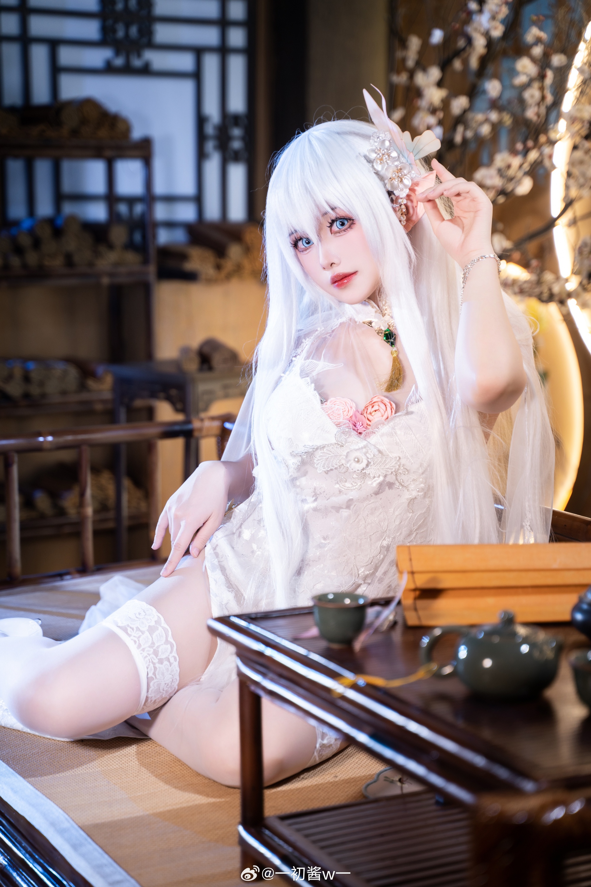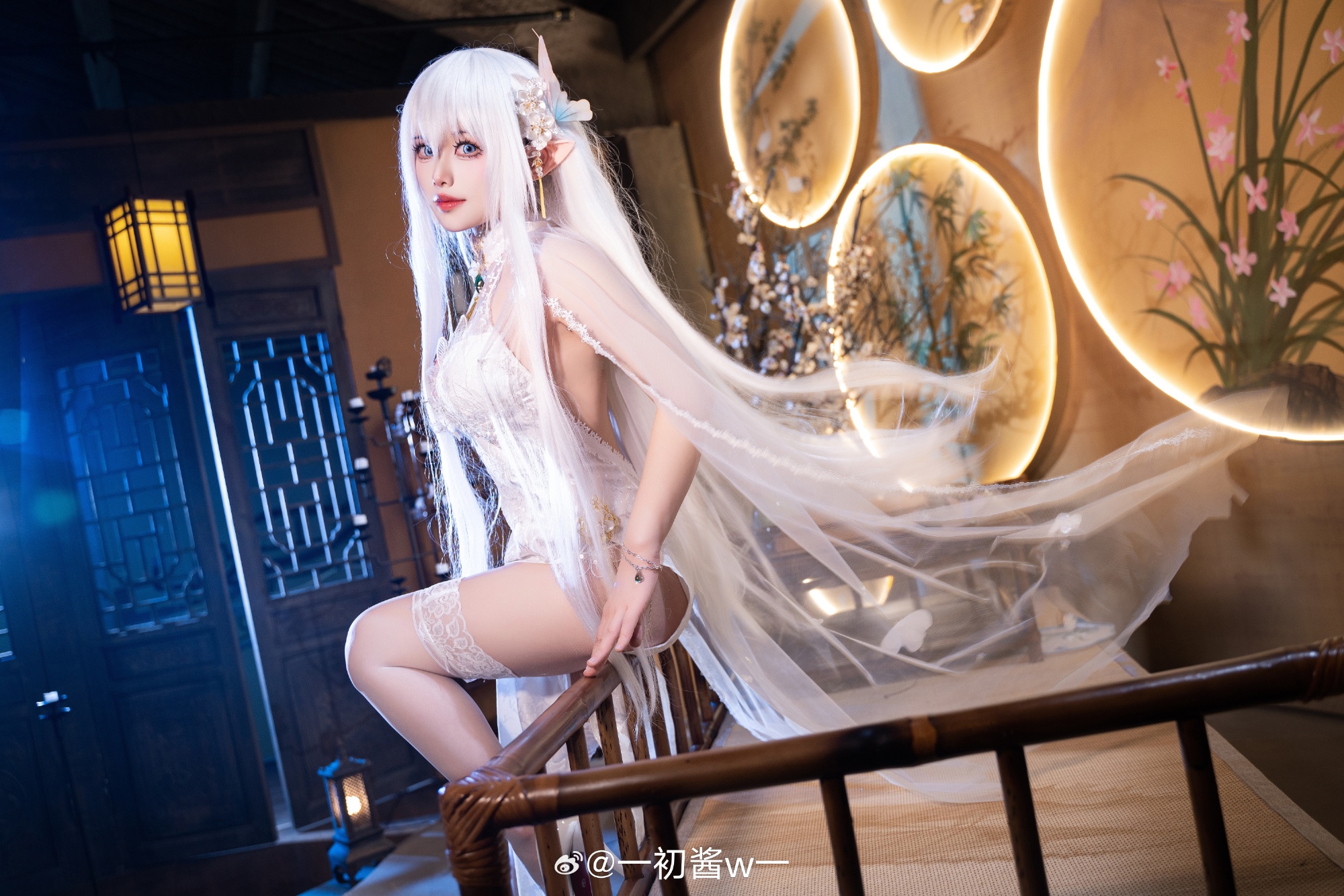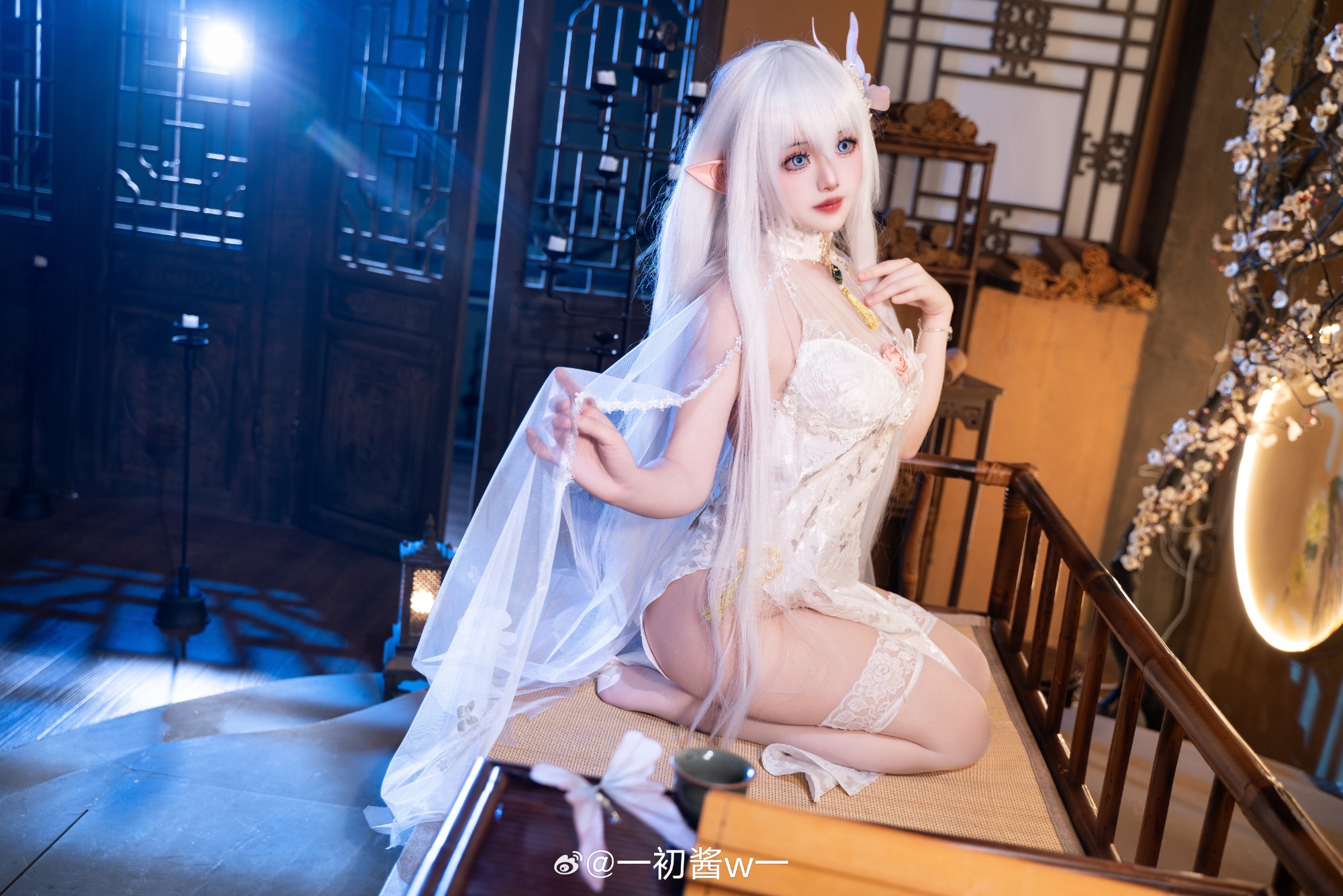 本文展示了一初酱w一扮演的游戏角色Cosplay照片,主题为碧蓝航线的秘书舰阿尔比恩。摄影由Pineapple_學長完成,角色造型精致:银白长发、精灵耳、身着白色蕾丝紧身衣与薄纱披肩,跪坐姿态优雅,眼神温柔含笑。场景采用中式窗棂与暖光灯笼,呈现出静谧氛围。画面右下角的文字“一切由我来承担吧!”呼应标题,凸显阿尔比恩主动担当的性格特质。