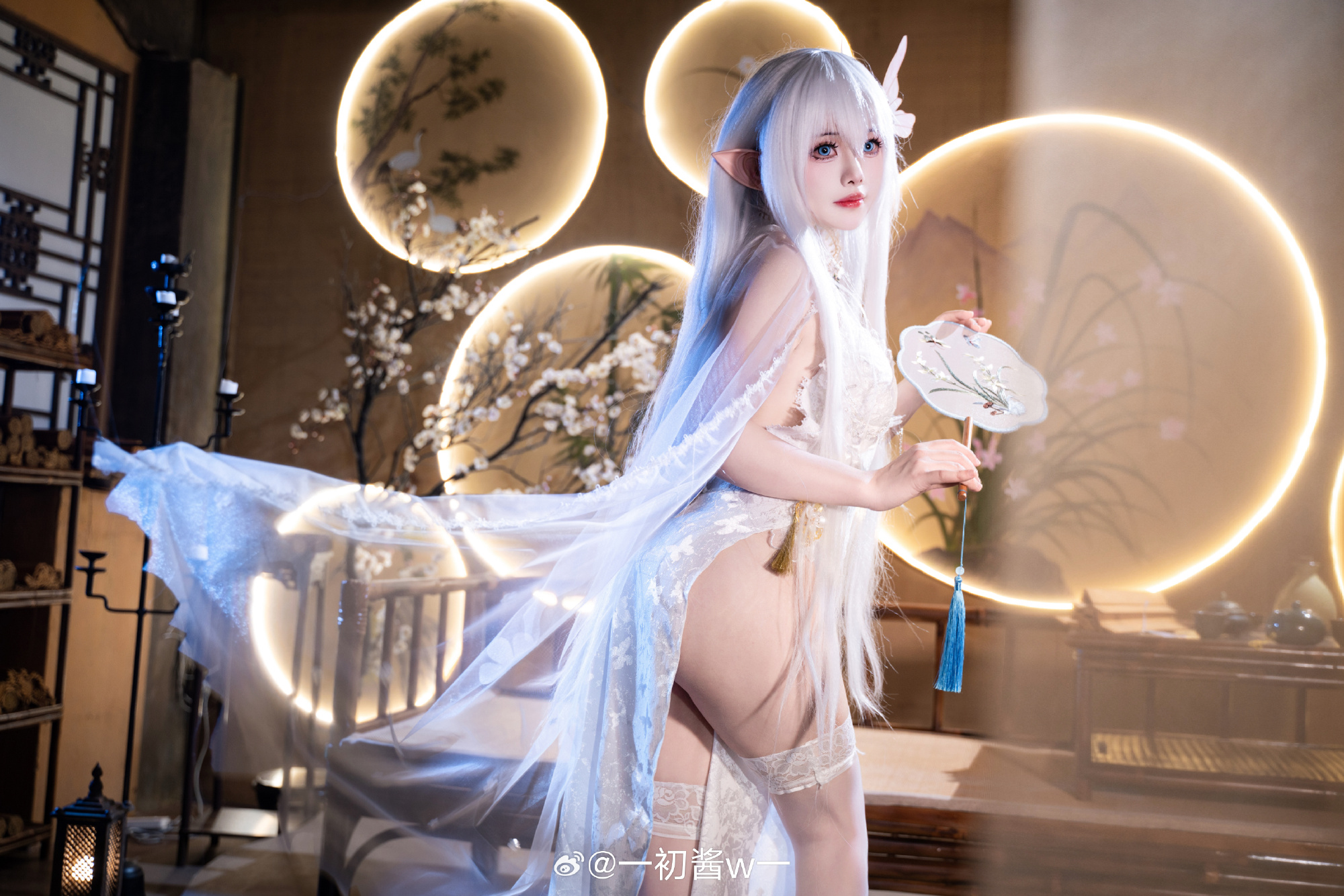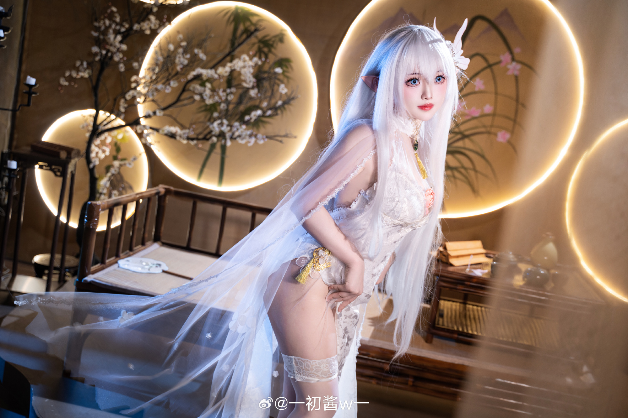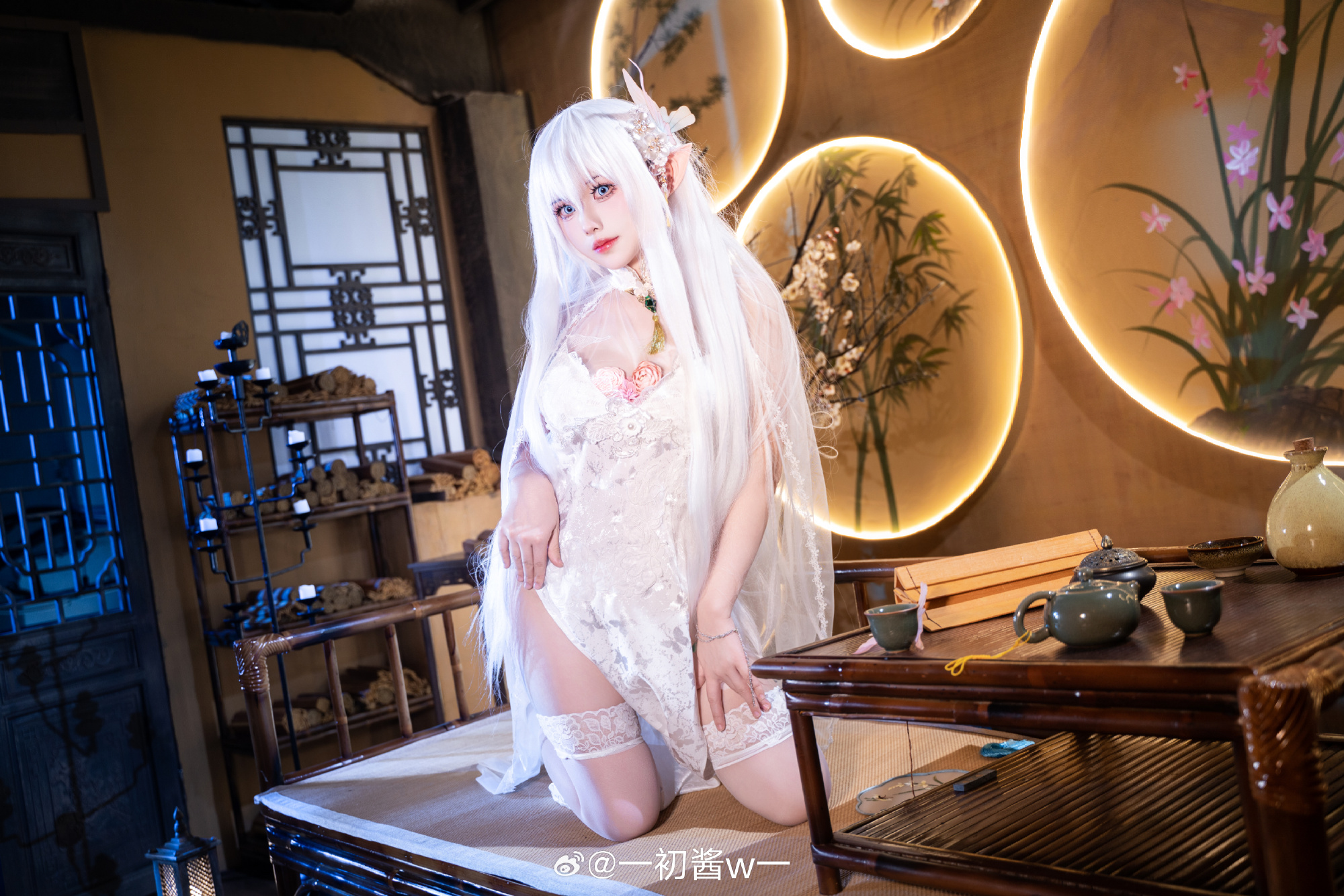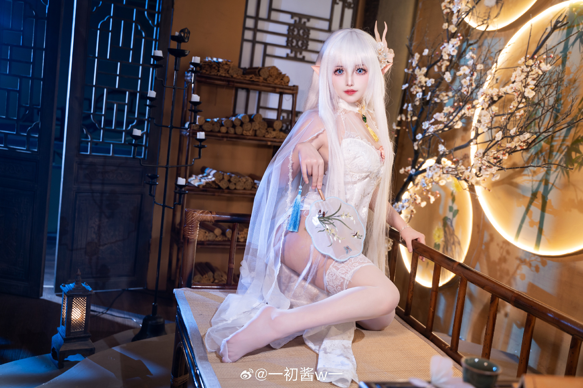 本文展示了一初酱w一扮演的游戏角色Cosplay照片,主题为碧蓝航线的秘书舰阿尔比恩。摄影由Pineapple_學長完成,角色造型精致:银白长发、精灵耳、身着白色蕾丝紧身衣与薄纱披肩,跪坐姿态优雅,眼神温柔含笑。场景采用中式窗棂与暖光灯笼,呈现出静谧氛围。画面右下角的文字“一切由我来承担吧!”呼应标题,凸显阿尔比恩主动担当的性格特质。