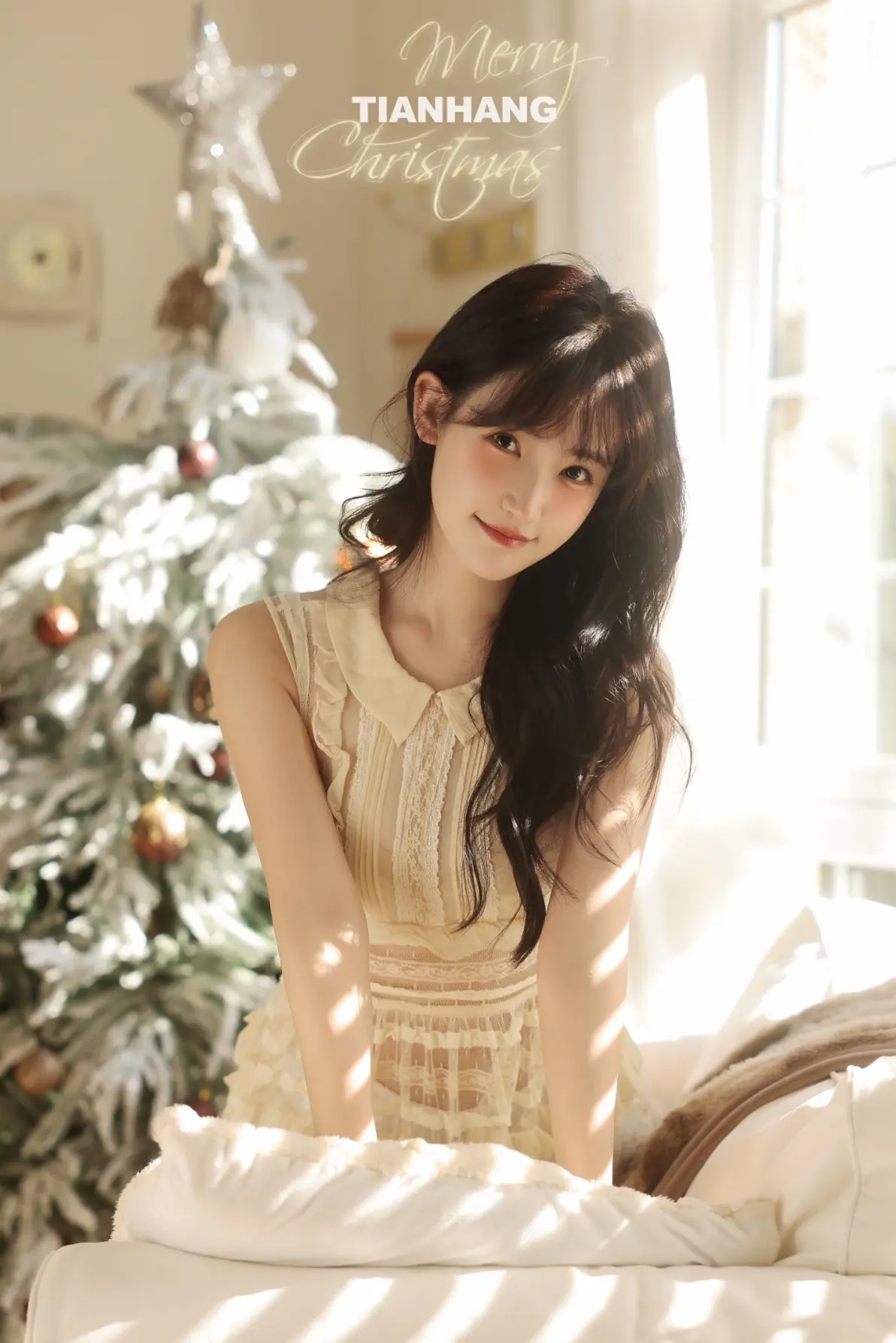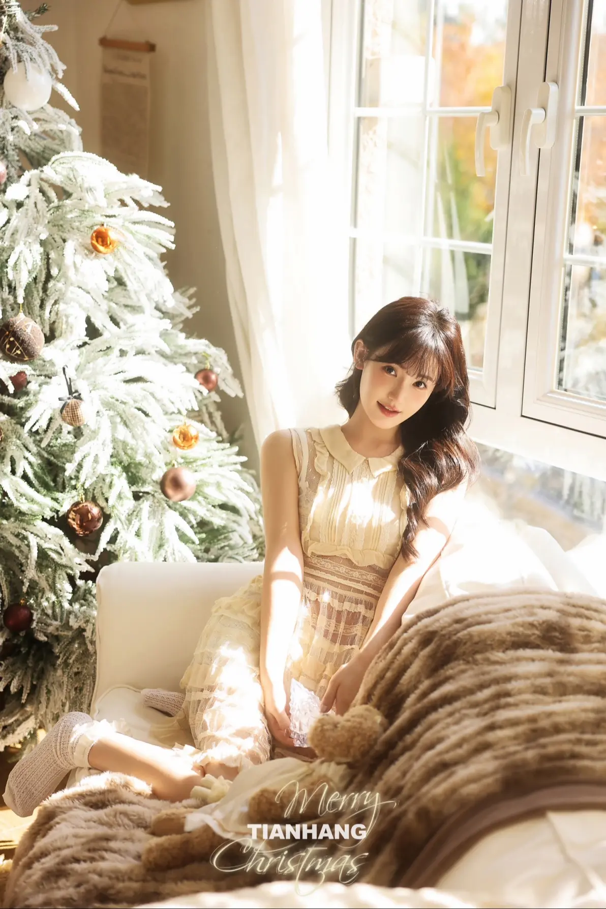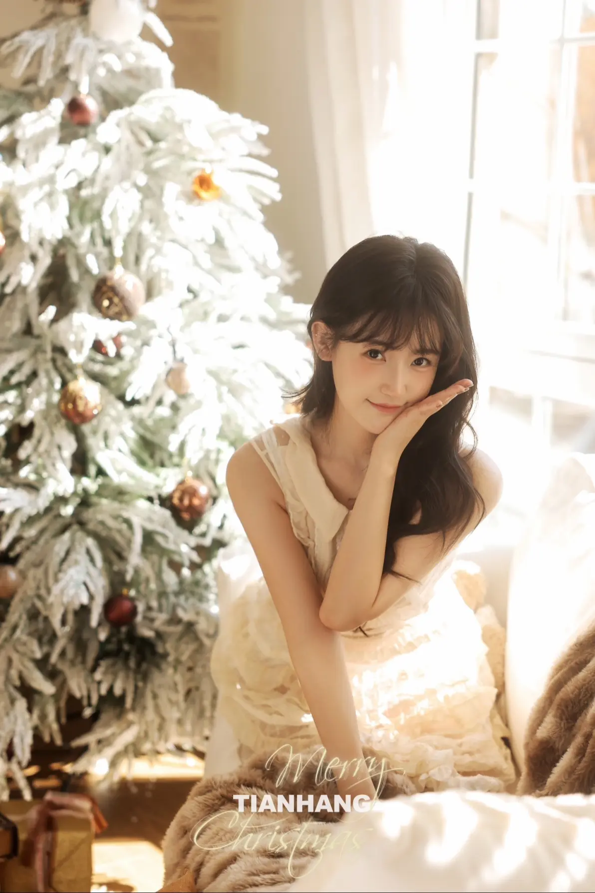 摄影师UPLUSKY天航推出题为“与其喜欢深夜的梦,不如爱上凌晨的风”的圣诞私房写真作品。写真描绘了一位年轻女性身着米白色无袖蕾丝连衣裙、外搭轻薄开衫和堆堆袜,侧坐于窗边毛绒地毯上,长发微卷,侧脸望向镜头,神情温柔恬静。前景装饰有棕色球形挂饰的白色圣诞树,背景为透光百叶窗,整体氛围柔和静谧,呼应标题所传达的私密、宁静与诗意情感,传达出对凌晨时分浪漫瞬间的欣赏。