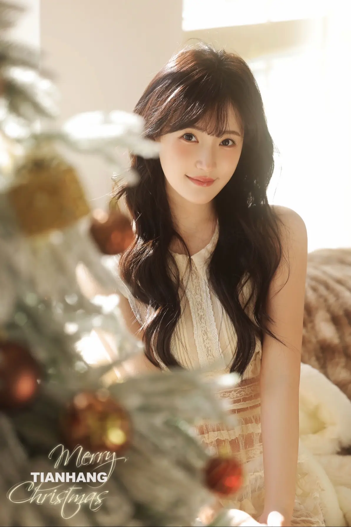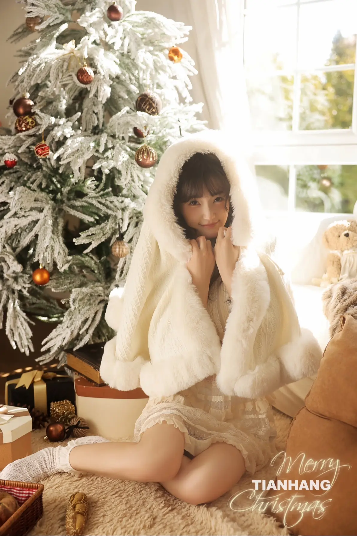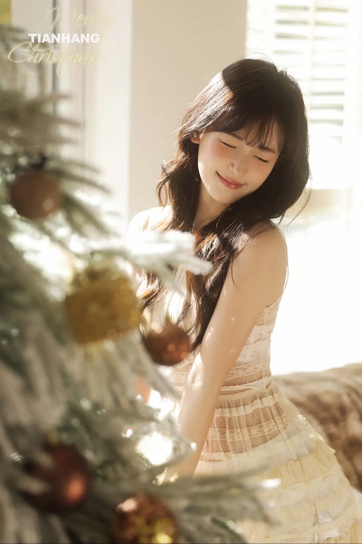 摄影师UPLUSKY天航推出题为“与其喜欢深夜的梦,不如爱上凌晨的风”的圣诞私房写真作品。写真描绘了一位年轻女性身着米白色无袖蕾丝连衣裙、外搭轻薄开衫和堆堆袜,侧坐于窗边毛绒地毯上,长发微卷,侧脸望向镜头,神情温柔恬静。前景装饰有棕色球形挂饰的白色圣诞树,背景为透光百叶窗,整体氛围柔和静谧,呼应标题所传达的私密、宁静与诗意情感,传达出对凌晨时分浪漫瞬间的欣赏。