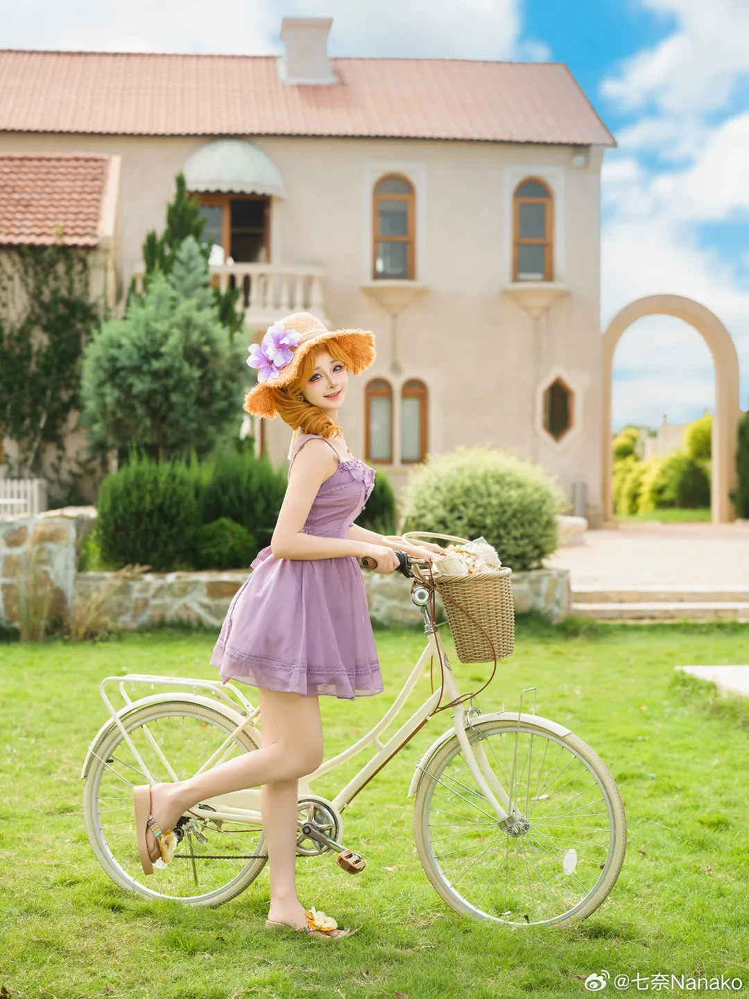 文章展示了Cosplayer @鱼子酱不能睡懒觉的庄园主题作品。她身着淡紫色连衣裙,头戴橙色草帽装饰紫色花朵,脚踩浅色凉鞋,姿态轻盈地倚靠在一辆米白色复古自行车旁微笑。背景为欧式庭院与蓝天绿草,整体氛围恬静美好,呼应标题“一些小美好正在井然有序地进行着”的温馨意境,营造出公主般的宁静画面。