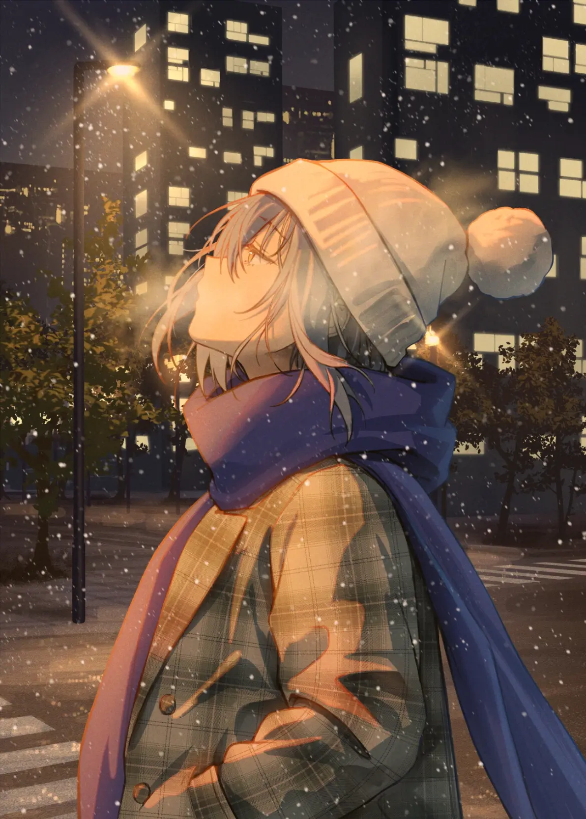 秋冬时节,低温环境下的白色呼气成为显著季节特征。插画作品《宣告冬天到来 - 白色呼气插画特辑》通过画面生动呈现这一现象:一位戴浅色针织帽与蓝色围巾、身着格纹外套的动漫风格少女,在雪夜街头侧身而立,闭眼仰头呼出白气。冷光下可见的呼气与飘雪交织,背景中灯火通明的城市高楼与散发暖光的路灯,共同营造出冬夜静谧而温暖的氛围。图片链接为https://www.playcos.cn/wp-content/uploads/2025/01/7f22635fa8bb7724bb4c79722741016d235818446.jpg@1192w.webp。