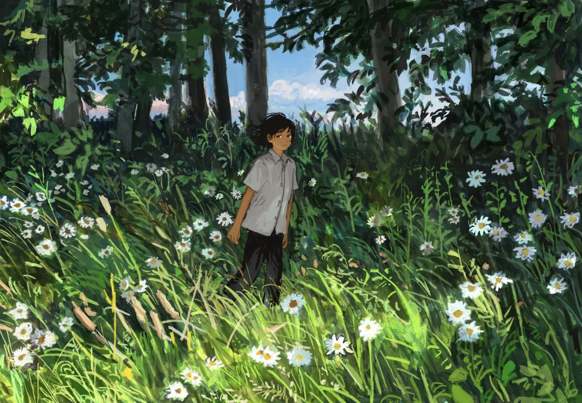 文章围绕“生机盎然的绿意 - 植物插画特辑”展开,描述了植物主题插画如何通过绿意盎然的画面带来心灵平静。插画展现了植物的美丽和生命力,传达自然的动人魅力。一幅具体图片描绘了黑发少女坐在被绿植环绕的石阶上,怀抱红色花朵,周围布满白色小花和阳光斑驳,营造出宁静而生机的氛围,体现了主题的核心概念。(126字)