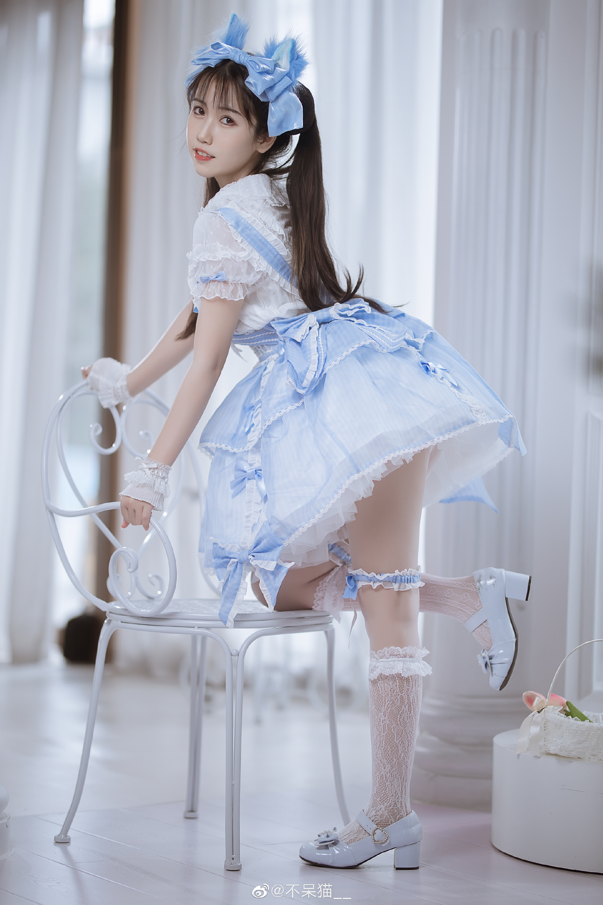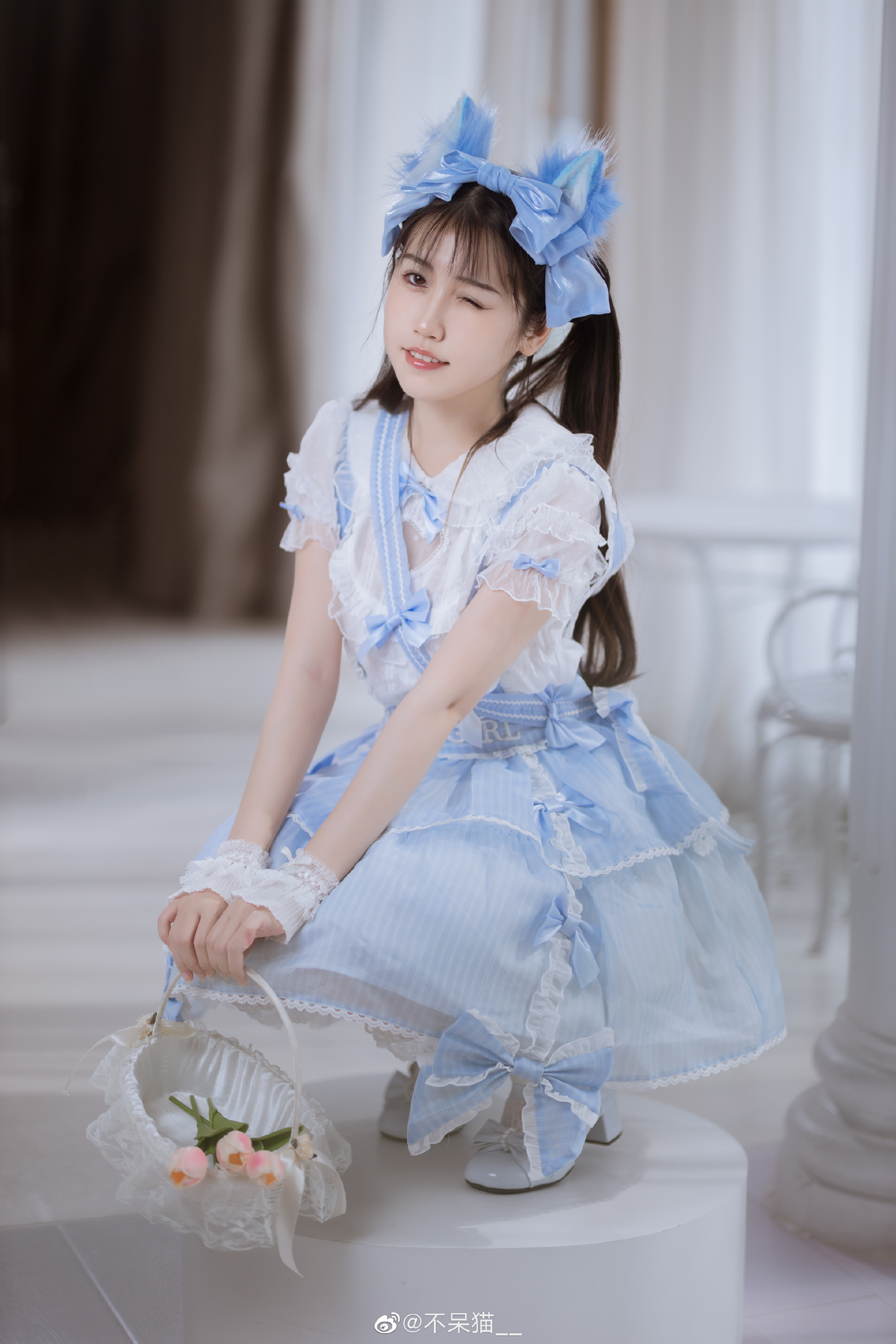 该摄影图册以“今天天气真好,我的意思是……”为主题,摄影师BB大熊不爱BB拍摄了一位身着蓝白洛丽塔裙装的年轻女性,装扮由不呆猫__设计。图中人物佩戴蓝色蝴蝶结发饰,双马尾垂肩,坐于木地板上,一手轻抚发丝,一手持干花束,眼神柔和。背景为透光白纱帘,整体营造出清新甜美的氛围。标题蕴含双关含义,不仅指天气晴朗,更暗喻内心明媚与画面如春日般温暖动人的意境。