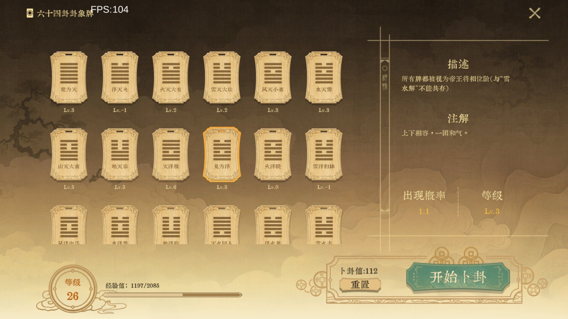 请运用《易经·六十四卦》的合理搭配,推演命数突破天命桎梏!《对弈五千年》是一款以《易经》为灵感的肉鸽类卡牌构筑游戏。 游戏设计了基于中国传统历史的104个历史事件作为对局,还包括了一百多张由六十四卦、五行人物、天干、地支、星宿、北斗等传统中国元素融合的趣味手牌。 玩家将穿越至从夏到清十六个朝代,运用手牌的丰富技能和不同组合的增效和“天幕”展开激烈博弈,尝试改写中国王朝的历史!