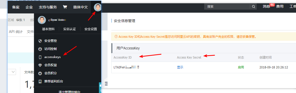 点击右上角账户下拉面板中的Accesskeys链接。点击继续使用AccessKey,创建一个AccessKey,并且将Access Key ID和Access Key Secret记下来。