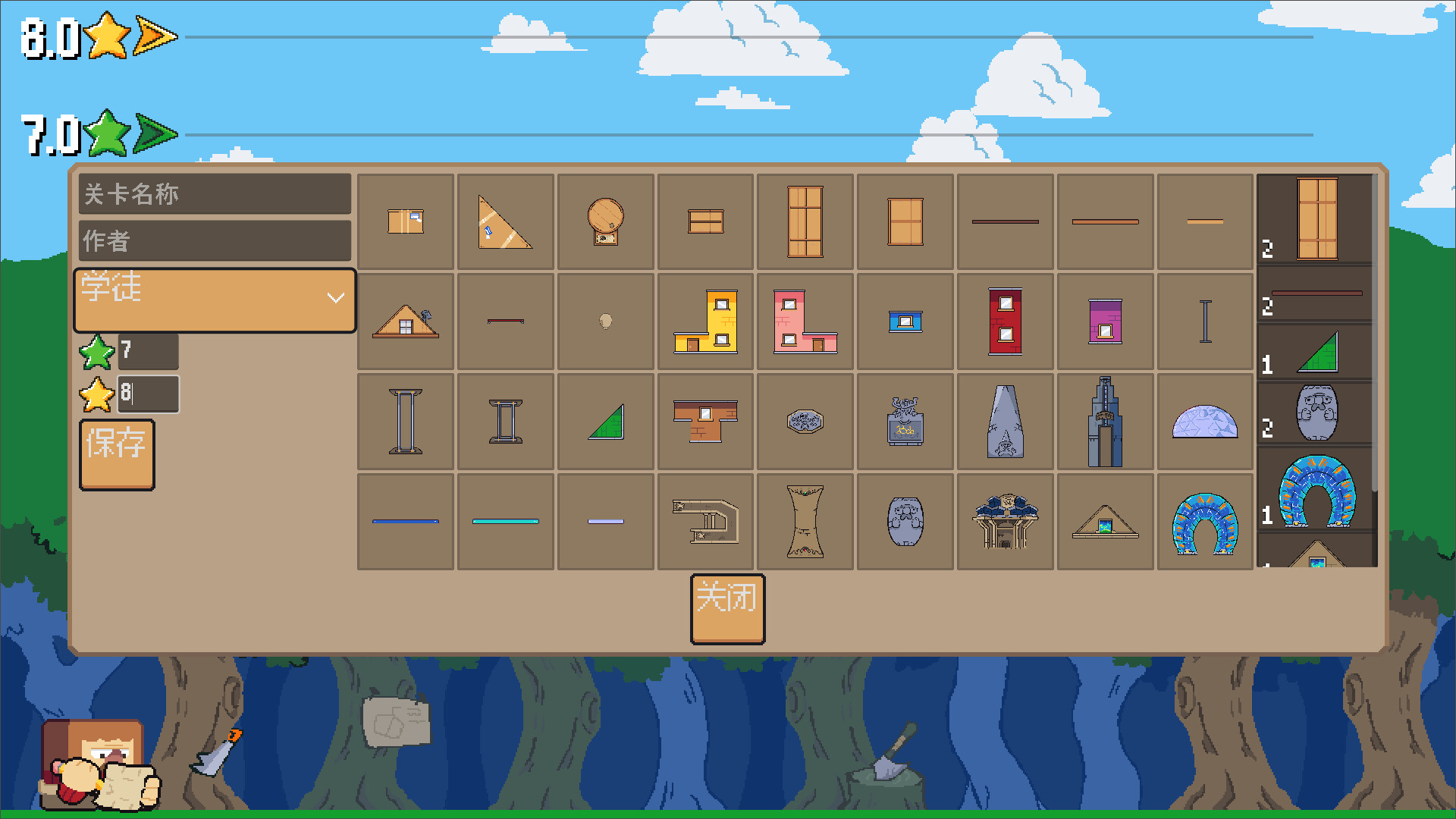 在这款物理建造解谜平台游戏中,堆叠、旋转和平衡,挑战天际高度!建造大胆的高塔,冲击高分,设计你自己的关卡,帮助小宝冲向天空!