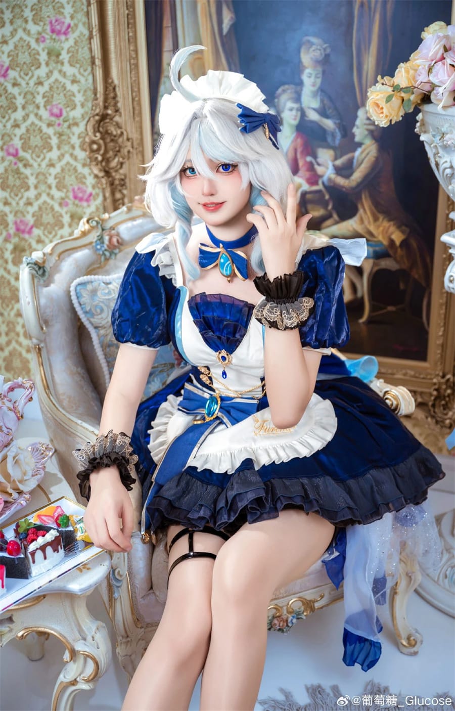 在 cosplay 的奇幻舞台上,葡萄糖_Glucose 所展现的原神芙宁娜形象宛如童话中的公主,散发着迷人的魅力。那身白发蓝色礼服的搭配,瞬间将观众带入了芙宁娜的神秘世界。