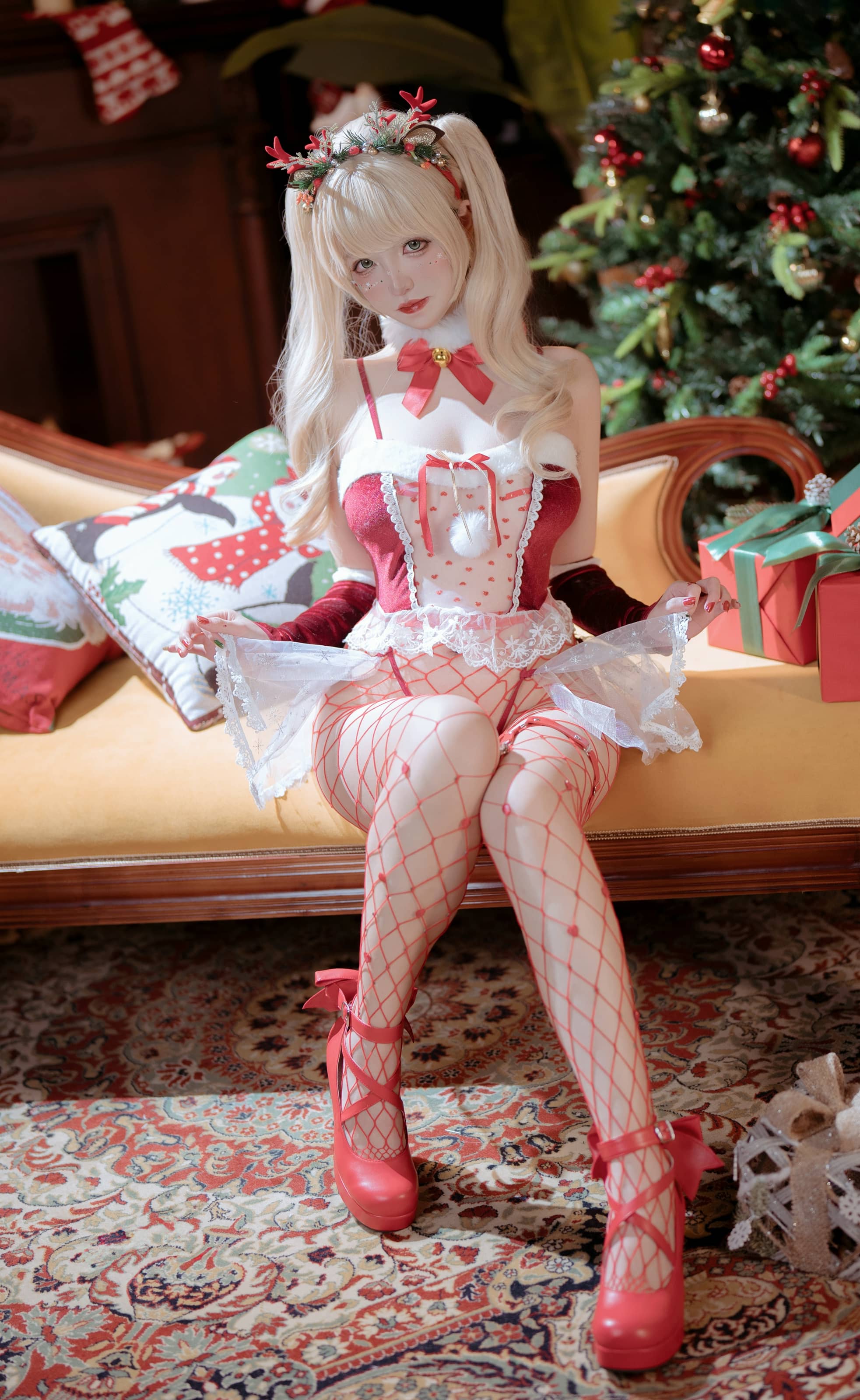 本次拍摄的核心主题围绕着“温暖”与“梦幻”展开。造型团队为阿薰kaOri准备了多套风格各异的服装。主打的是一件正红色的丝绒连衣短裙,经典的圣诞色彩衬托出她白皙的肌肤,泡泡袖与收腰设计兼具复古与甜美。另一套则是毛茸茸的白色针织毛衣搭配格纹短裙,营造出居家般的 cozy 感。此外,还有一套点缀着雪花与星星图案的浅蓝色纱裙,宛如从冰雪童话中走出的精灵。化妆师着重打造了清透无瑕的底妆,眼妆部分运用了金棕色调的眼影,并点缀了细碎的亮片,模仿雪花闪烁的效果。腮红横扫在苹果肌,带来被冬日冷风轻拂后的自然红润。唇妆则以水润的草莓红或温柔的豆沙色为主,整体妆容干净而富有节日气息。