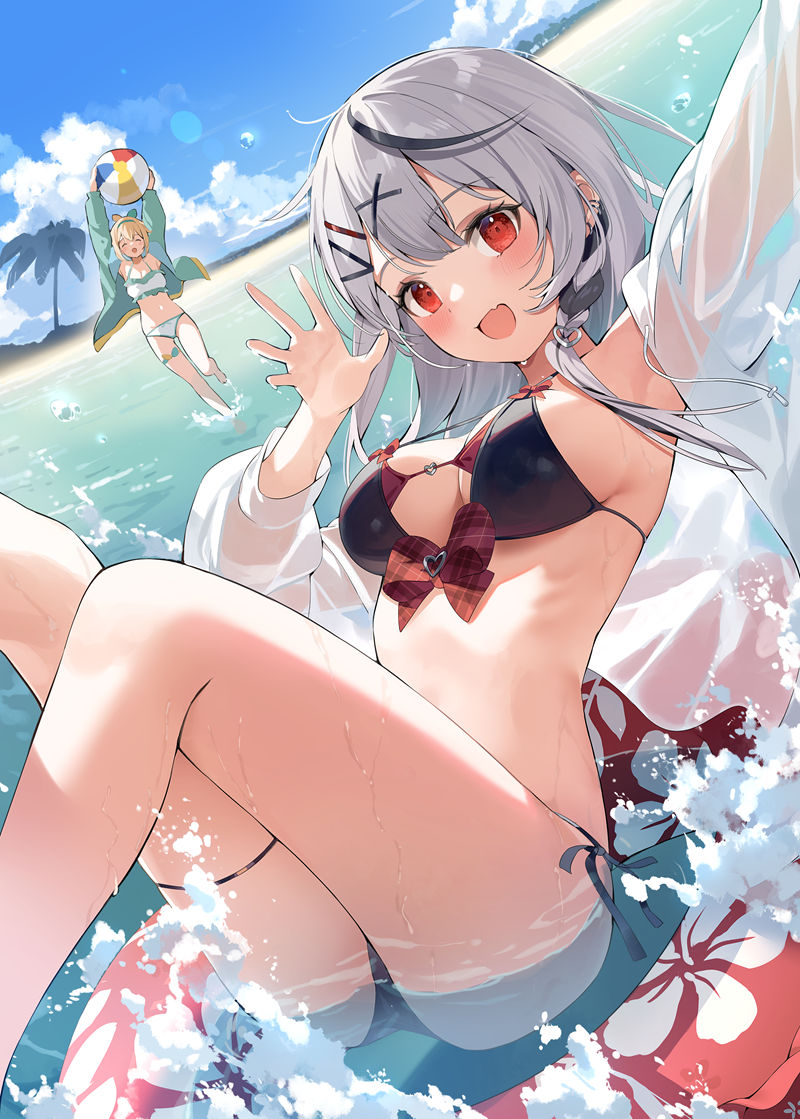 画师はな森(Hanamori)的PSD源文件提供了一套动漫角色海滩场景的完整图层,包含细节和差分元素。场景聚焦金发高马尾的はな森角色,佩戴绿色发带,身着浅蓝色比基尼与绿色开衫,在波浪中半蹲微笑,背景有棕榈树、蓝天白云及远处骑冲浪板的女性角色,营造活泼青春的夏日氛围。文件在PHOTO SHOP CC2023测试正常,适用于数字艺术创作者进行图层编辑或绘画参考。