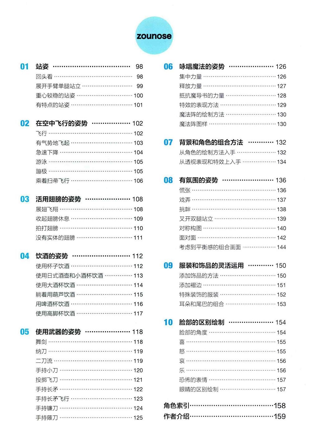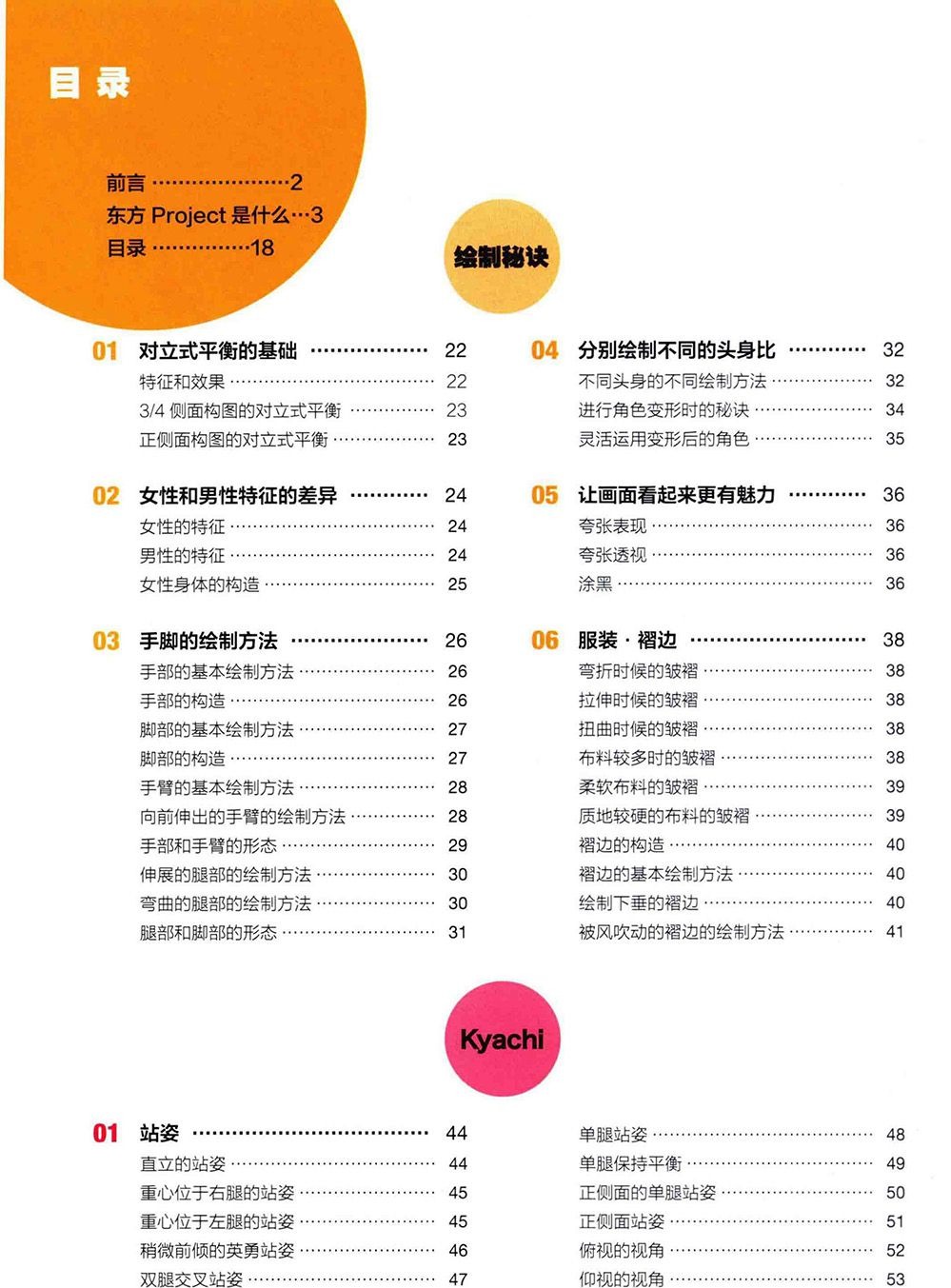 在《当东方Project遇上手绘:零基础学东方角色动态画法》中,kyachi、zounose 两位Pixiv人气绘师毫无保留地向大家介绍东方Project角色动态造型的画法。首先综合讲解了绘制动态造型的秘诀,包括对立式平衡构图的基础、男女特征的差异等,从基础知识讲起,为下一步学习建立基础;然后两位绘师以东方Project角色为例,分别为大家解析了漫画角色动态造型的画法,包括常见的站姿、坐姿、行走、跑步等姿势,然后为大家解读脸部的绘制秘诀、使用武器的姿势、背景和角色的组合方法、服装和饰品的灵活运用等。全方位揭秘漫画角色的动态画法