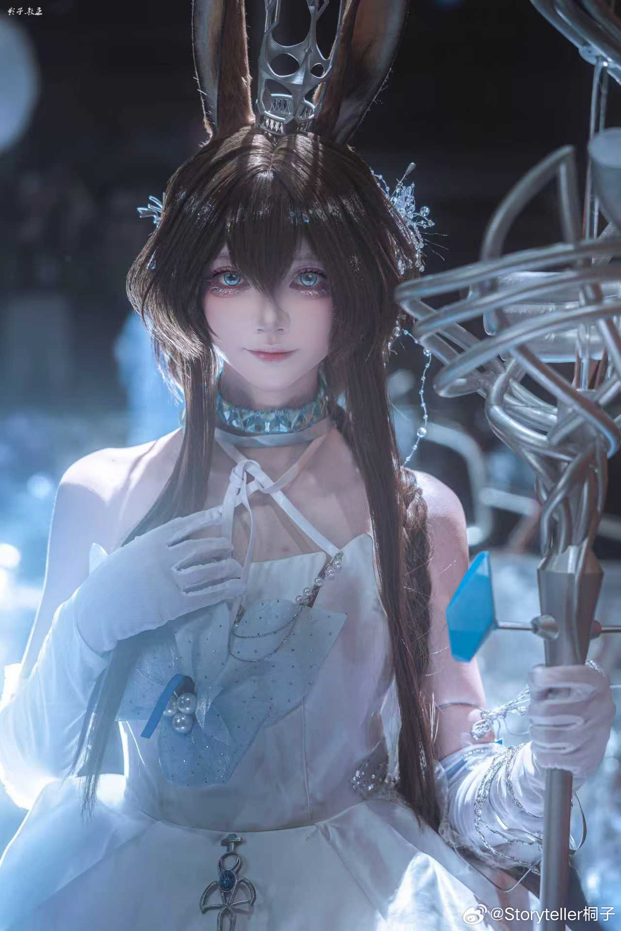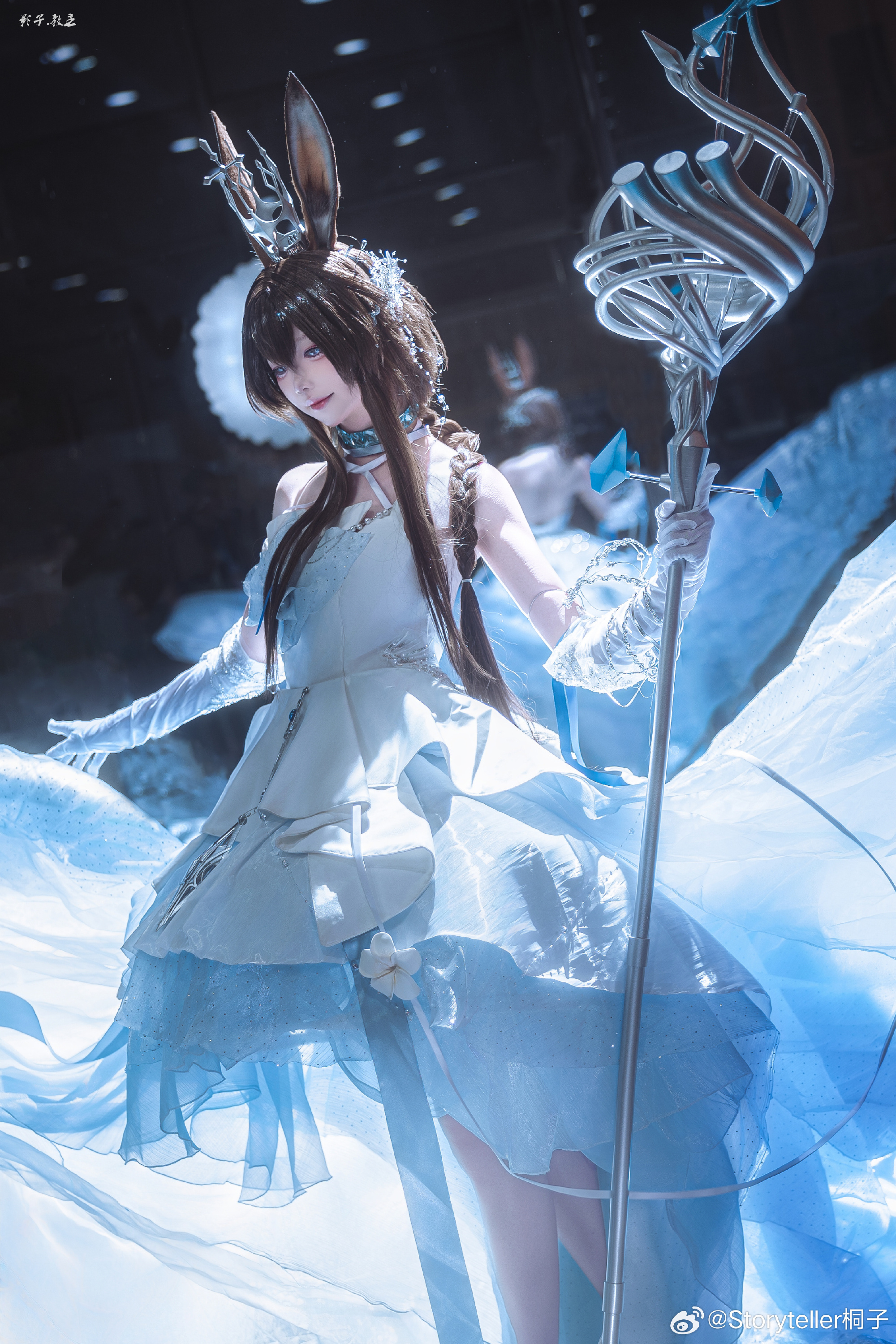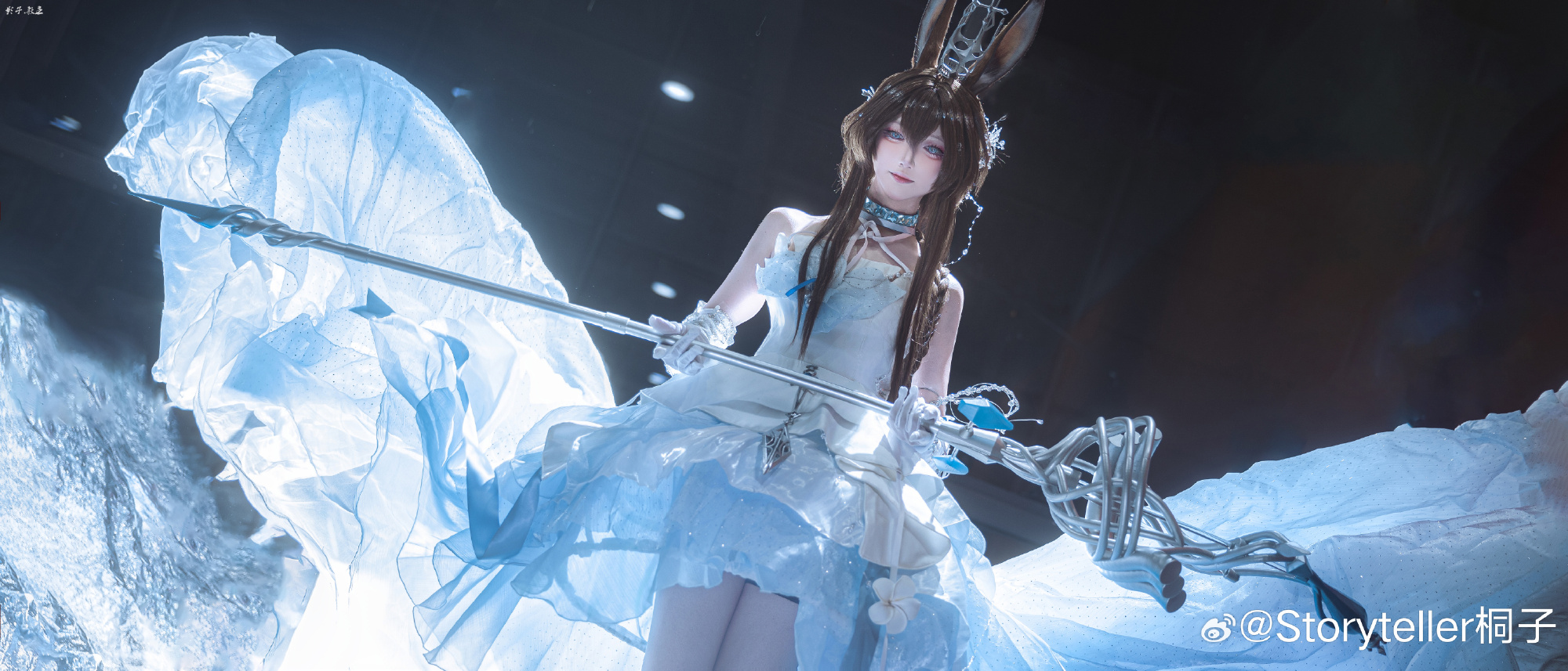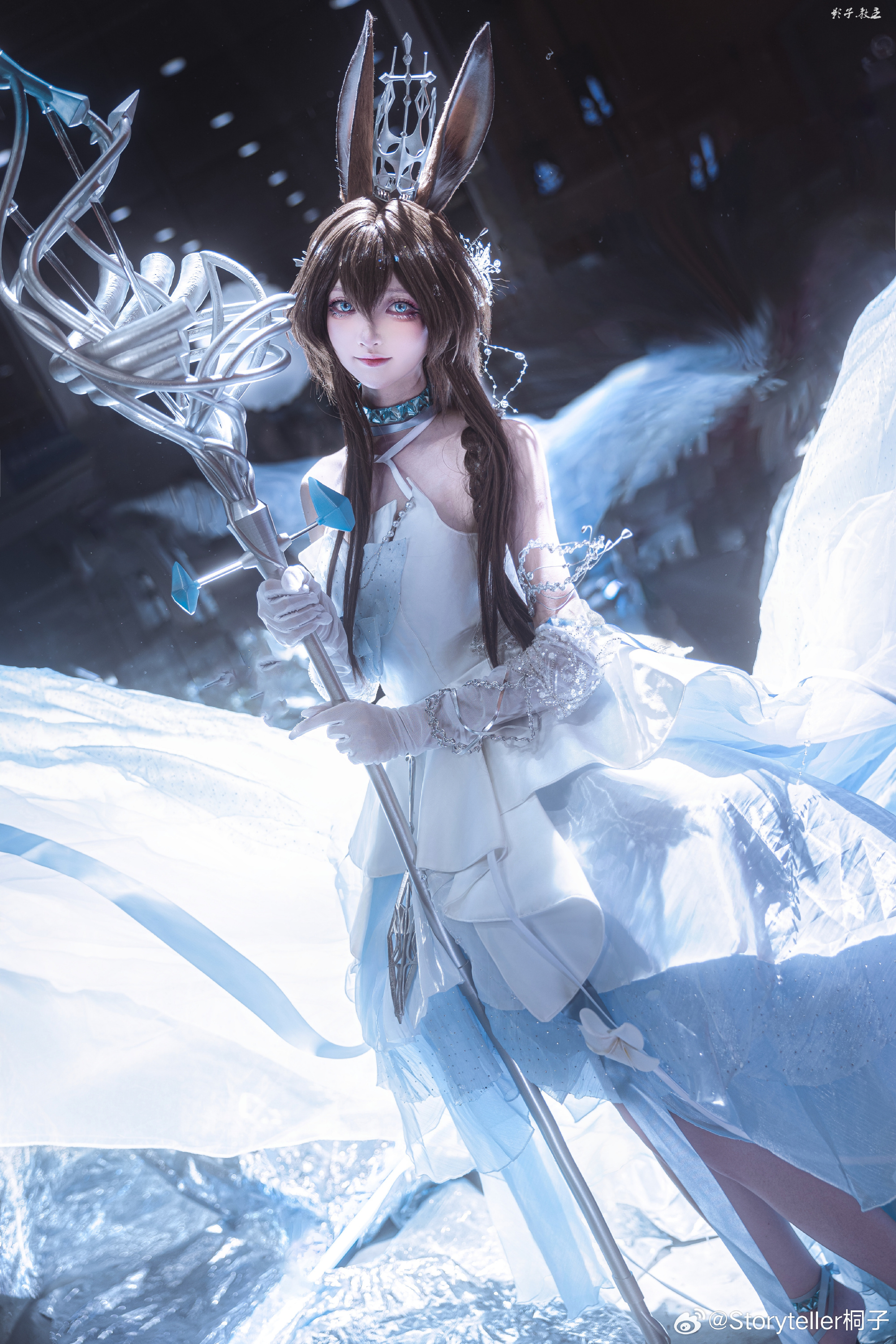 Coser桐子于萤火虫漫展呈现《明日方舟》阿米娅"时序花圃"造型,精准还原角色兔耳、项圈与蓝白裙装标志性特征。在摄影师教主Shadow的镜头下,人物通过伸展双手的动态姿态与环绕冰晶光效,生动再现了施展源石技艺的奇幻场景。整体画面突出沉静坚定的神情与清冷氛围,台风天气中仍高质量完成拍摄。