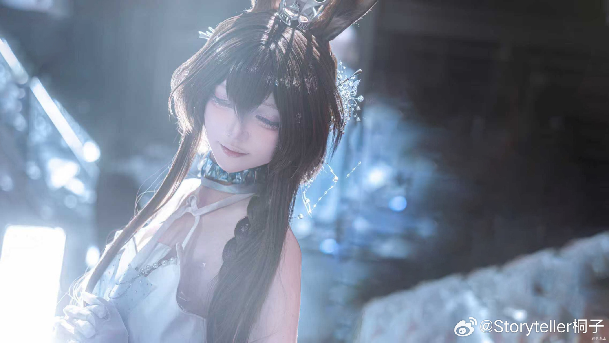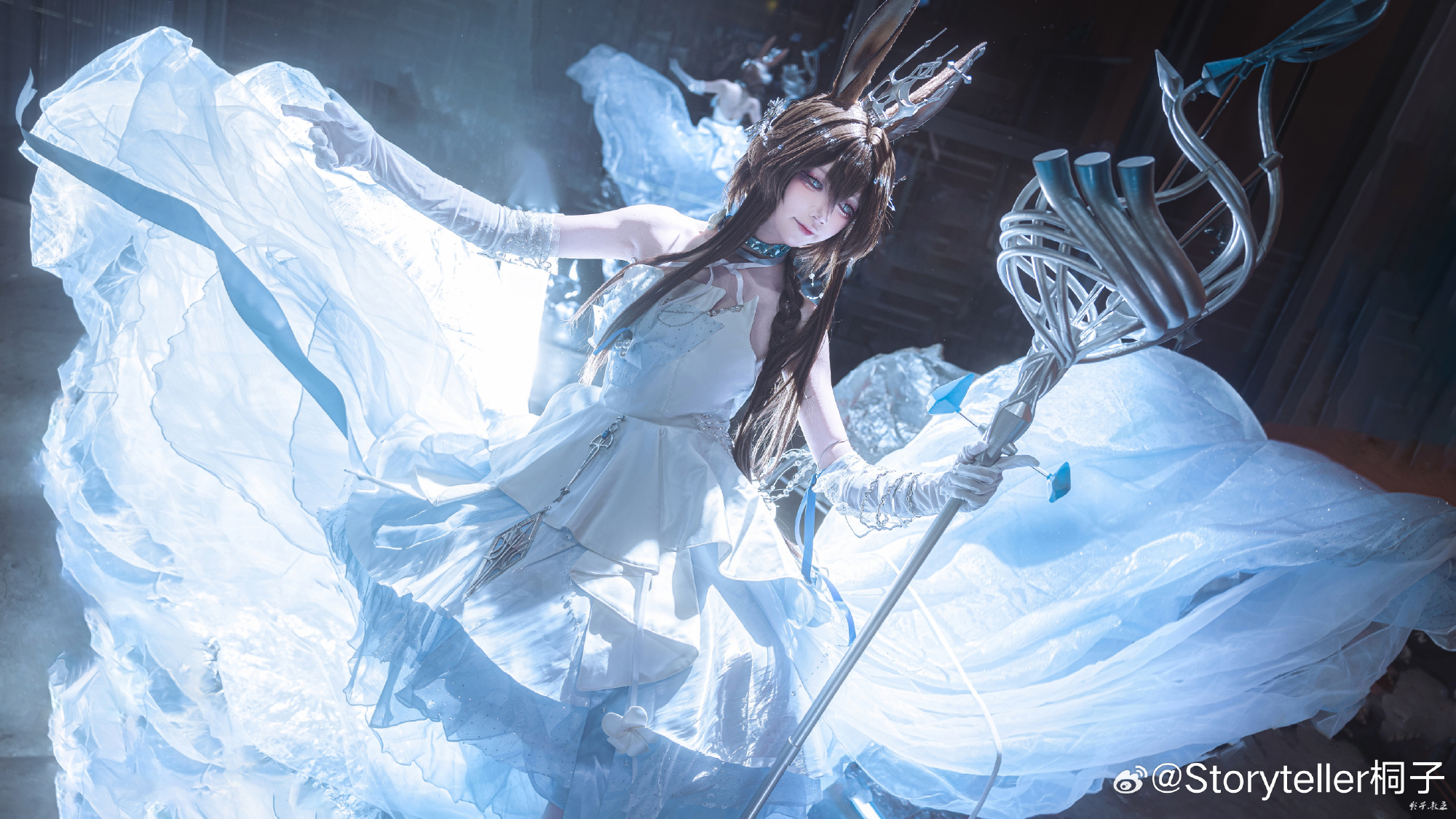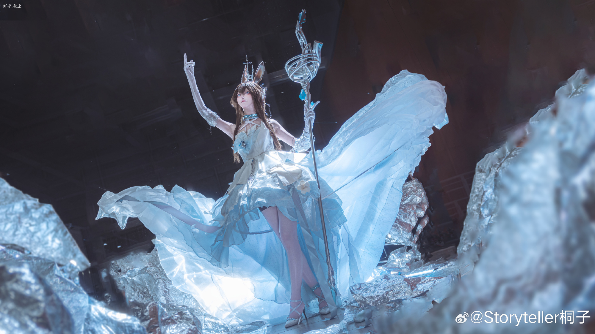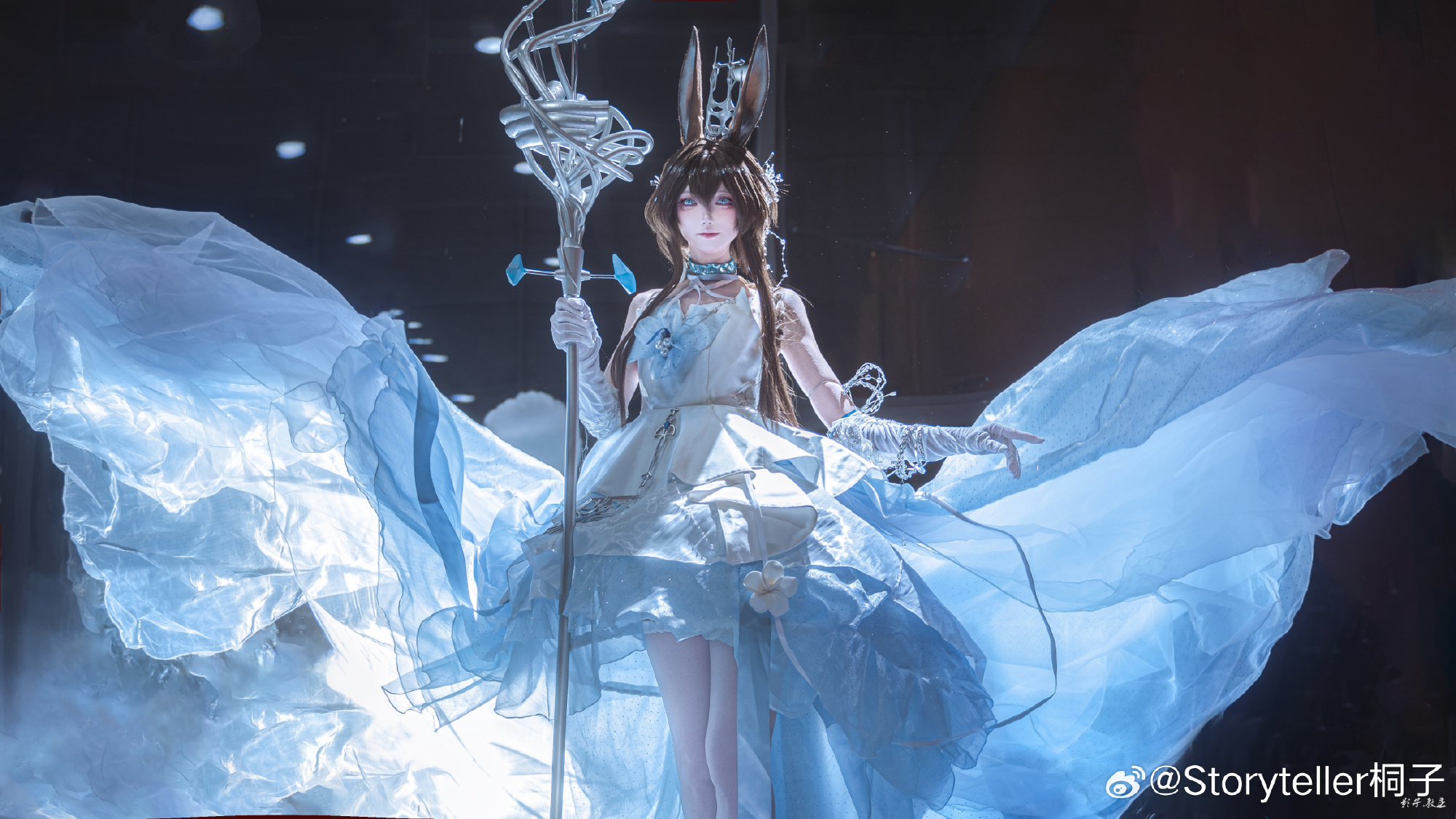 Coser桐子于萤火虫漫展呈现《明日方舟》阿米娅"时序花圃"造型,精准还原角色兔耳、项圈与蓝白裙装标志性特征。在摄影师教主Shadow的镜头下,人物通过伸展双手的动态姿态与环绕冰晶光效,生动再现了施展源石技艺的奇幻场景。整体画面突出沉静坚定的神情与清冷氛围,台风天气中仍高质量完成拍摄。