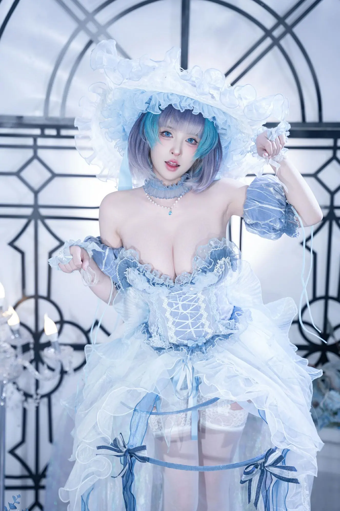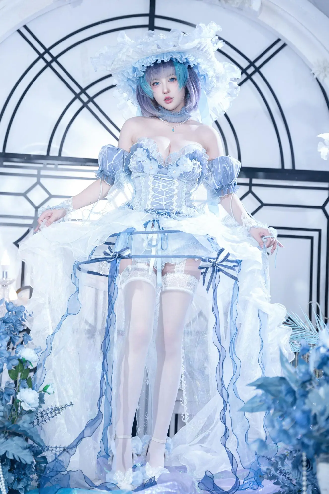 清水由乃演绎《碧蓝航线》柴郡角色的废稿礼服造型,通过蓝白配色的洛丽塔风格礼服精准还原设定细节。其服装包含束腰胸衣、多层纱裙与大型白色蕾丝帽饰,配合蓝紫渐变短发及沉静神态,在简约几何拱门背景下凸显角色优雅梦幻特质。整套作品高度遵循原始废稿设计理念,完整呈现了柴郡未被采用的礼服形象视觉特征。