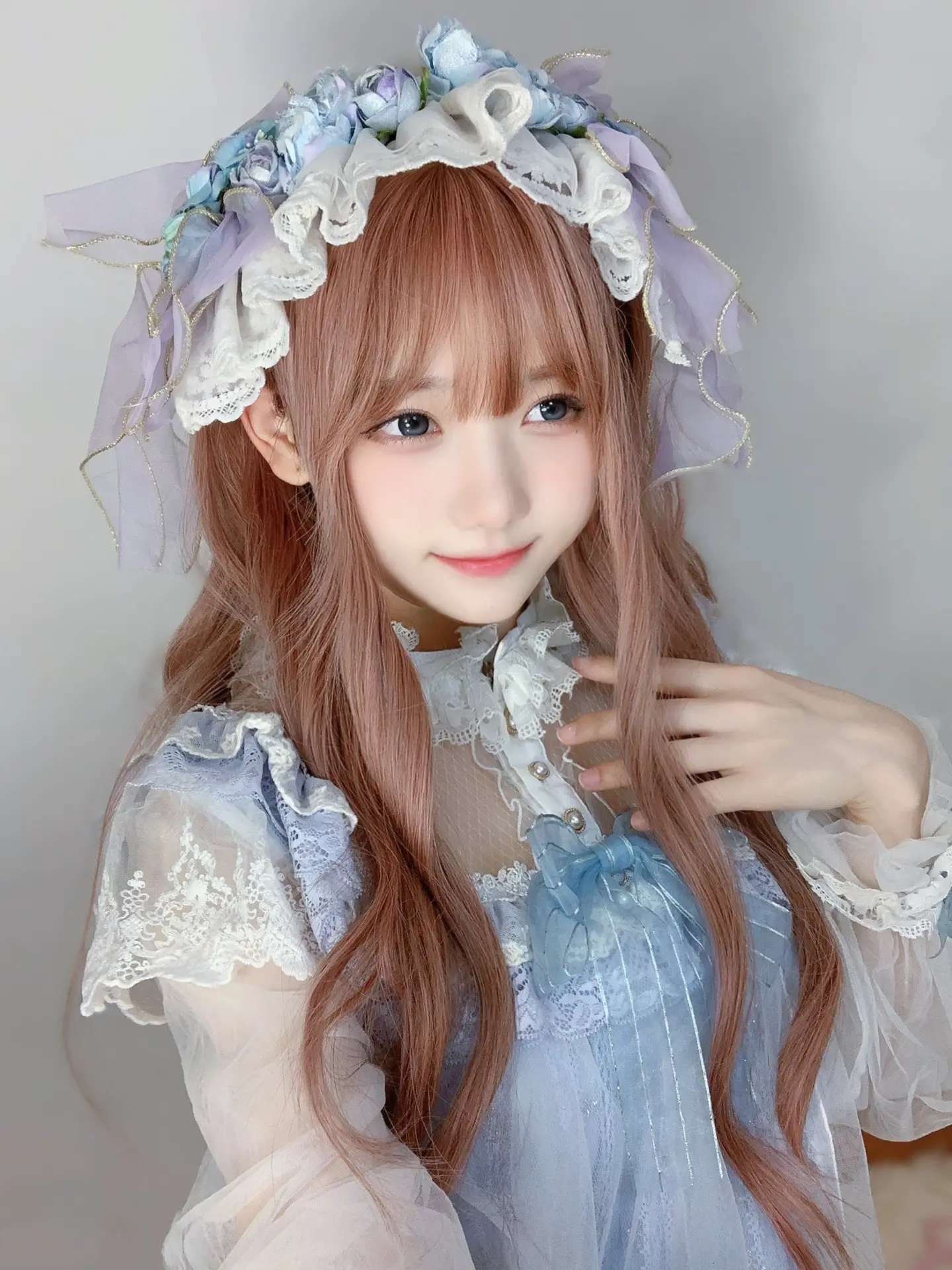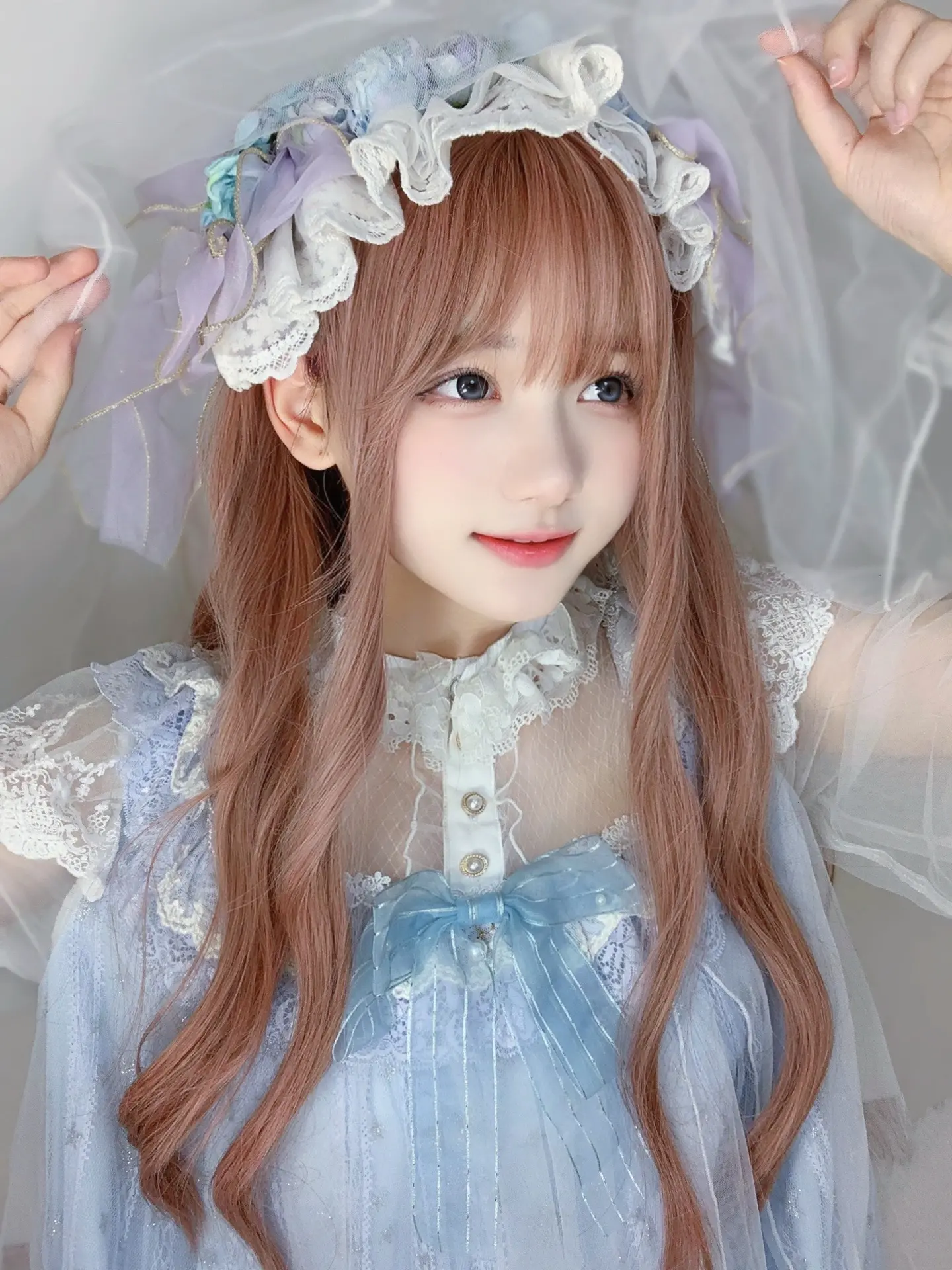 湖北武汉网红女神一只妖妹以其娇小可爱的形象受到关注,身高150cm,体重37kg。她身着梦幻洛丽塔风格婚纱,头戴蓝白蕾丝花环,闭目合掌的造型营造出童话般浪漫静谧的氛围。该形象通过抖音平台(ID:seayoung707)传播,完美呼应了"梦中的婚礼"主题,展现出对爱情与神圣时刻的虔诚期待。