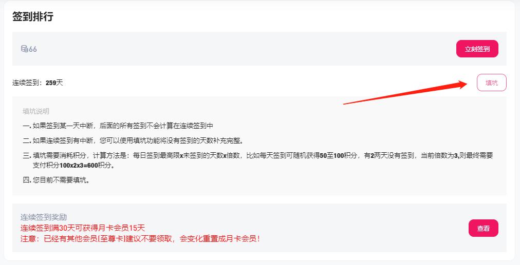 - 如果连续签到有中断,您可以使用填坑功能将没有签到的天数补充完整。