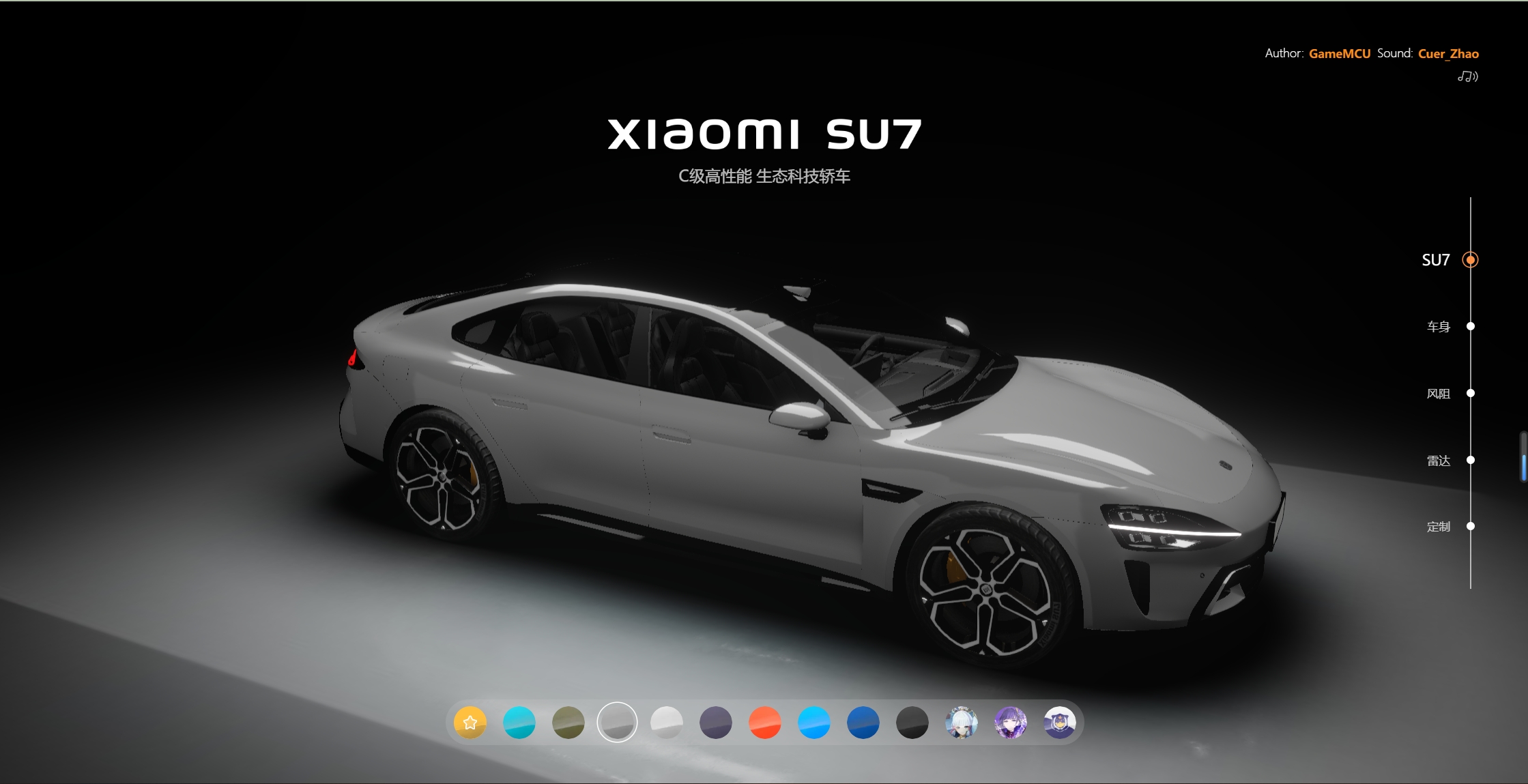 小米SU7汽车在线体验-gamemcu开发的SU7展示网页 每日热搜 7月26日 admin闪亮明星 取消关注 关注 私信 让所有人都能上手体验小米SU7! 小米汽车开卖,b站UP主gamemcu开发了一个h5网页,可以让大家在线体验小米su7汽车。 展示了一些特色,可换漆,还有二次元皮肤,长按屏幕可以模拟启动。 地址:https://gamemcu.com/su7/